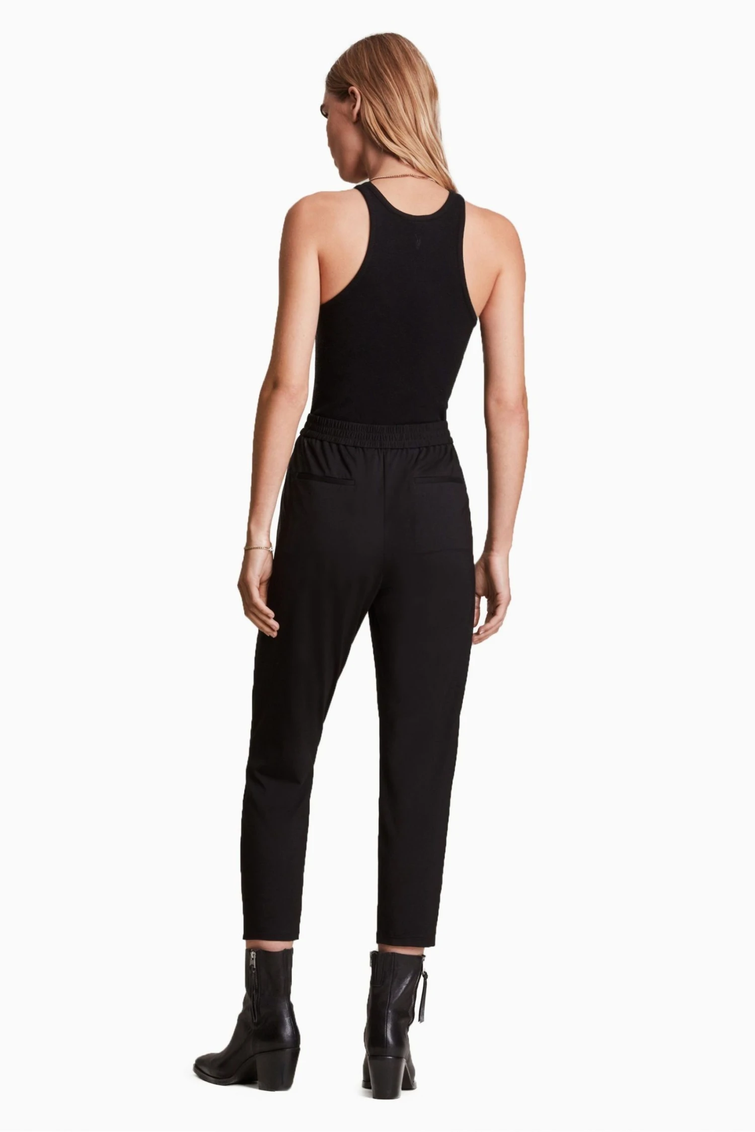 Featuring mid rise, two side pockets, two back pockets, elasticated waist band, fluid fabric and regular fit.