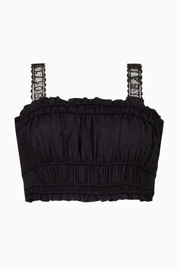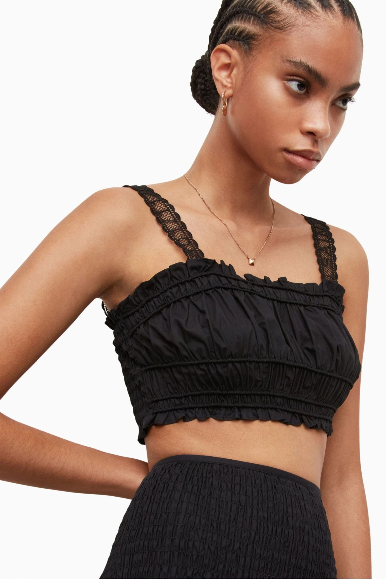 Featuring a pull-over, bodycon fit, mini length, sleeveless, unlined, smocked dress cotton crop top with branded lace straps. Straps have the text “AllSaints 01/ 11/ 94” embroidered in it.