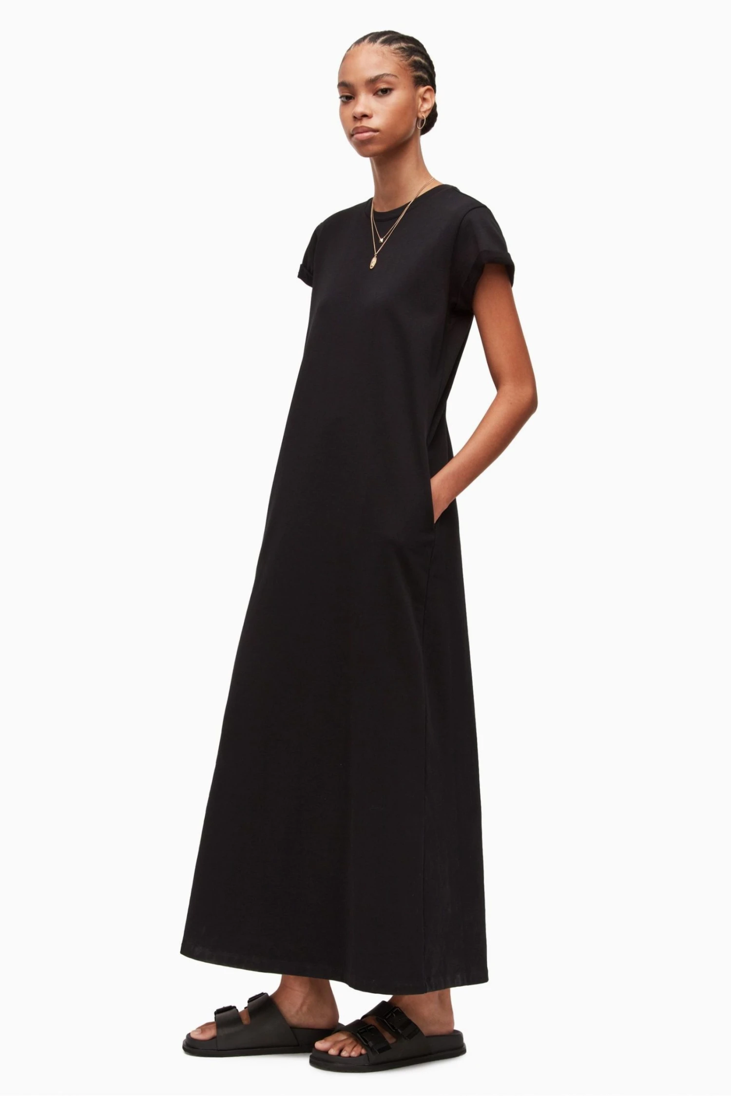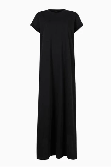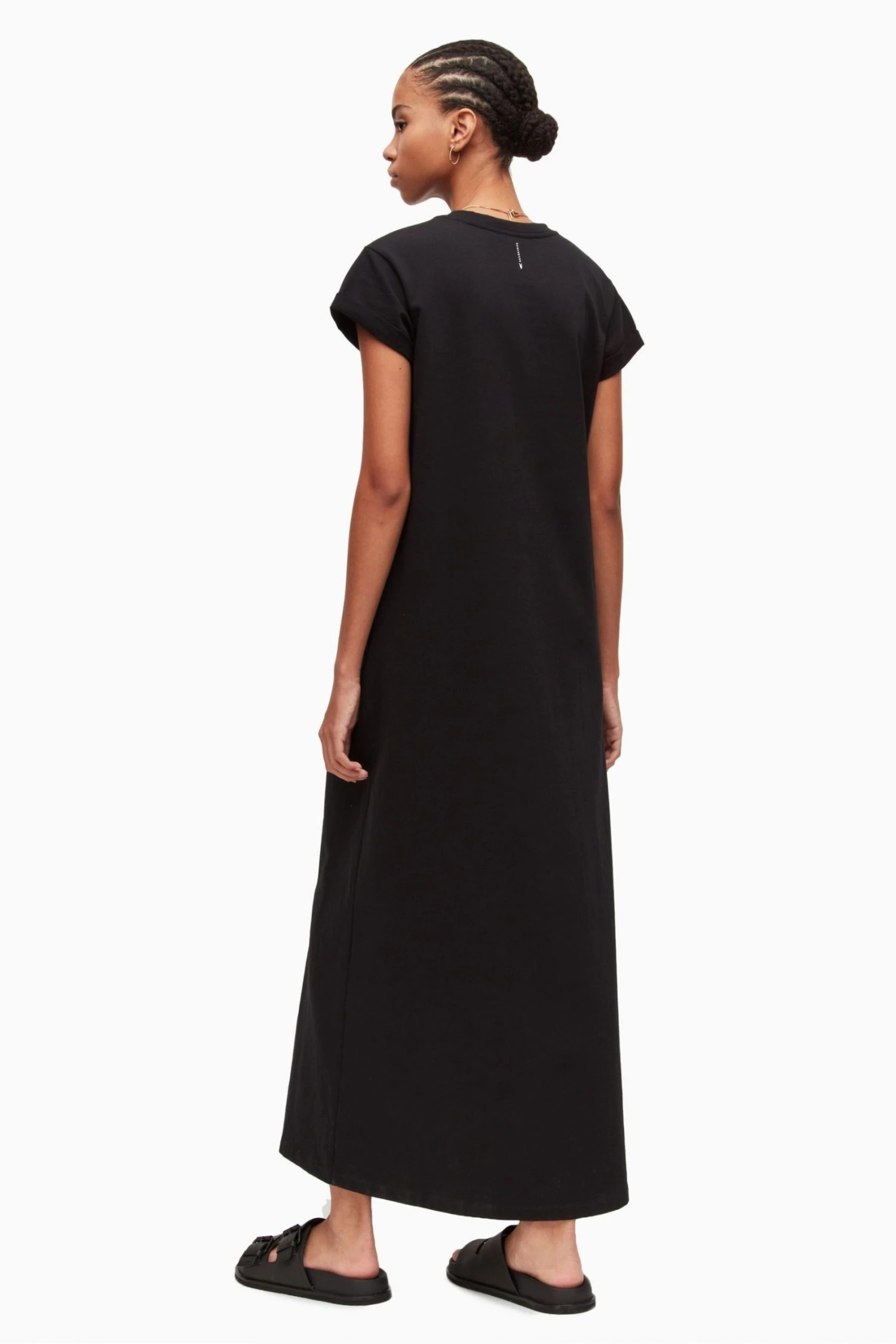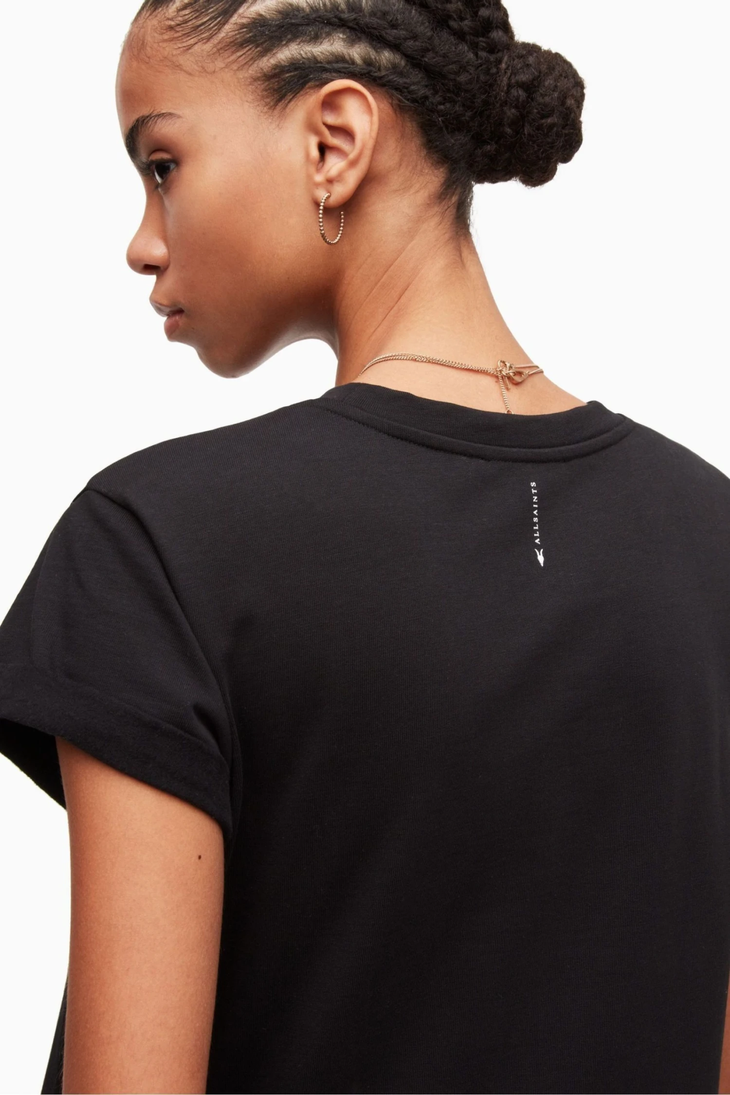 Crew neck short sleeve pullover. Turned up cuffs. AllSaints typography on the back neck. AllSaints cotton products support more sustainable cotton farming. Better Cotton is sourced via a system of Mass Balance. Slim fit.