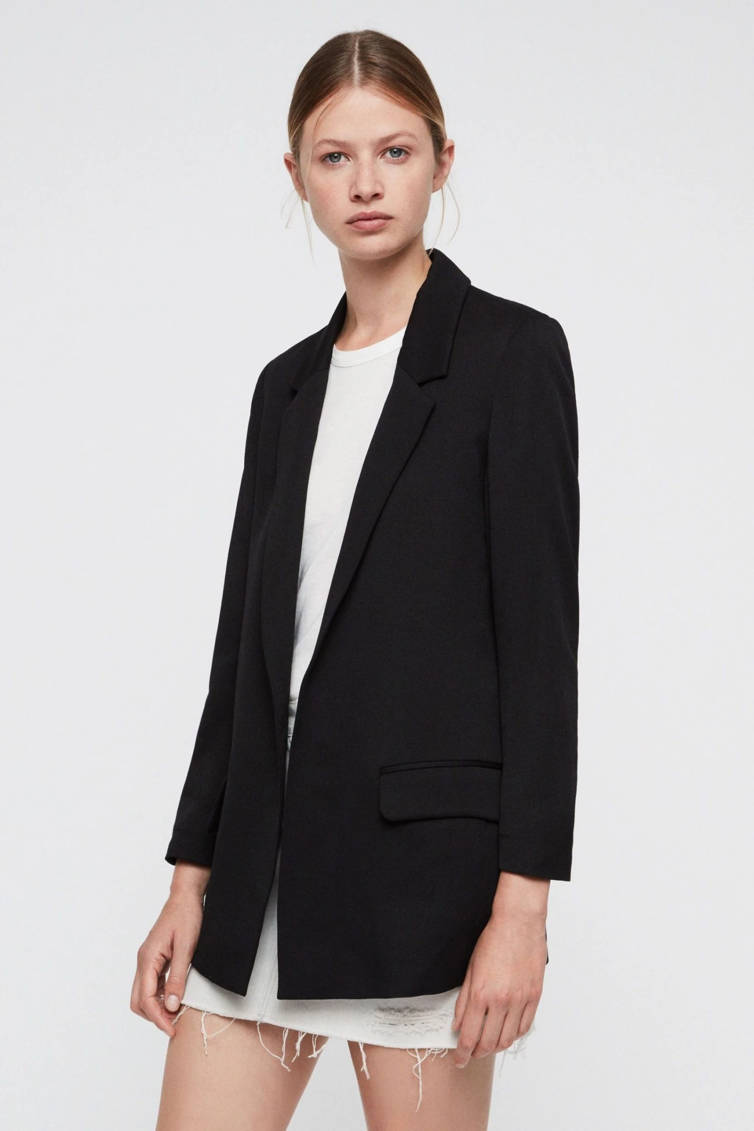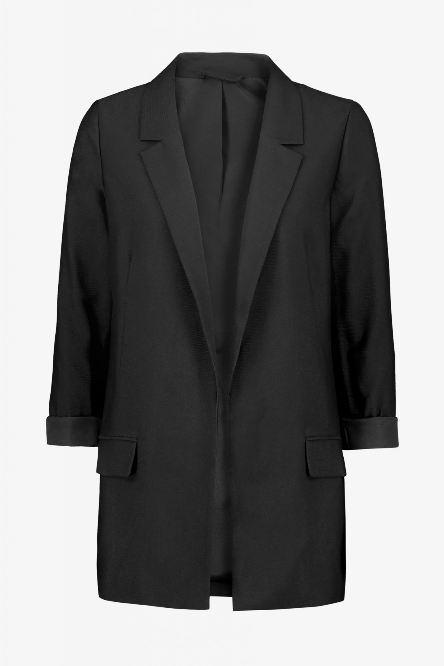 Long sleeve. Notch lapels. Two flap pockets. Open front. Fully lined. Pair with the Aleida Trousers. Recycled fabrics