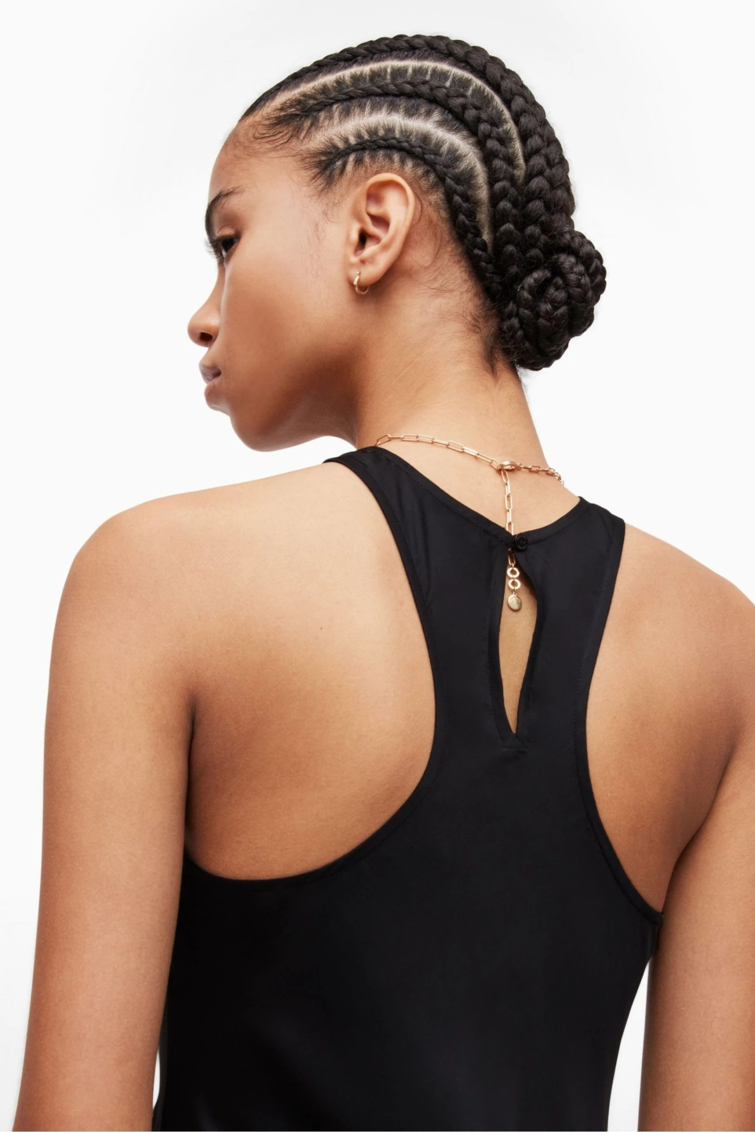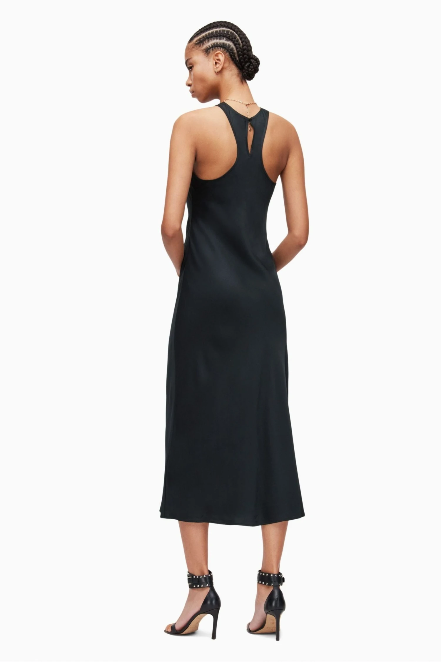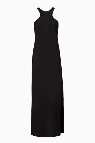 Button closure. Round neck. Sleeveless. Racer neckline slip dress. Long length. Keyhole and button fastening at neck. Slim fit.