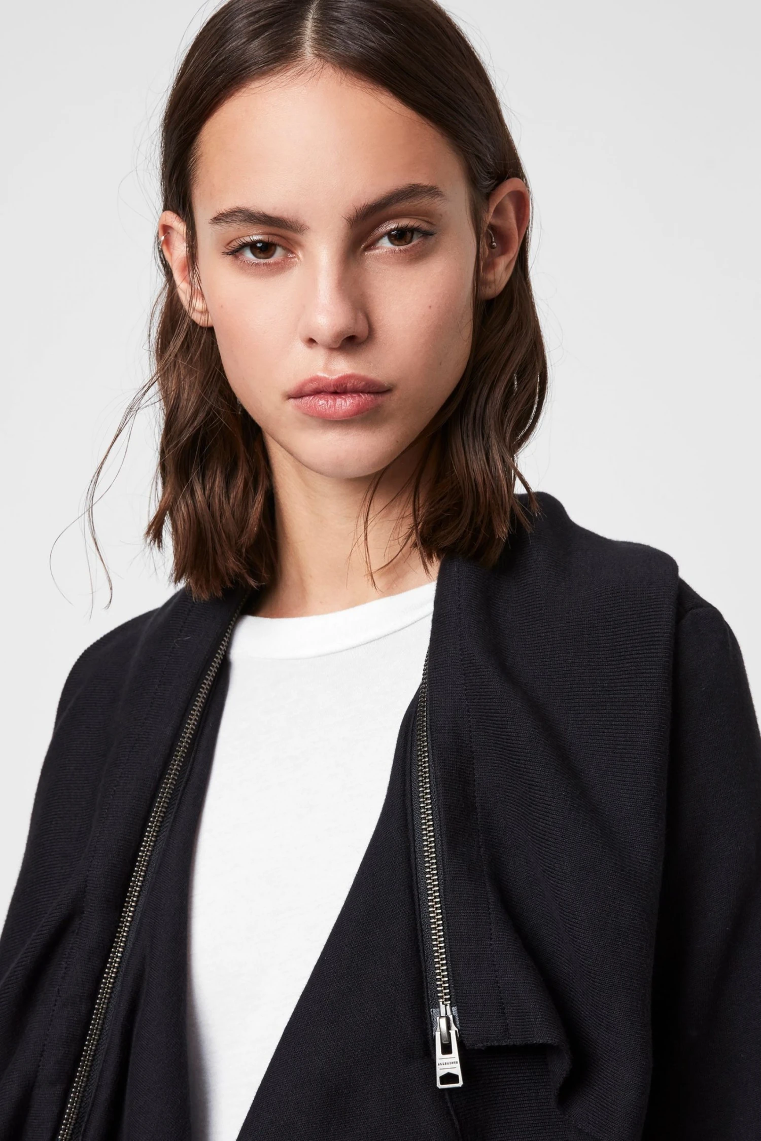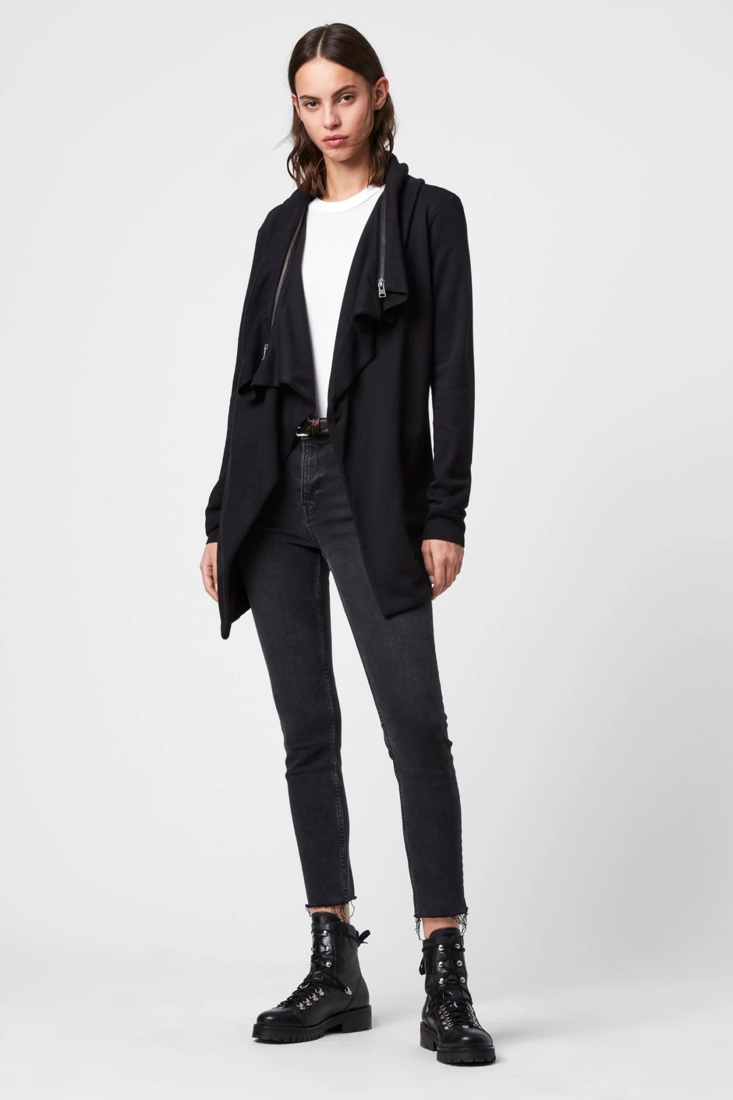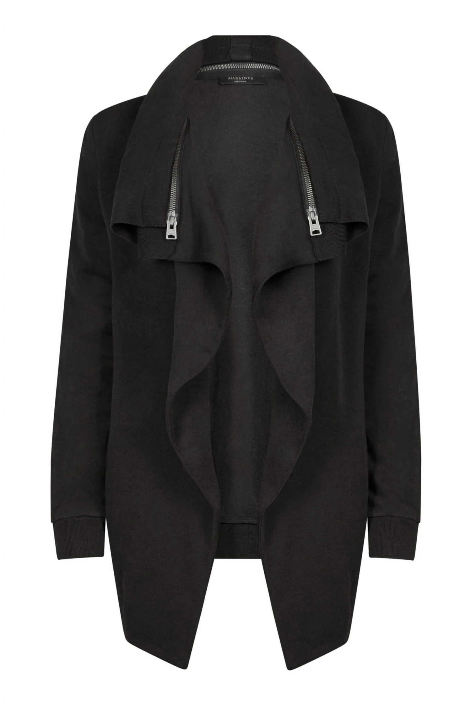 Long sleeve. Open front. Waterfall effect. Ribbed trims. Functional zip on the collar. Loungewear. ALLSAINTS cotton products support more sustainable cotton farming. Better Cotton is sourced via a system of Mass Balance