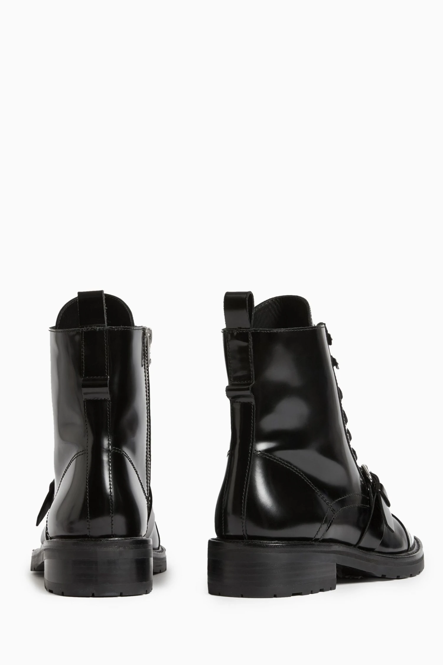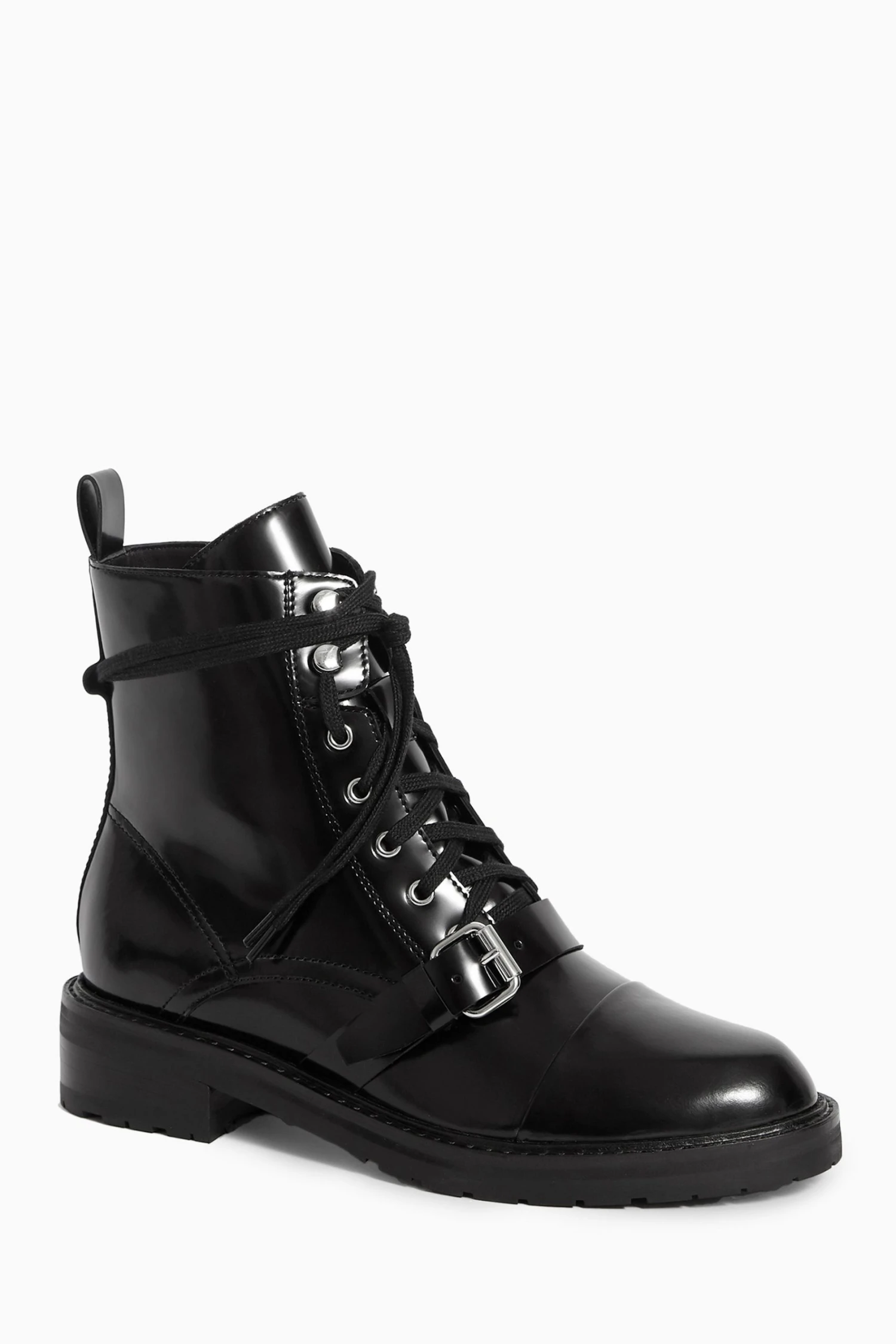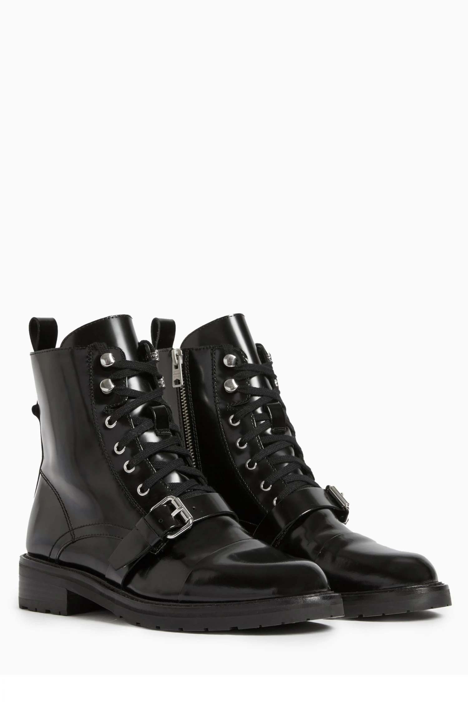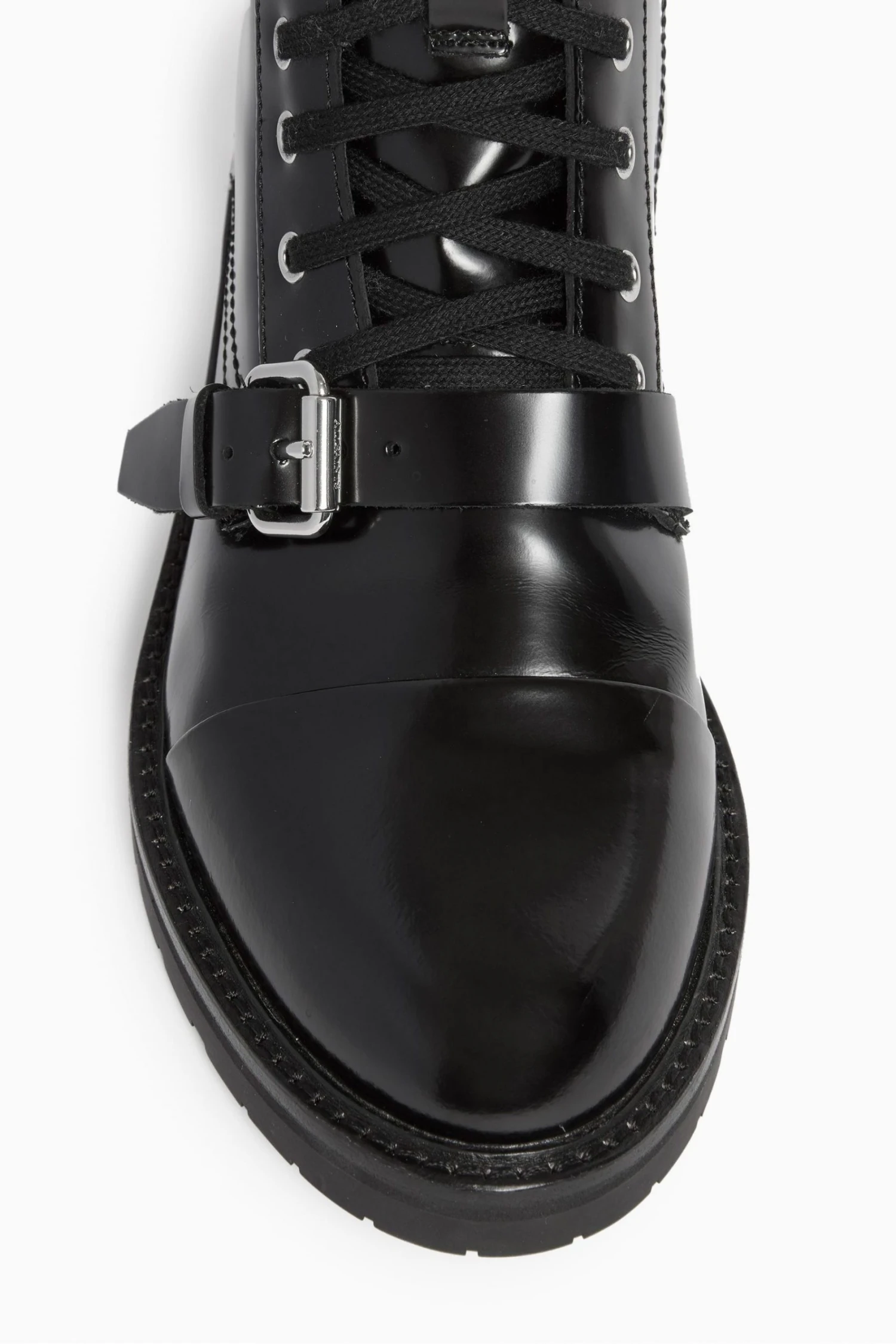 Round toe. Metal eyelets. Rubber tread. Wrap-around laces. Strap across the toe. Leather pull tab