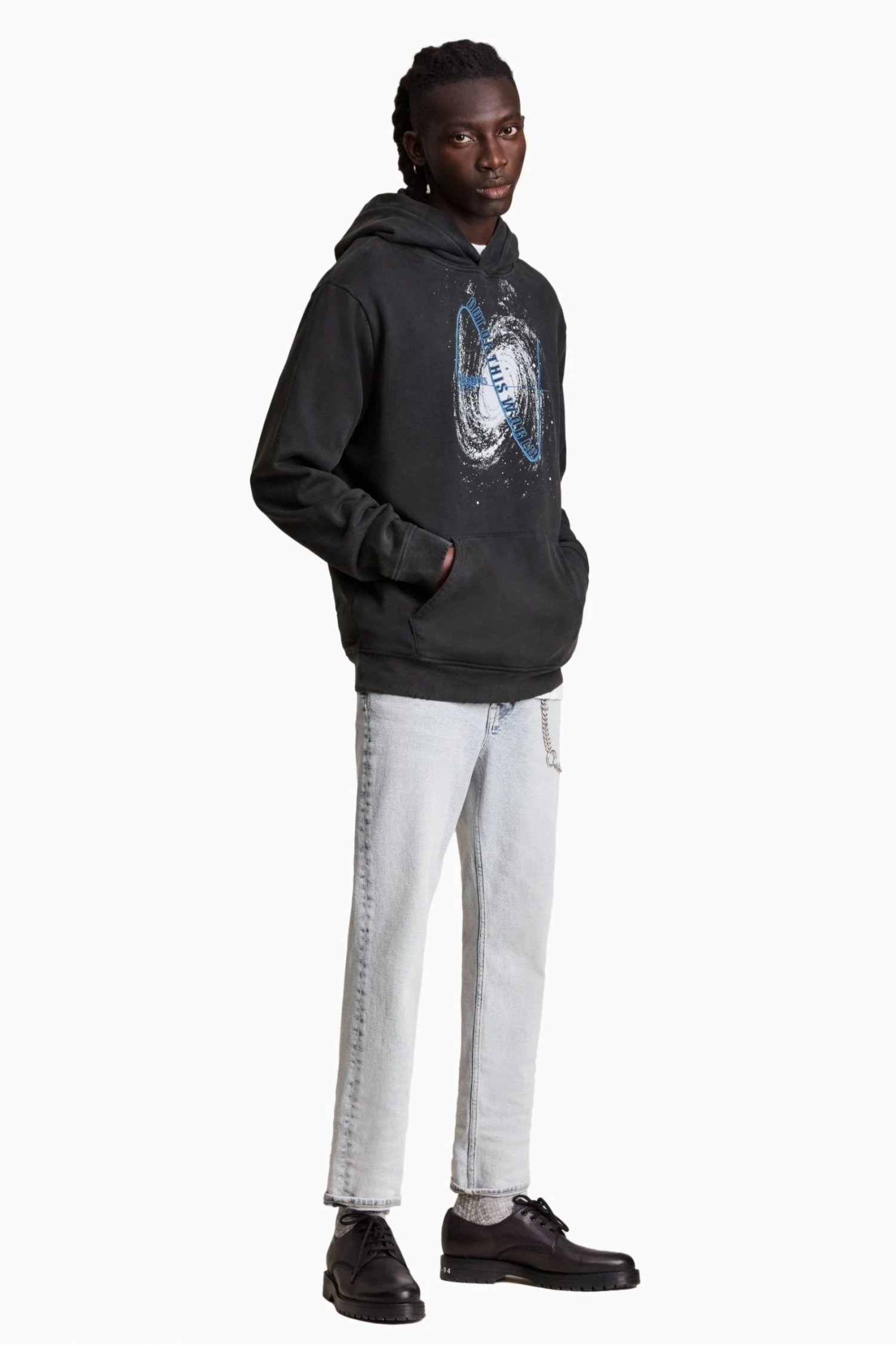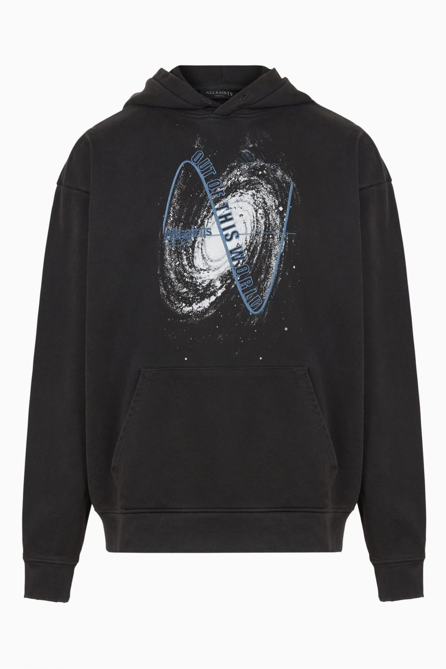 Galactic graphic with branding printed front and back. Hoodie with longsleeve and pullover.