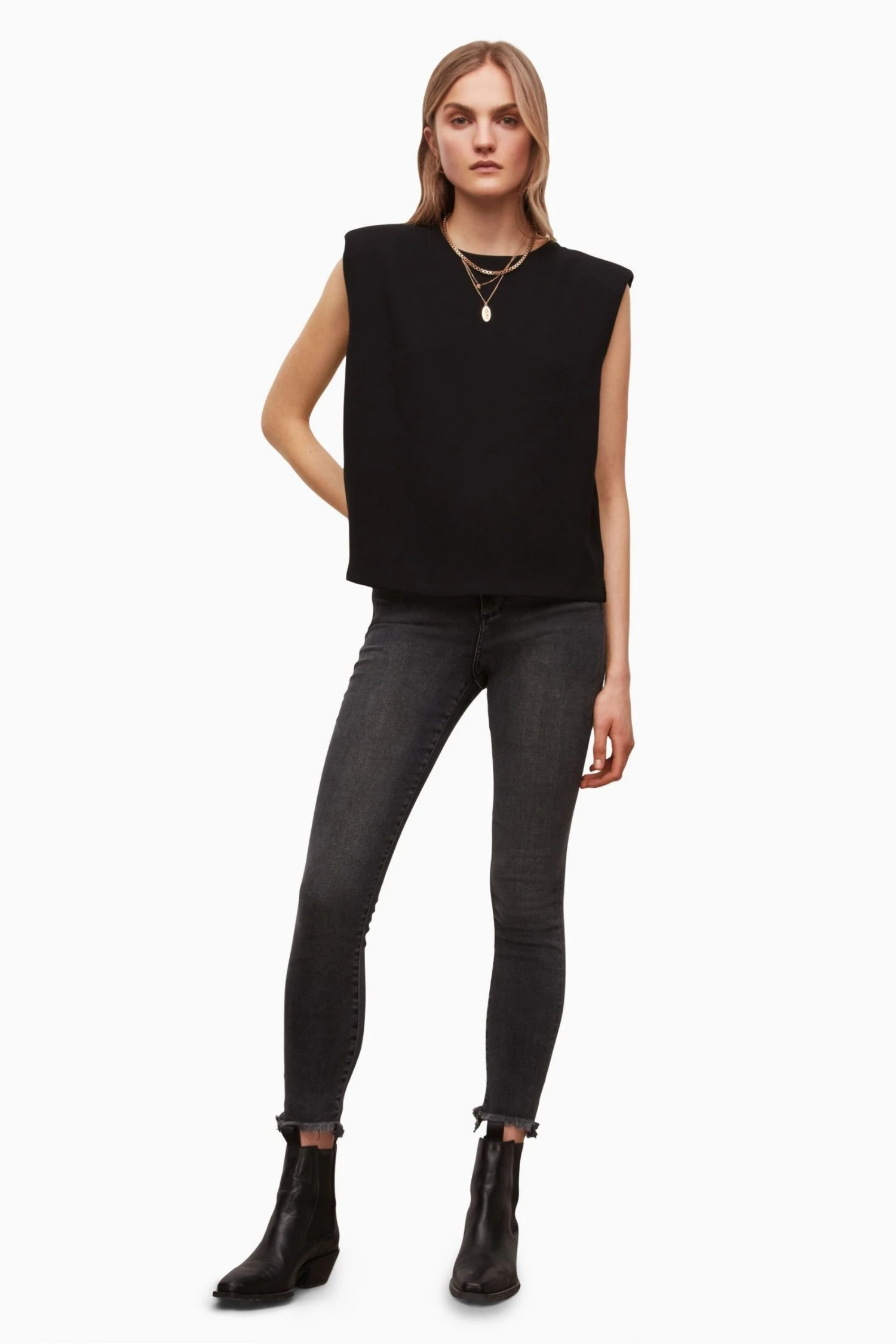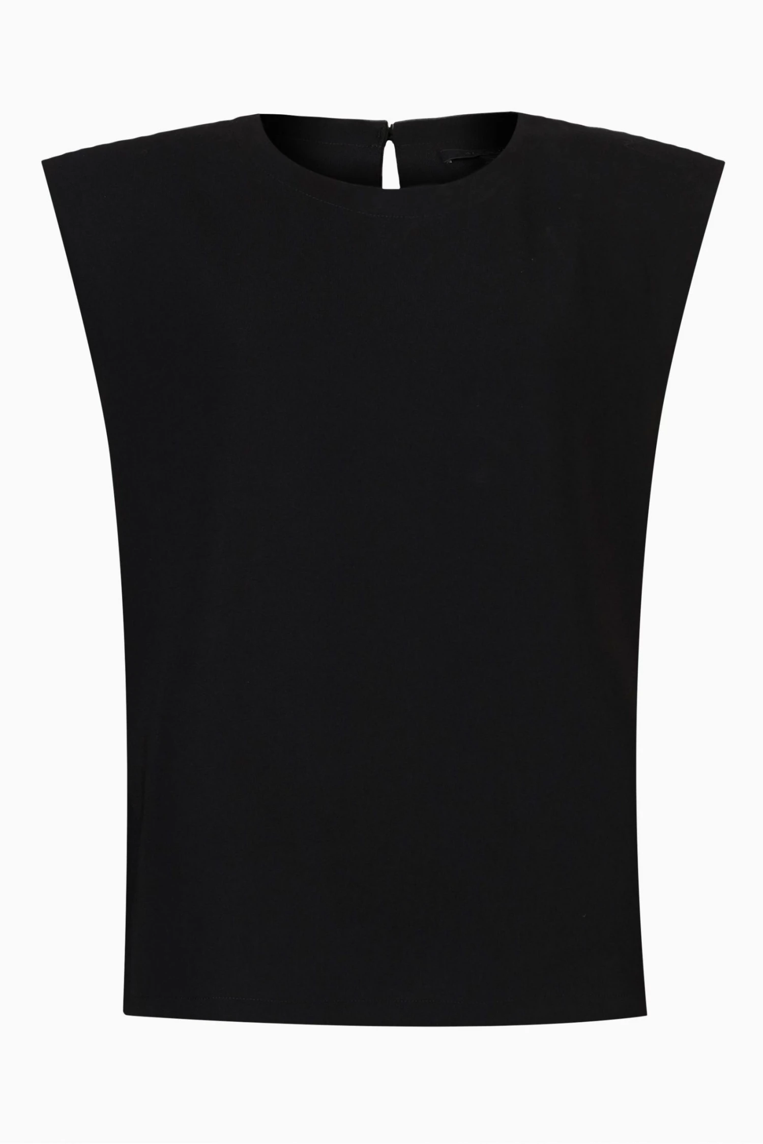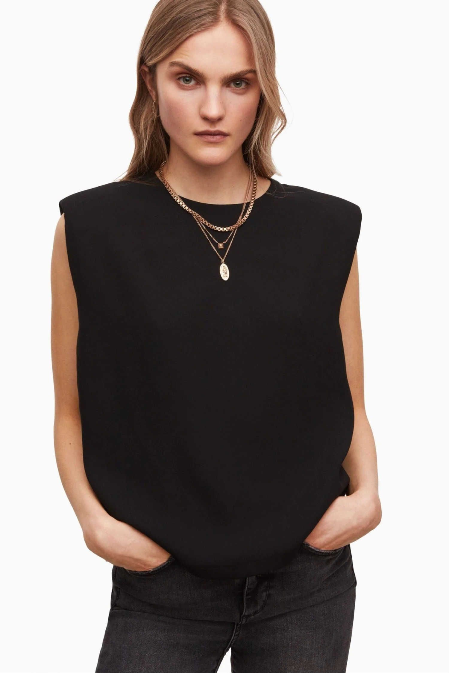 Pull over. Regular fit. Short length. Crew neck. Sleeveless. Easy jersey top with shoulder pads.