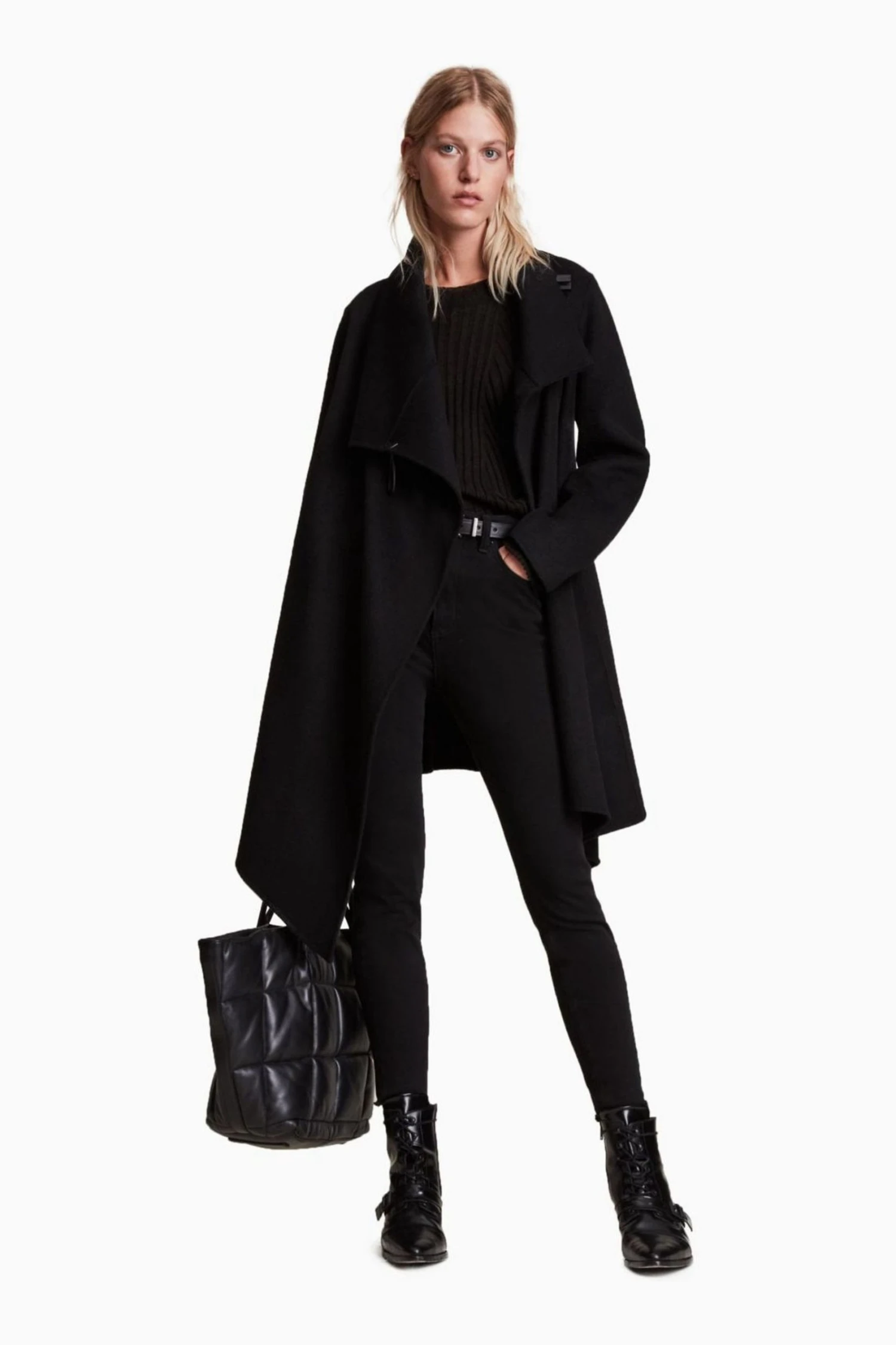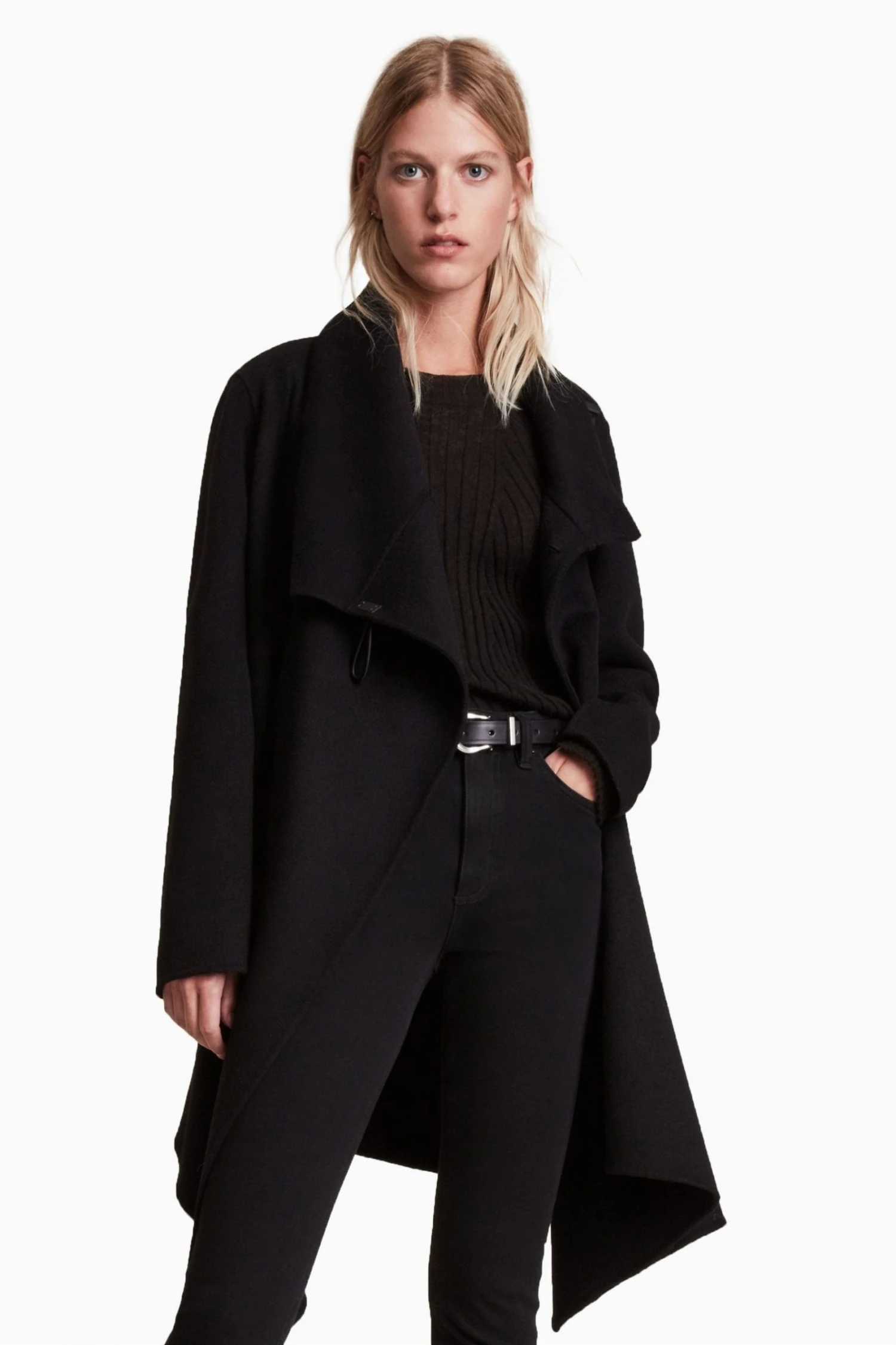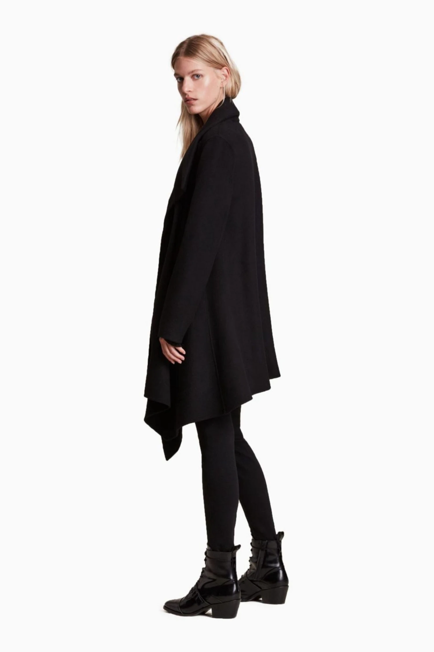 Featuring funnel neck, long sleeve, draped front, asymmetric shape, waterfall front when open, regular fit and metal AllSaints fastner on the shoulder.