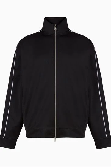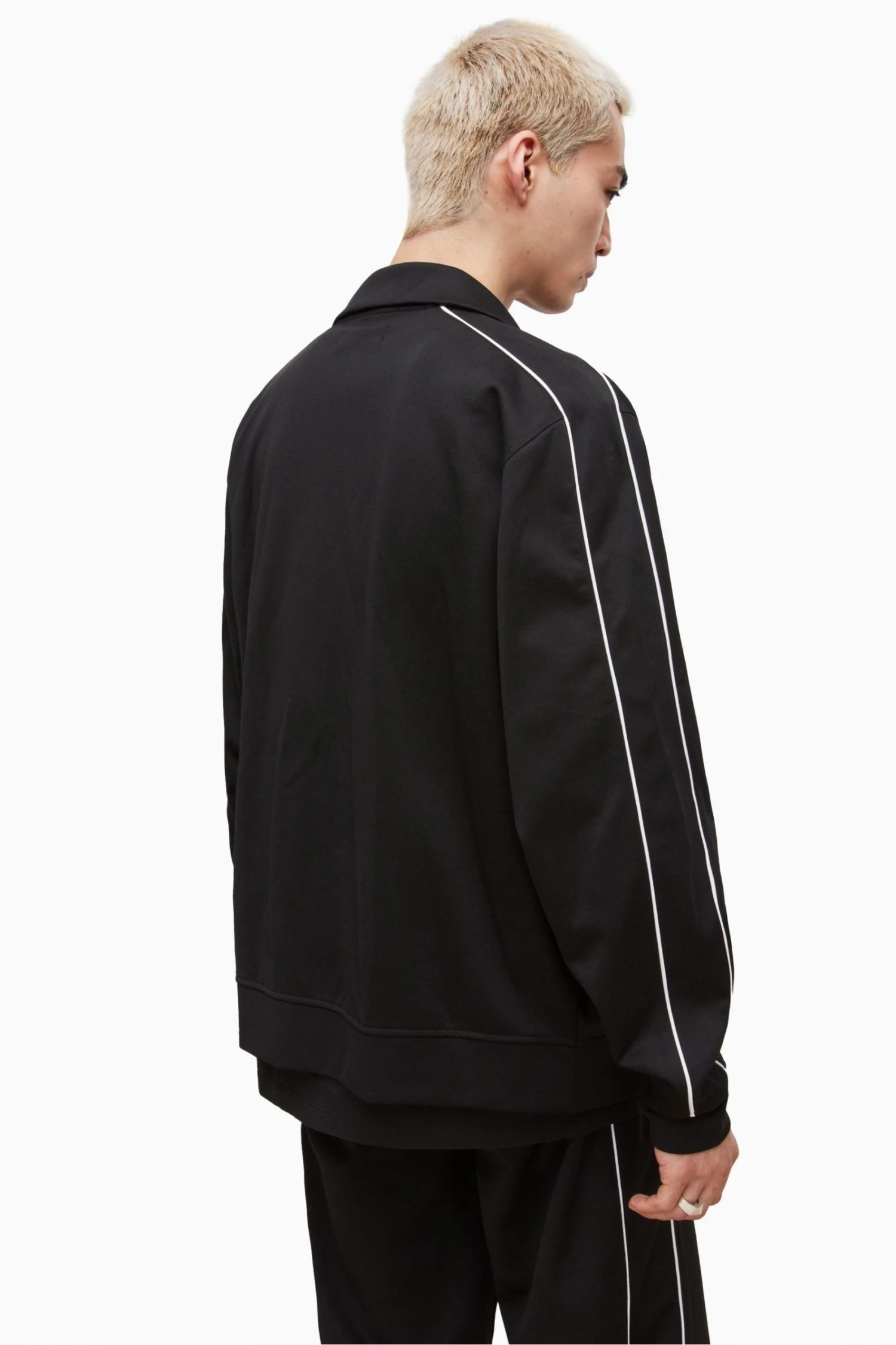 Featuring sleeve panel with contrast colour piping insert, self fabric collar, cuffs and waistband, zip closure, welt pockets, and Ramskull embroidery on left sleeve hem.