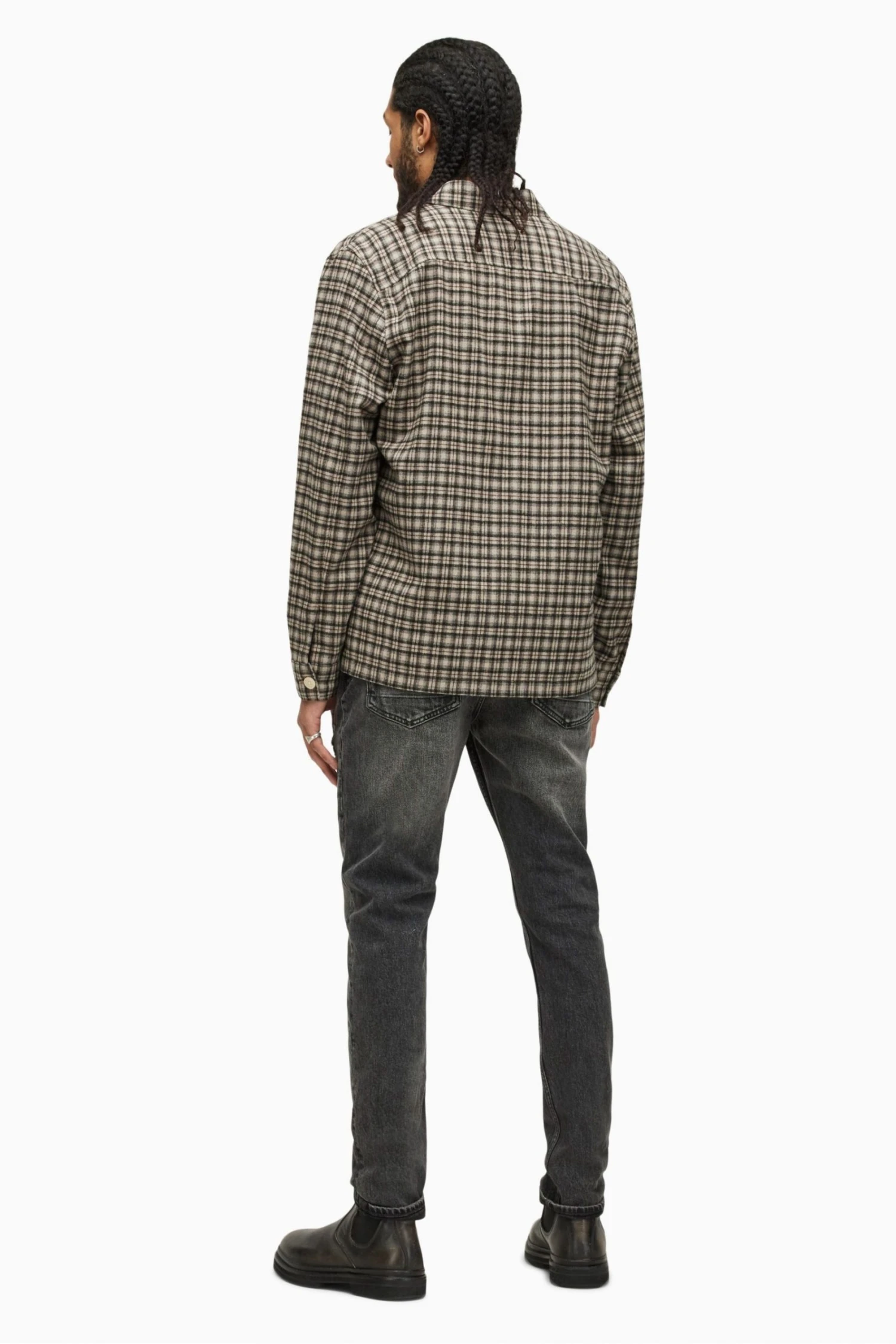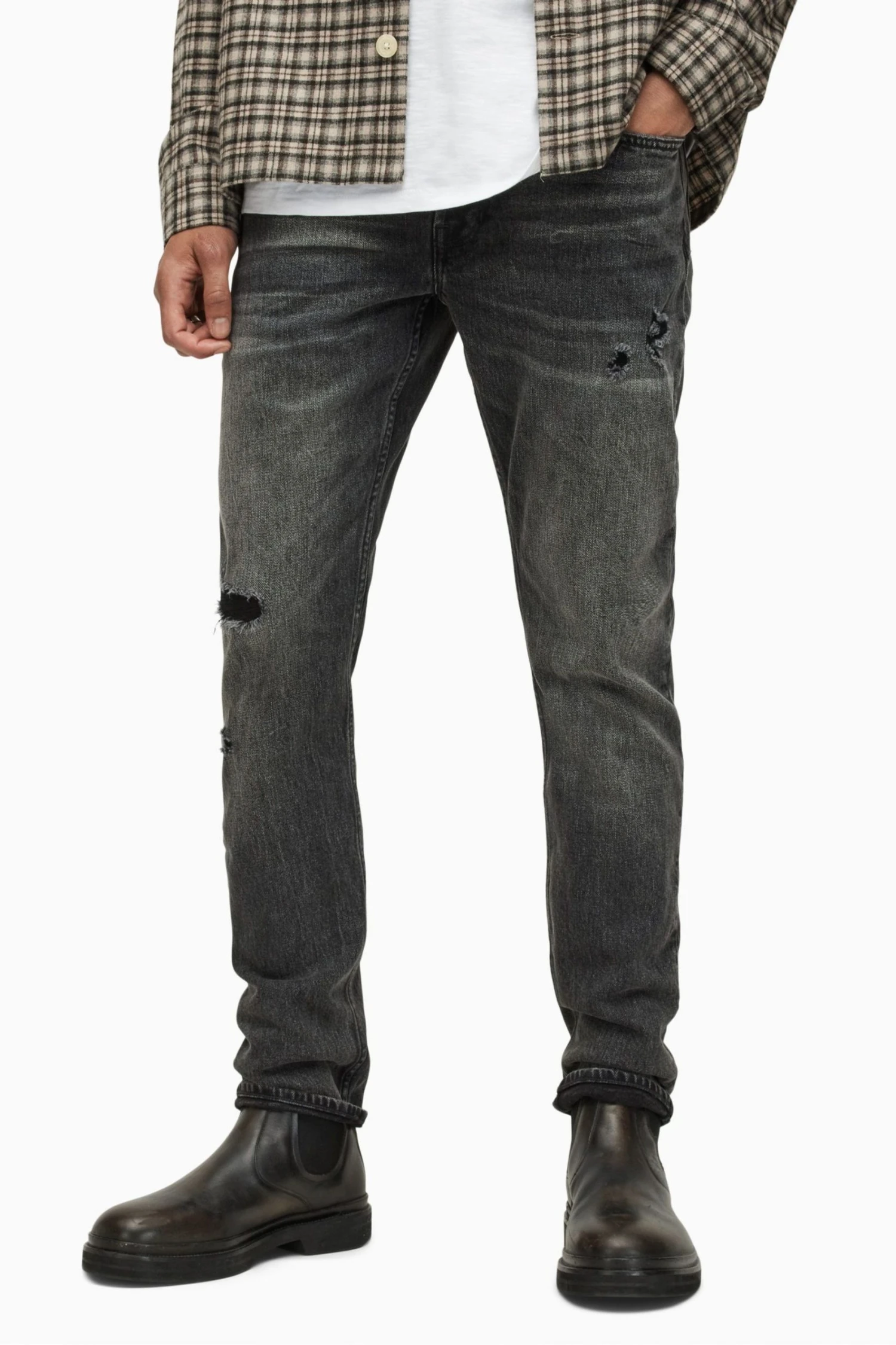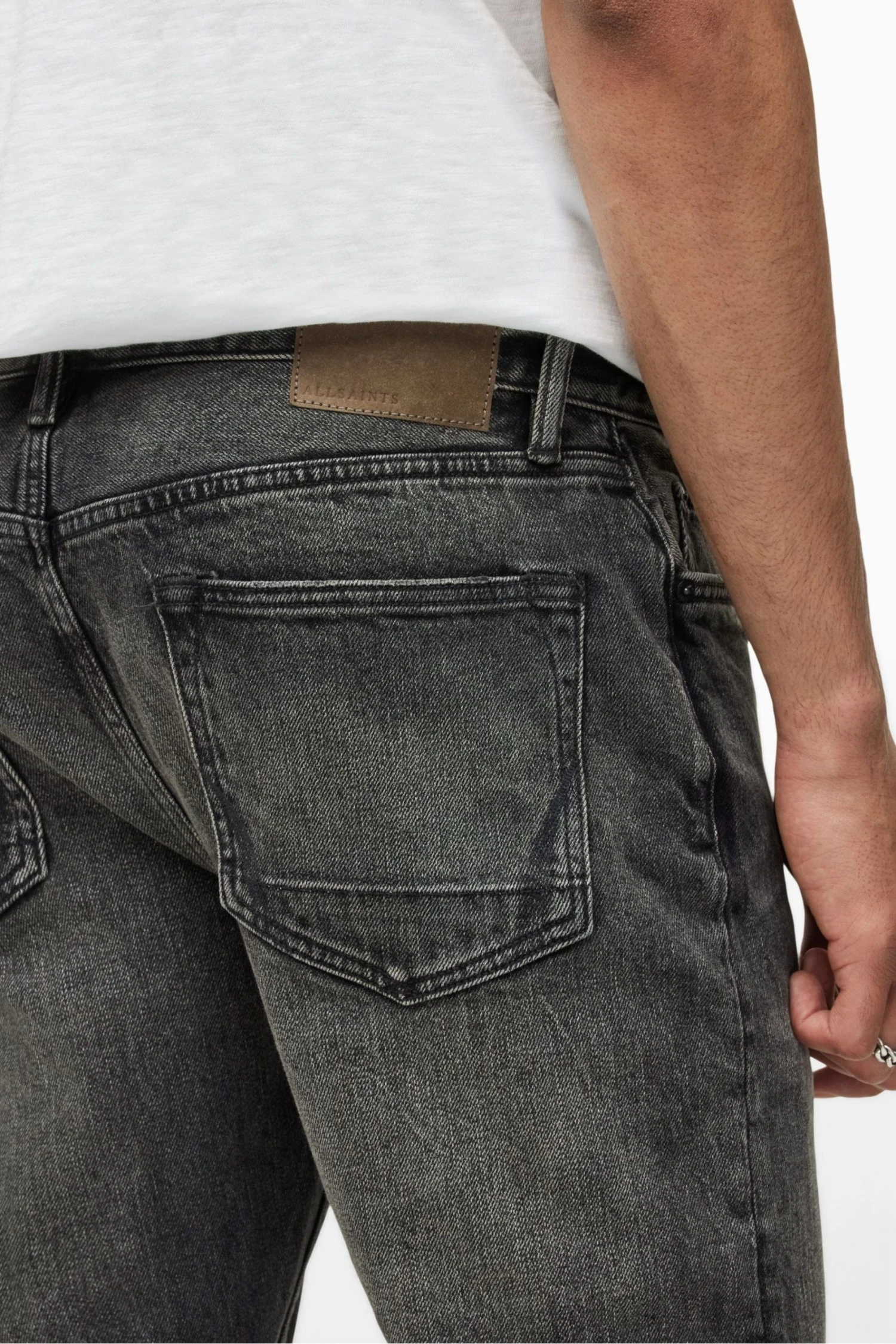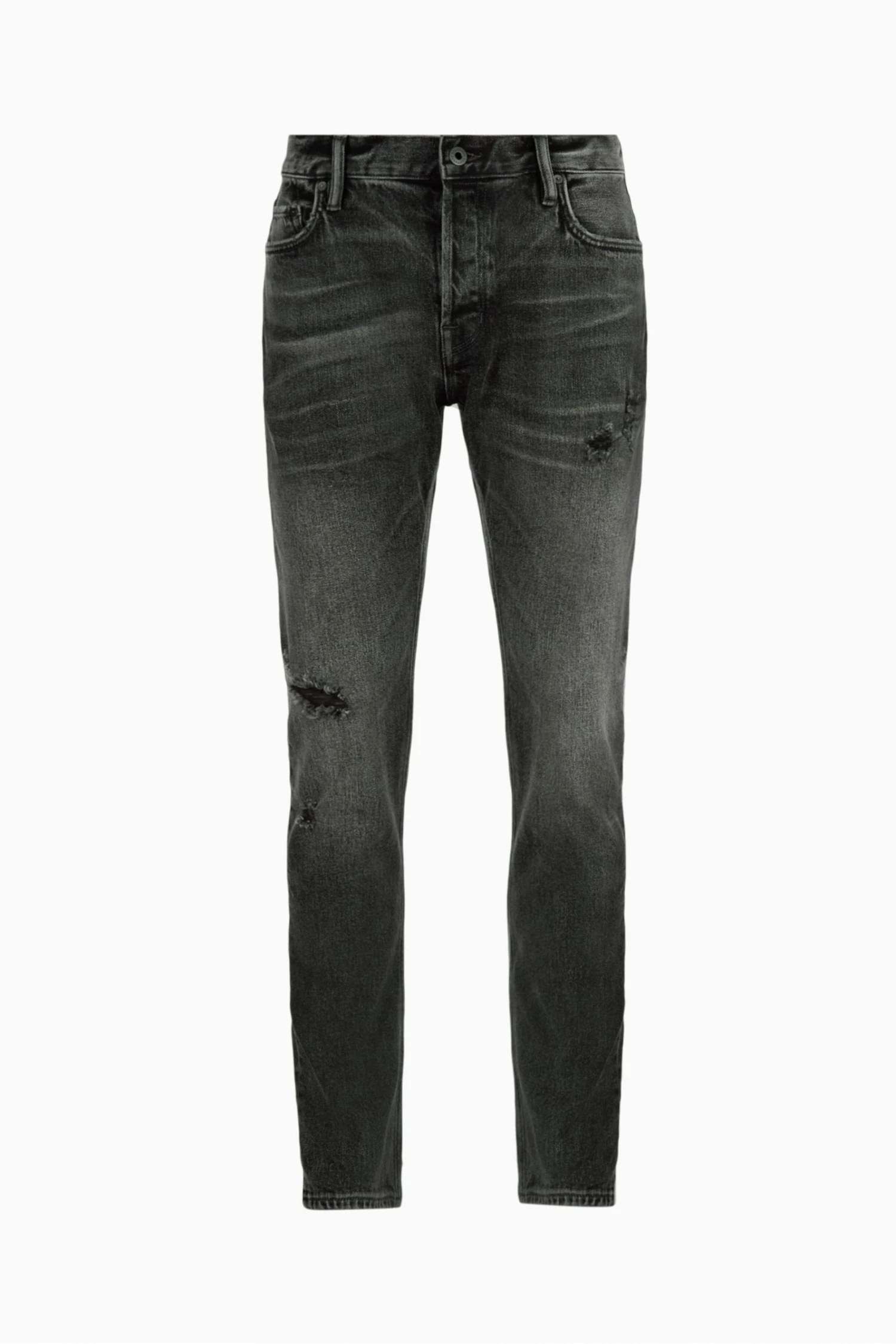 This product features button closure, slim fit, heavy washed black with damages to the left thigh area and right knee area, jacron patch and jacron washer to front button.