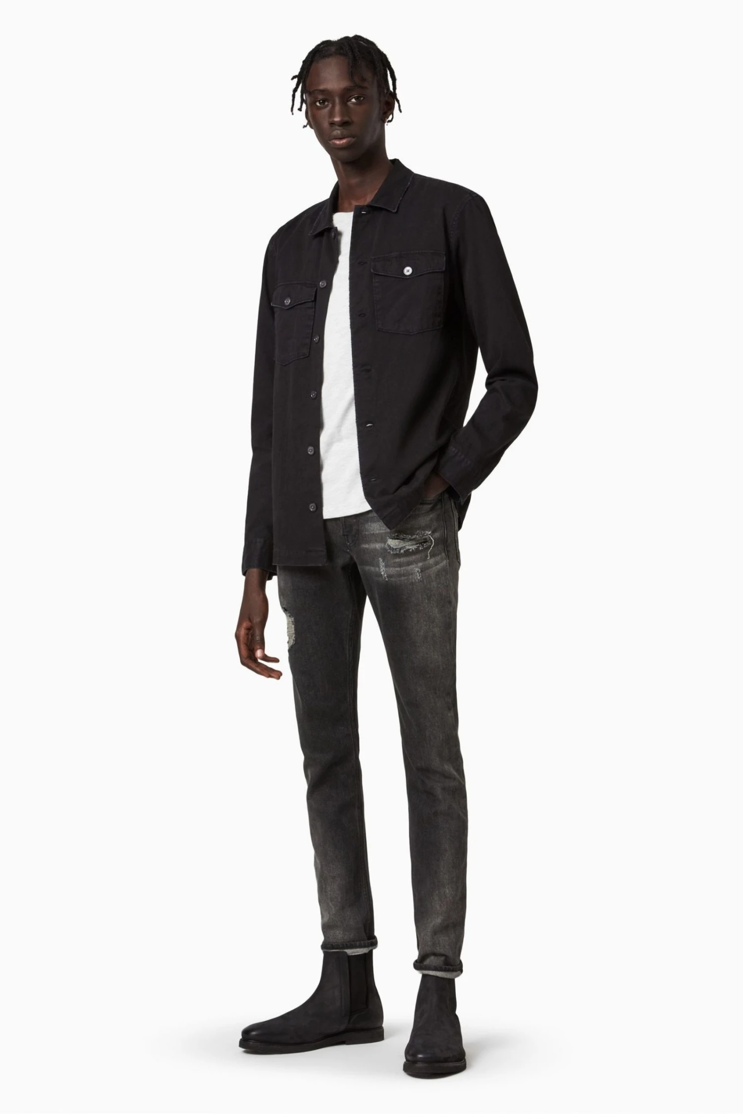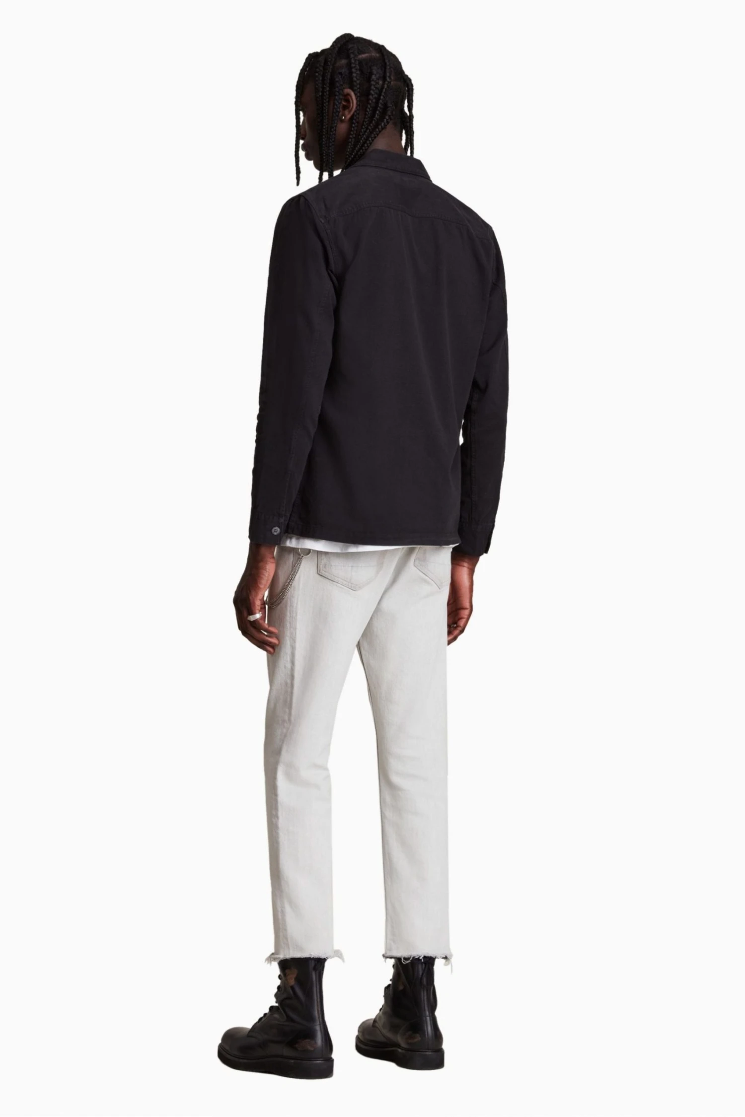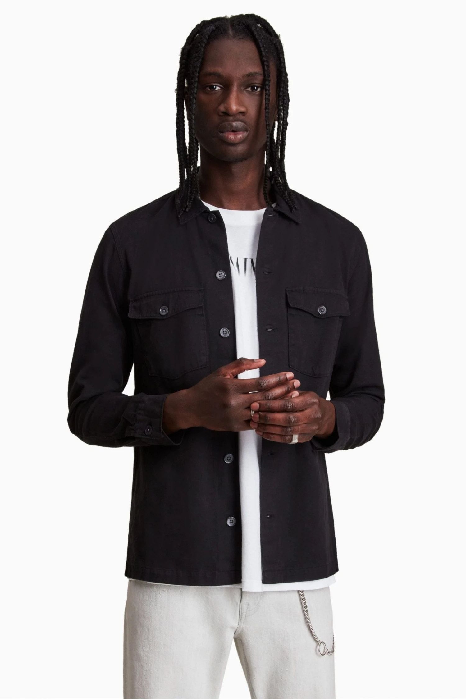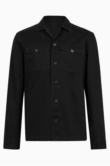 Long sleeves. Button up closure. Camp collar. Chest pockets. Chipped metal buttons.