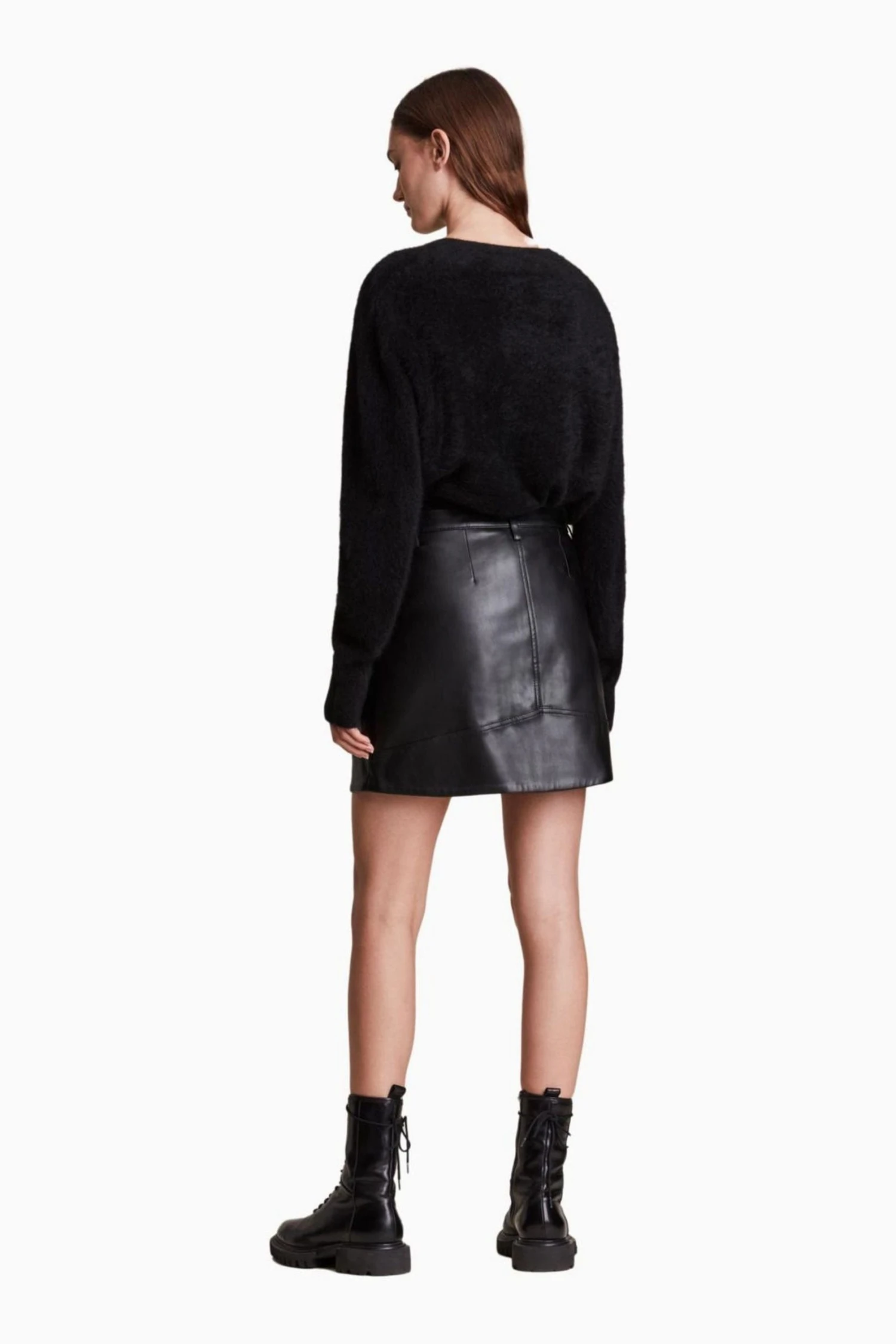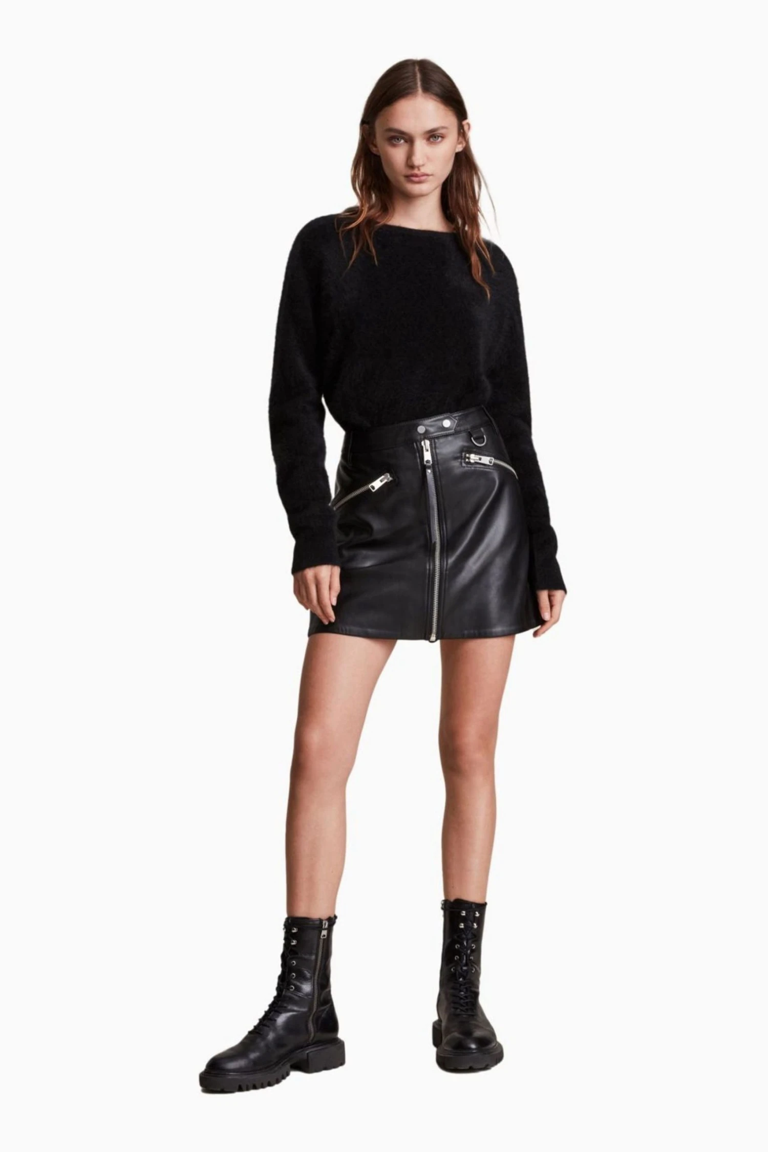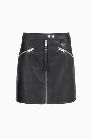 Featuring zip closure, mini length, metal hardware, zipped pockets, faux leather and slim fit.