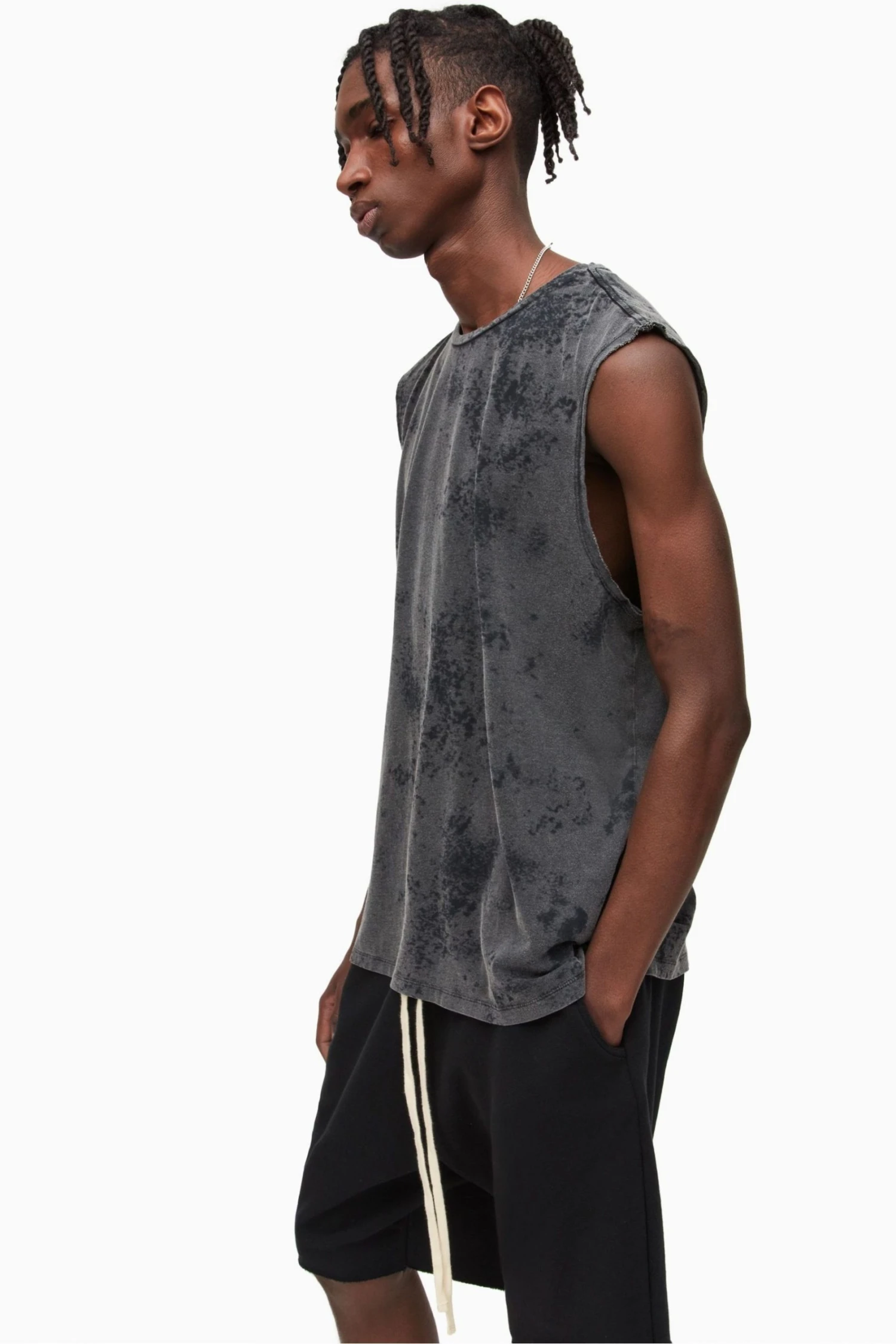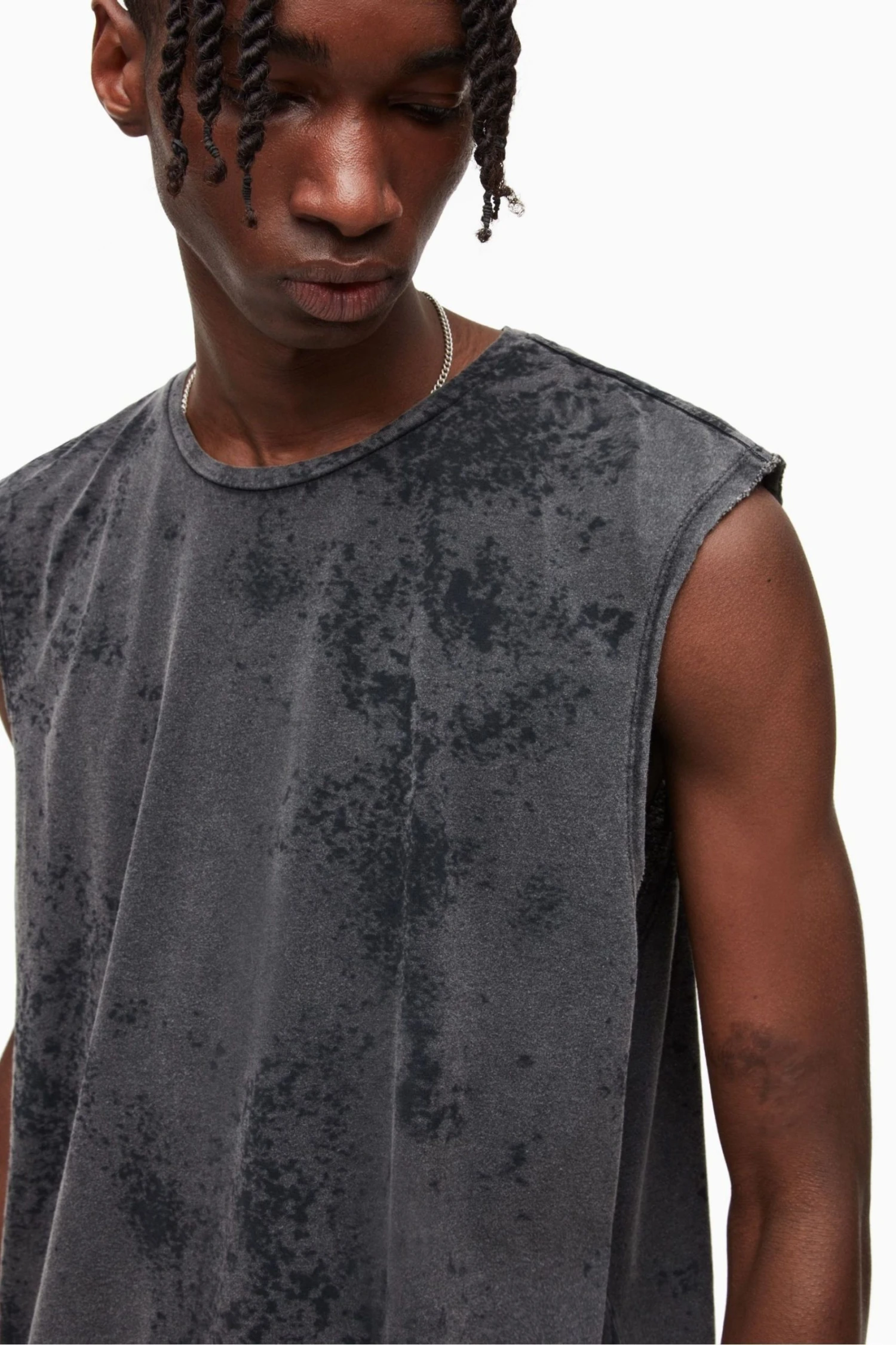 Pull over. Regular fit. Crew neck. Sleeveless. All over fadeout wash. Raw armholes. Self fabric neckband.