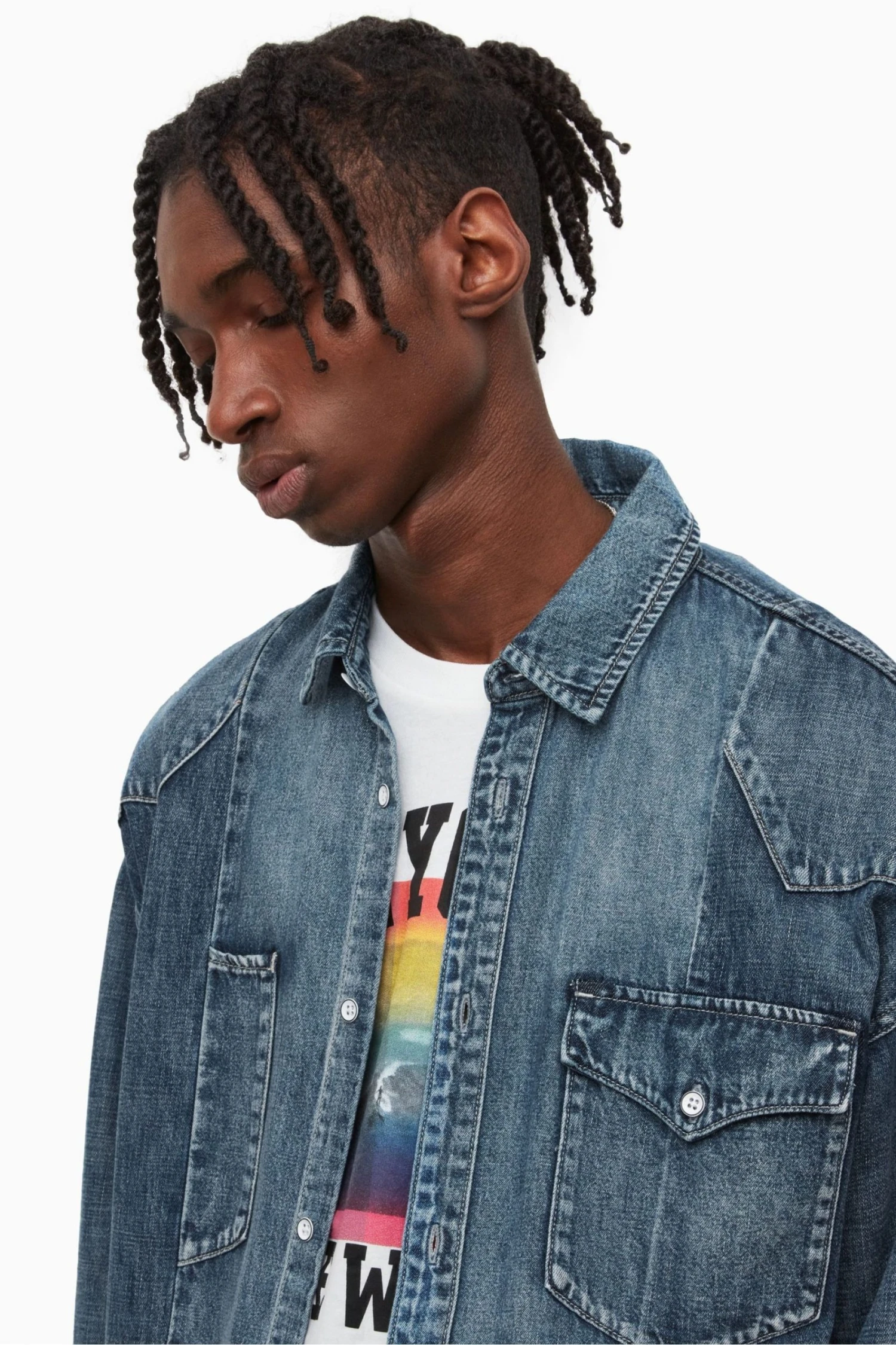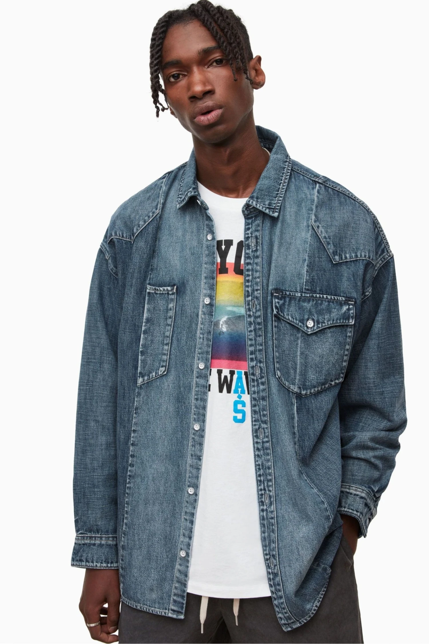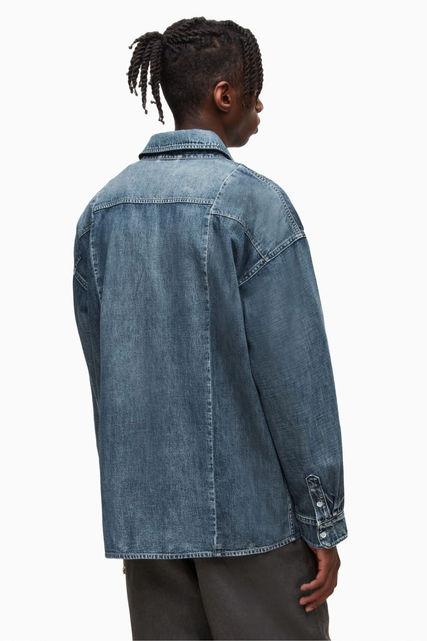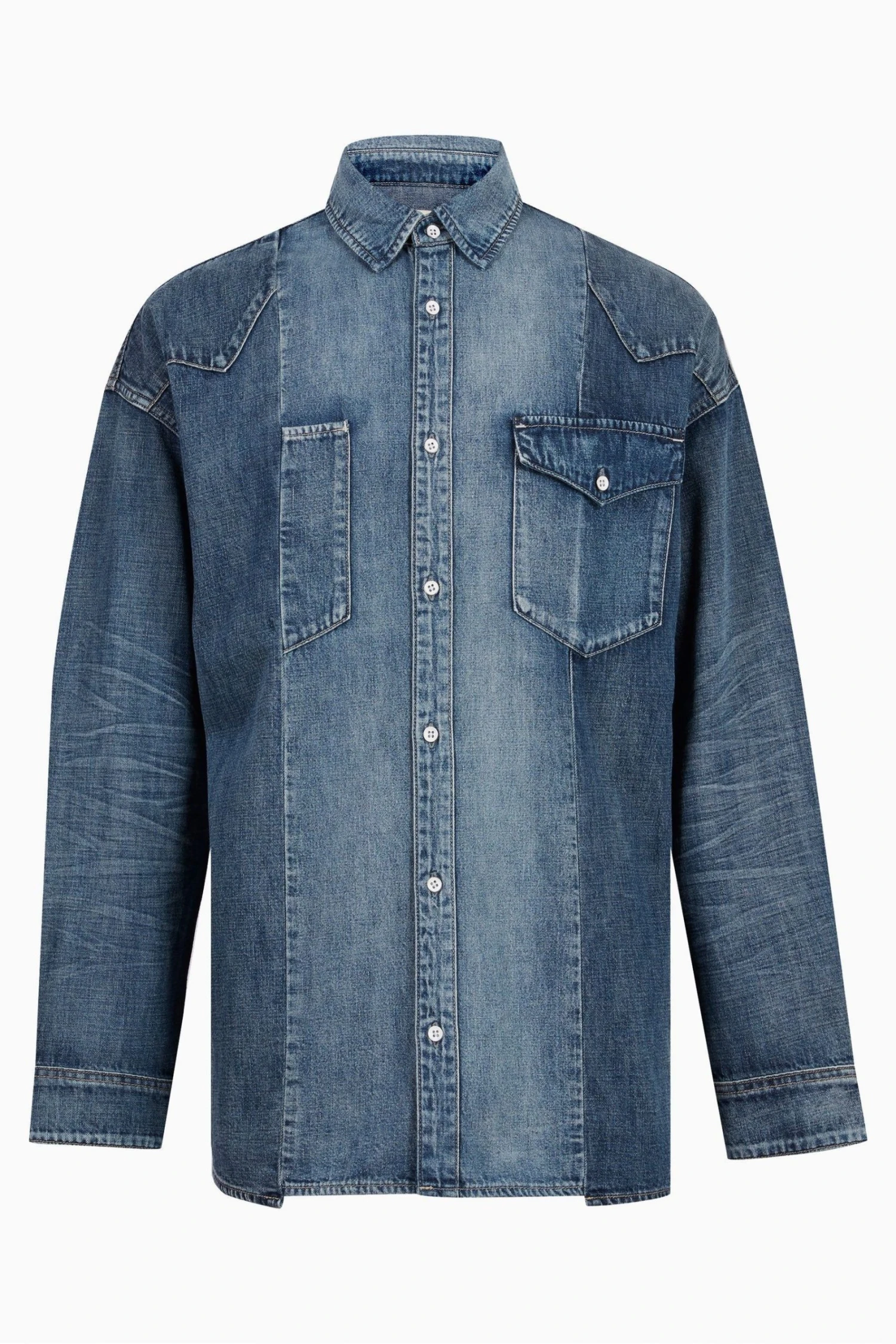 It is an oversize fit. Designed with button closure, classic collar, long sleeves. This mid indigo denim shirt features patchwokring details, front pockets with flap, button fastening, and half front pocket on right of the body (more decorative than funcitional).