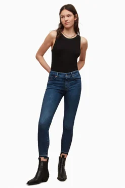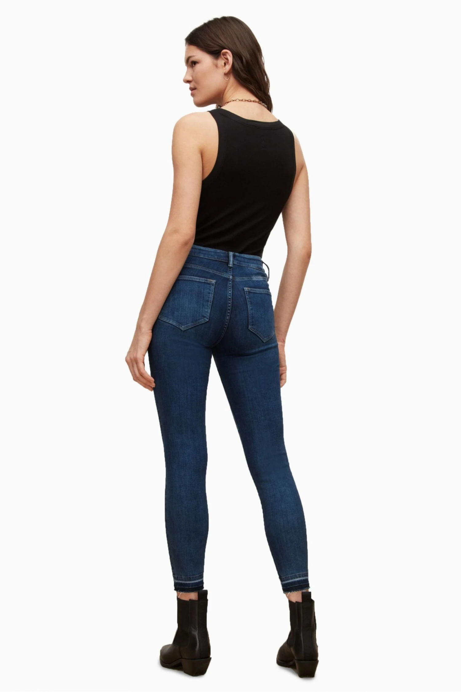 Ankle length. Mid-rise. Button closure. Vegan leather washer. Five pockets. Reinforced back pockets. Superstretch. Super soft. Frayed hems. ALLSAINTS cotton products support more sustainable cotton farming. Better Cotton is sourced via a system of Mass Balance. Skinny fit.