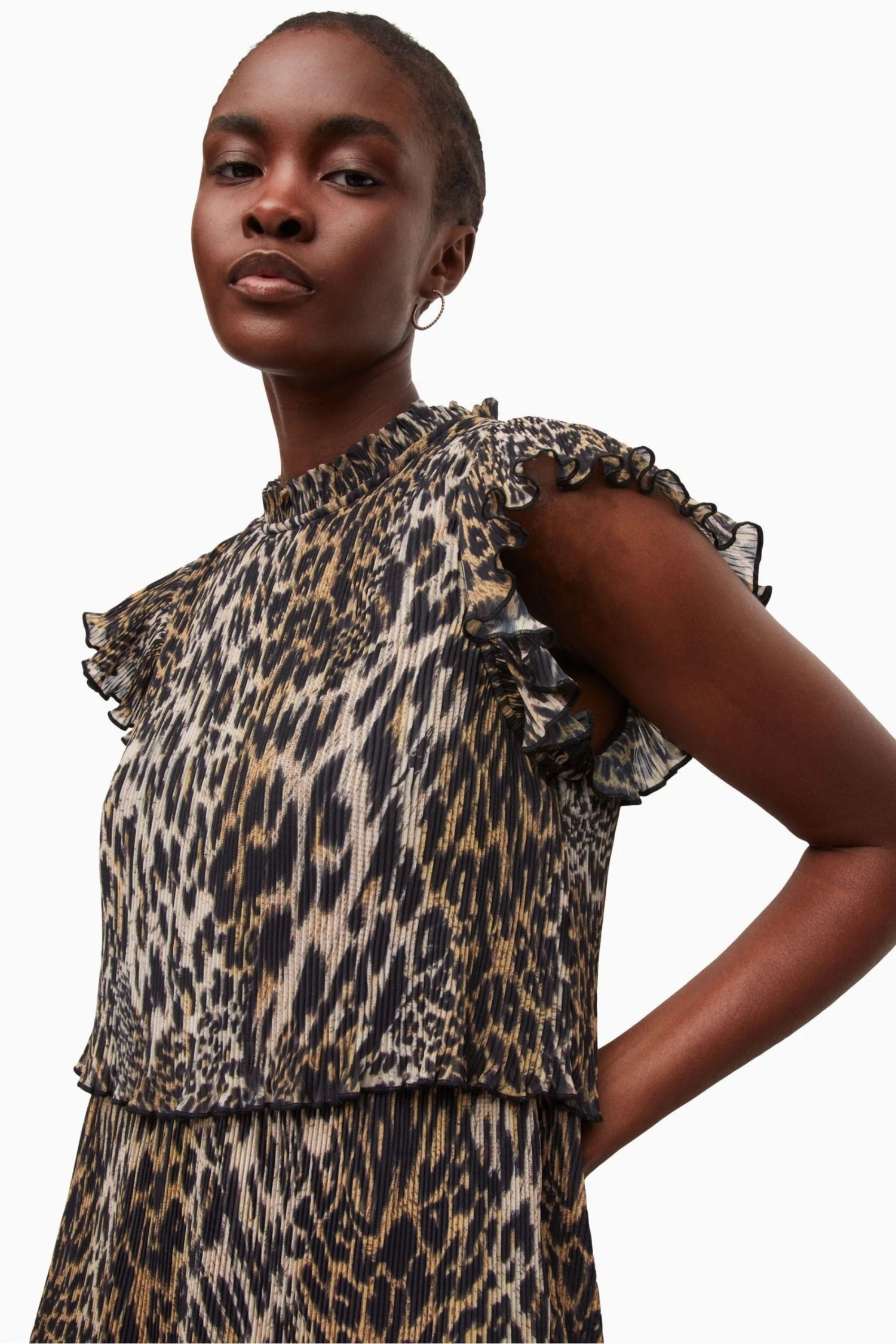 High neck. Button and zip closure. Short sleeves. Four tier construction. Micro-pleated. Gathering on the lower tier. Frill standing collar. Oversized frill shoulders. New season animal print – Kiku: the Japanese word for chrysanthemum – the national flower of Japan, it symbolises nobility, purity and trust. Recycled materials.
