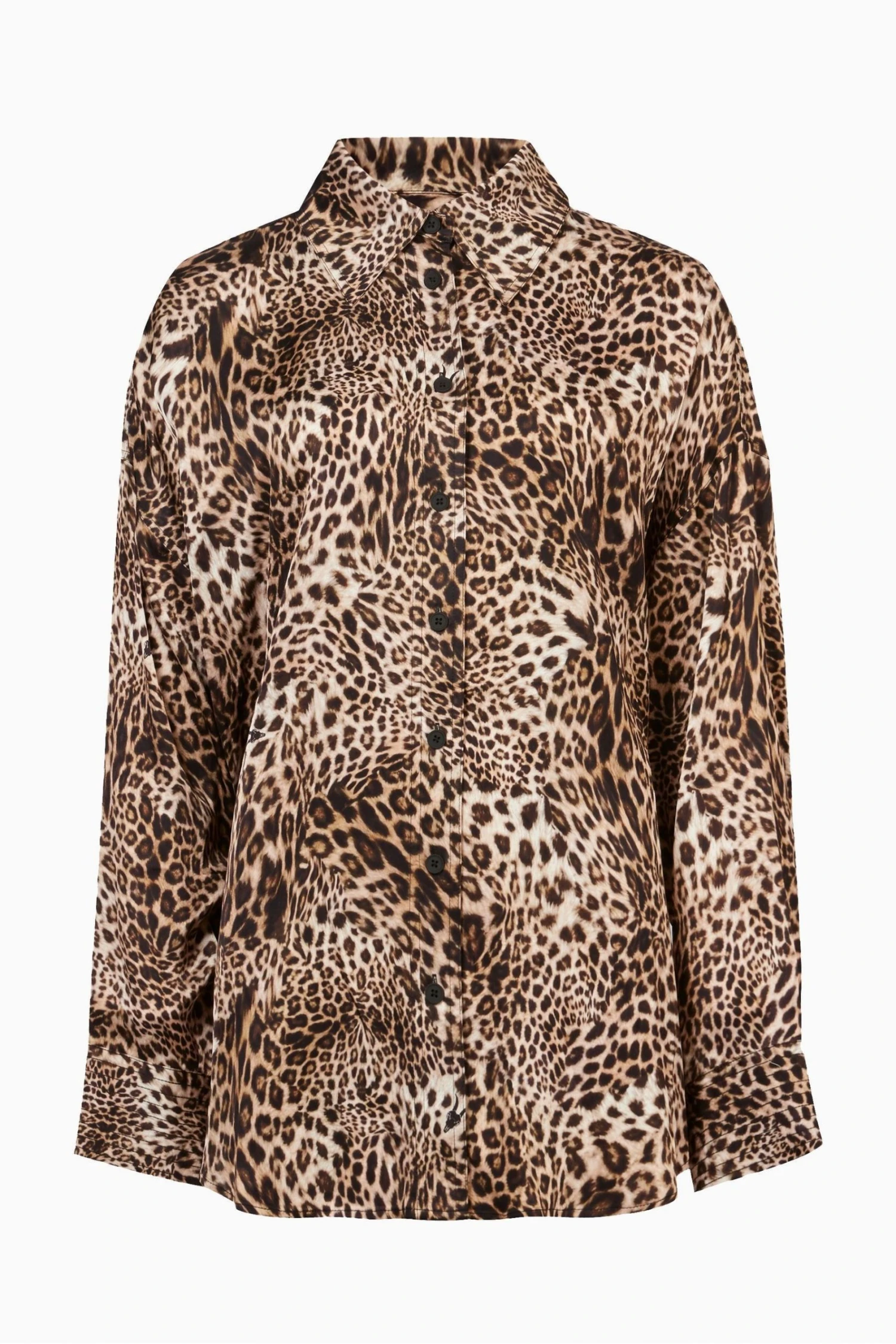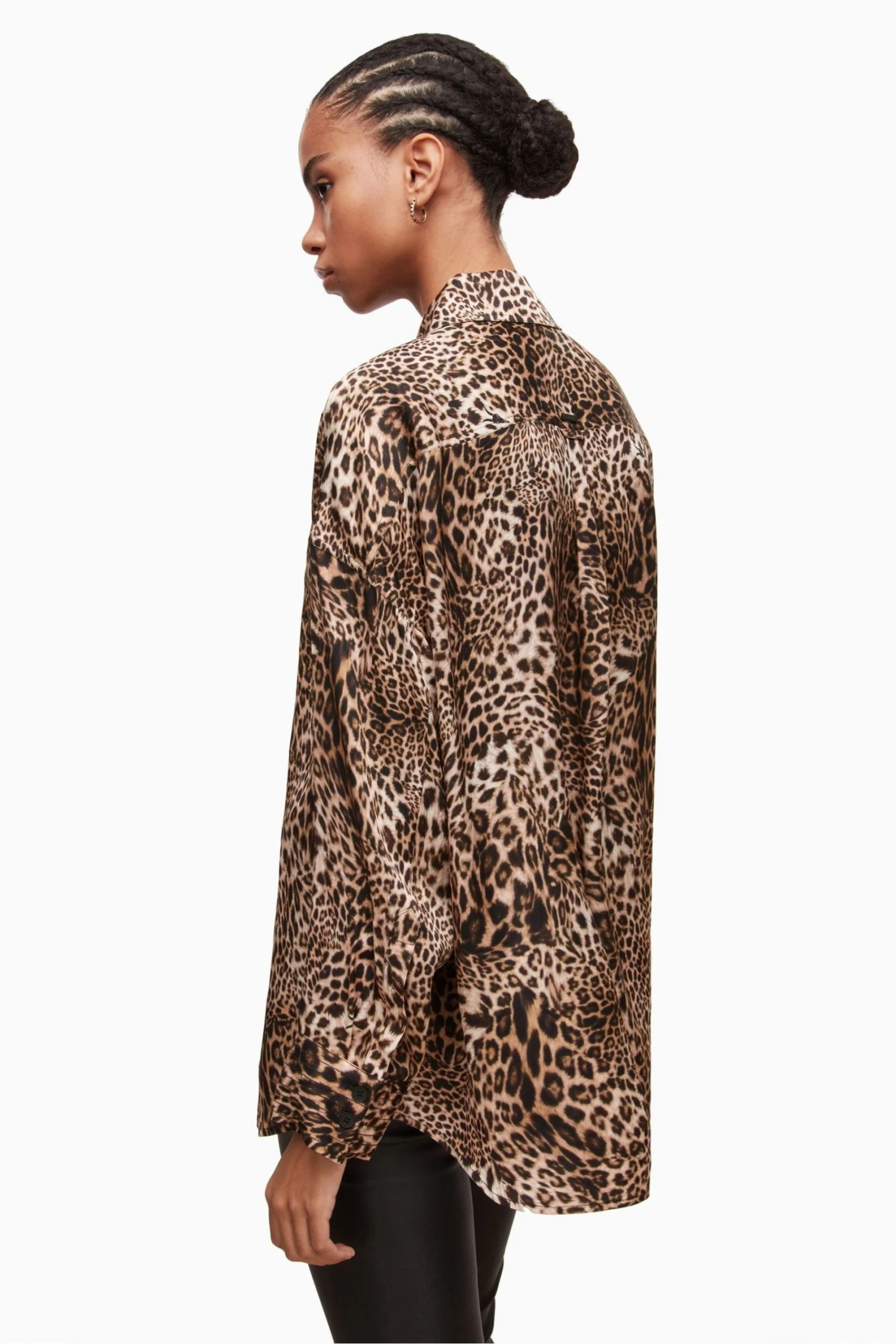 Oversize fit. Collar. Long sleeve. Button closure. Satin finish. Deep cuffs. Top stitching details. Black rubber finish buttons. Yoke and tab detail at the back. AllSaints branded metal bar. New season animal print – Kiku: the japanese word for chrysanthemum – the national flower of Japan, it symbolises nobility, purity and trust. Sustainable EcoVero™ viscose.