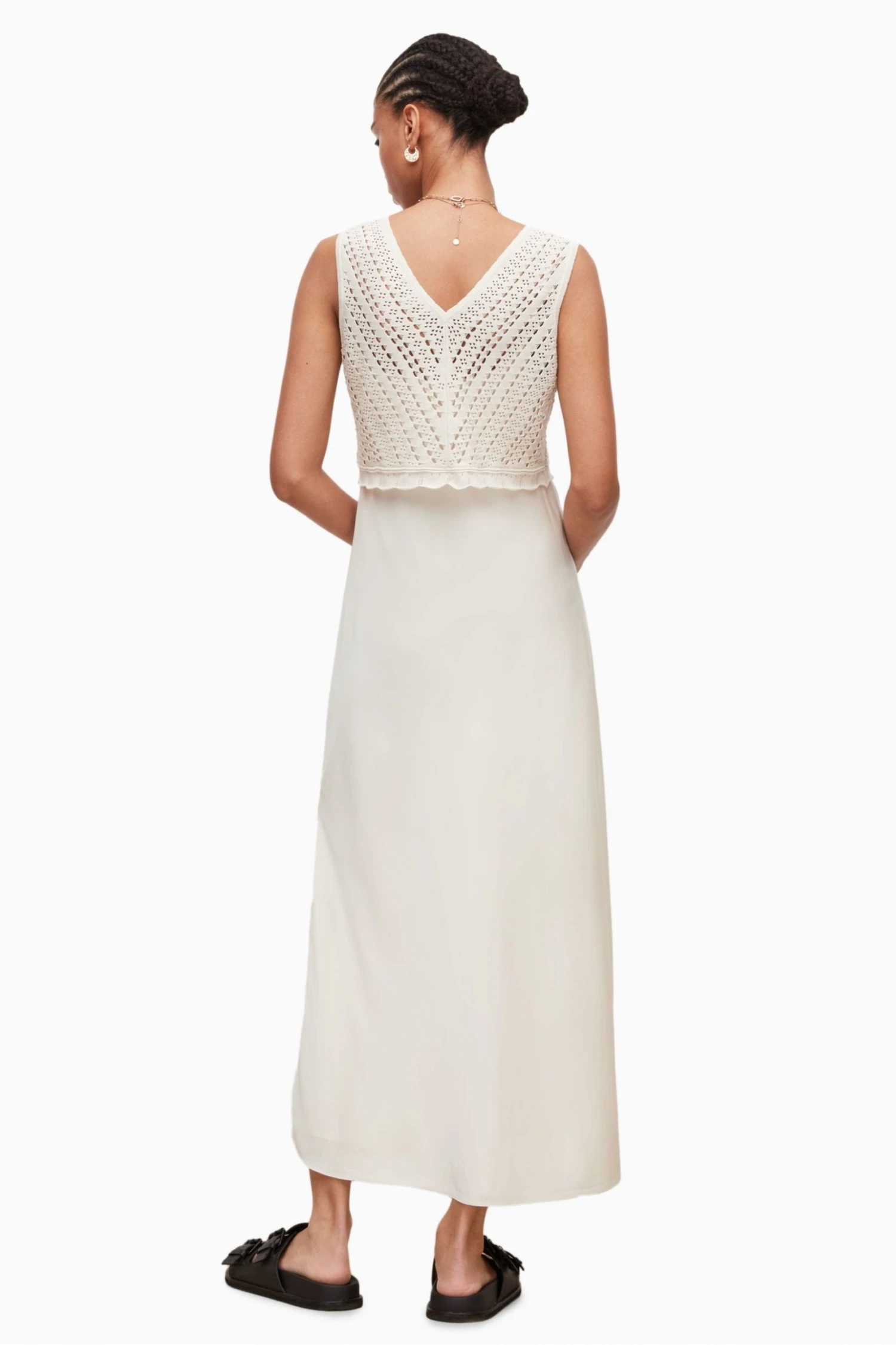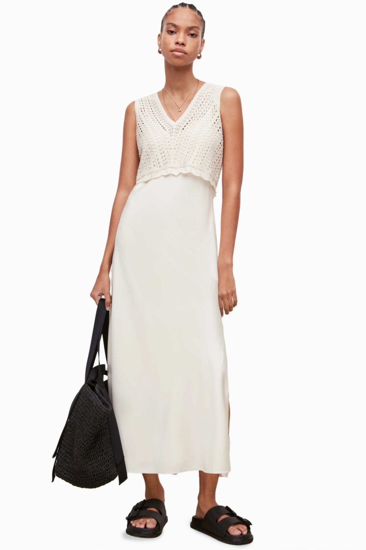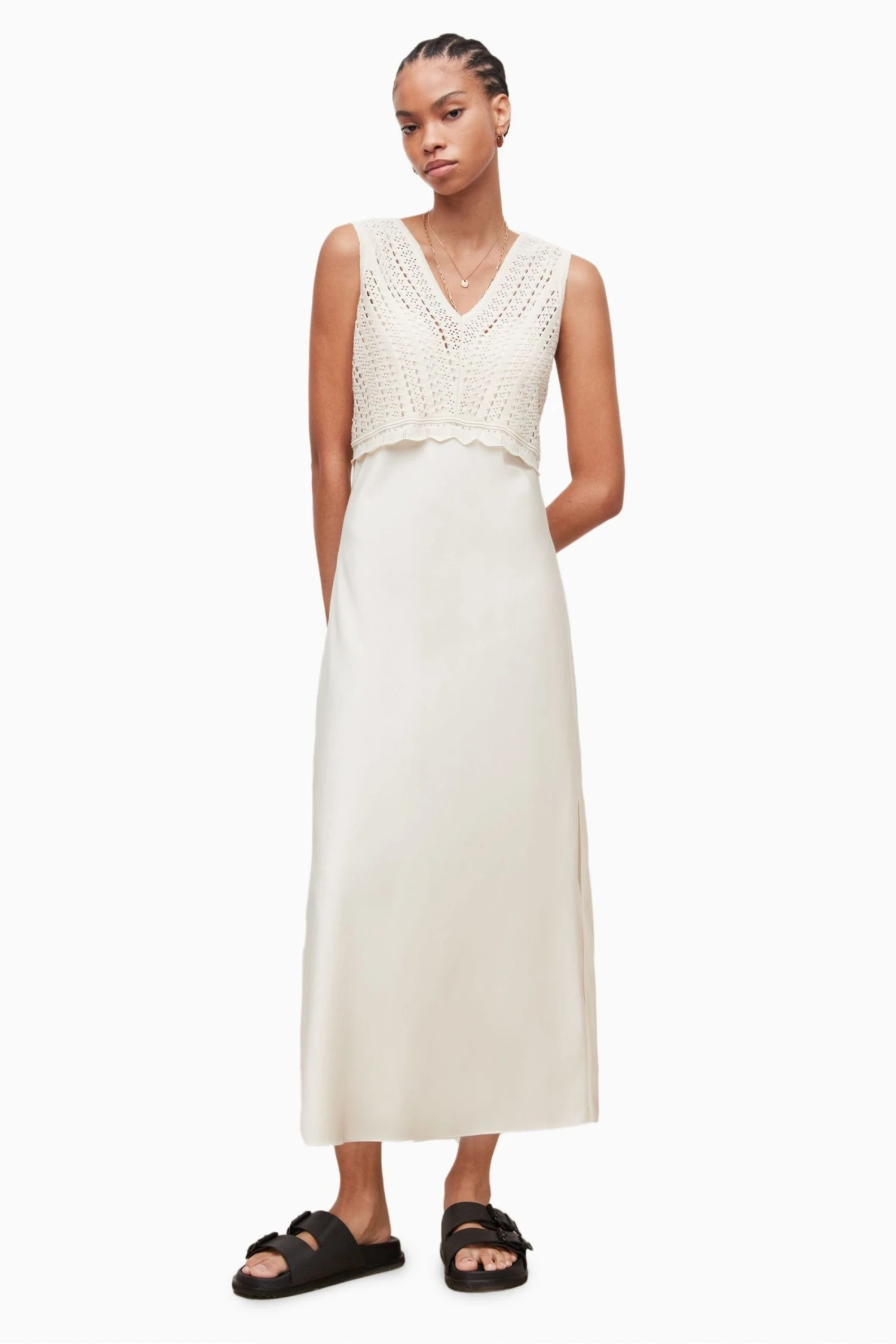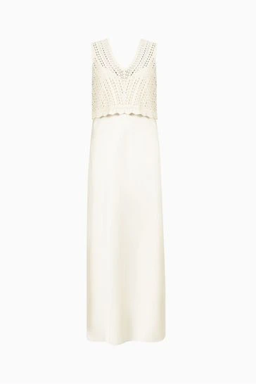 Featuring a pullover, sleeveless, two-in-one style. Bias cut satin slip dress with adjustable straps and layers beneath. Cropped V-neck open stitch crochet top. Top and dress can be worn separately or together. This colourway is lined to prevent it from being sheer.
