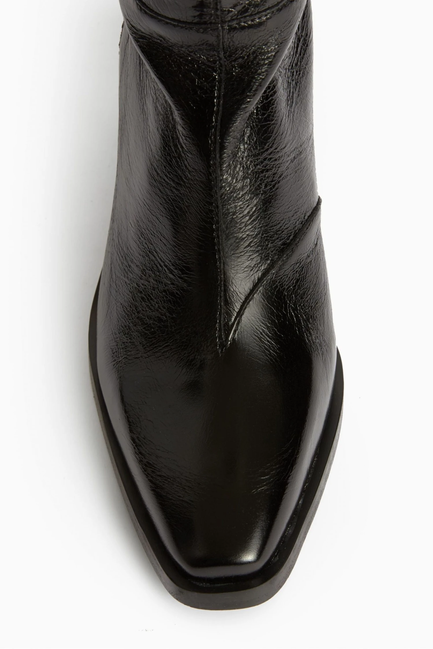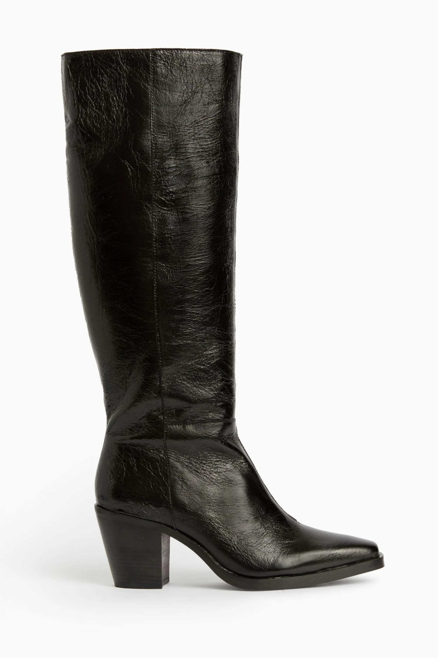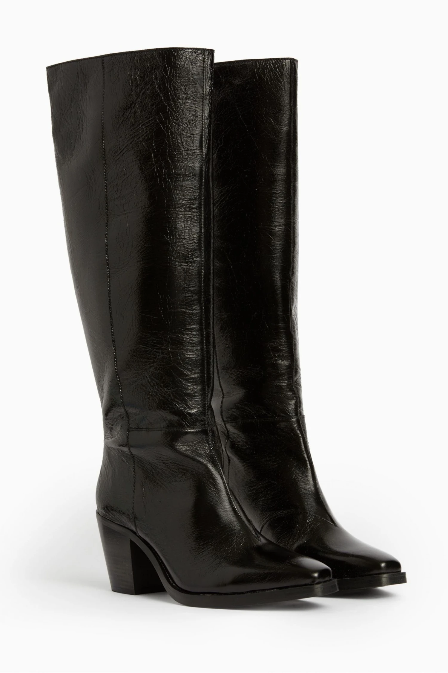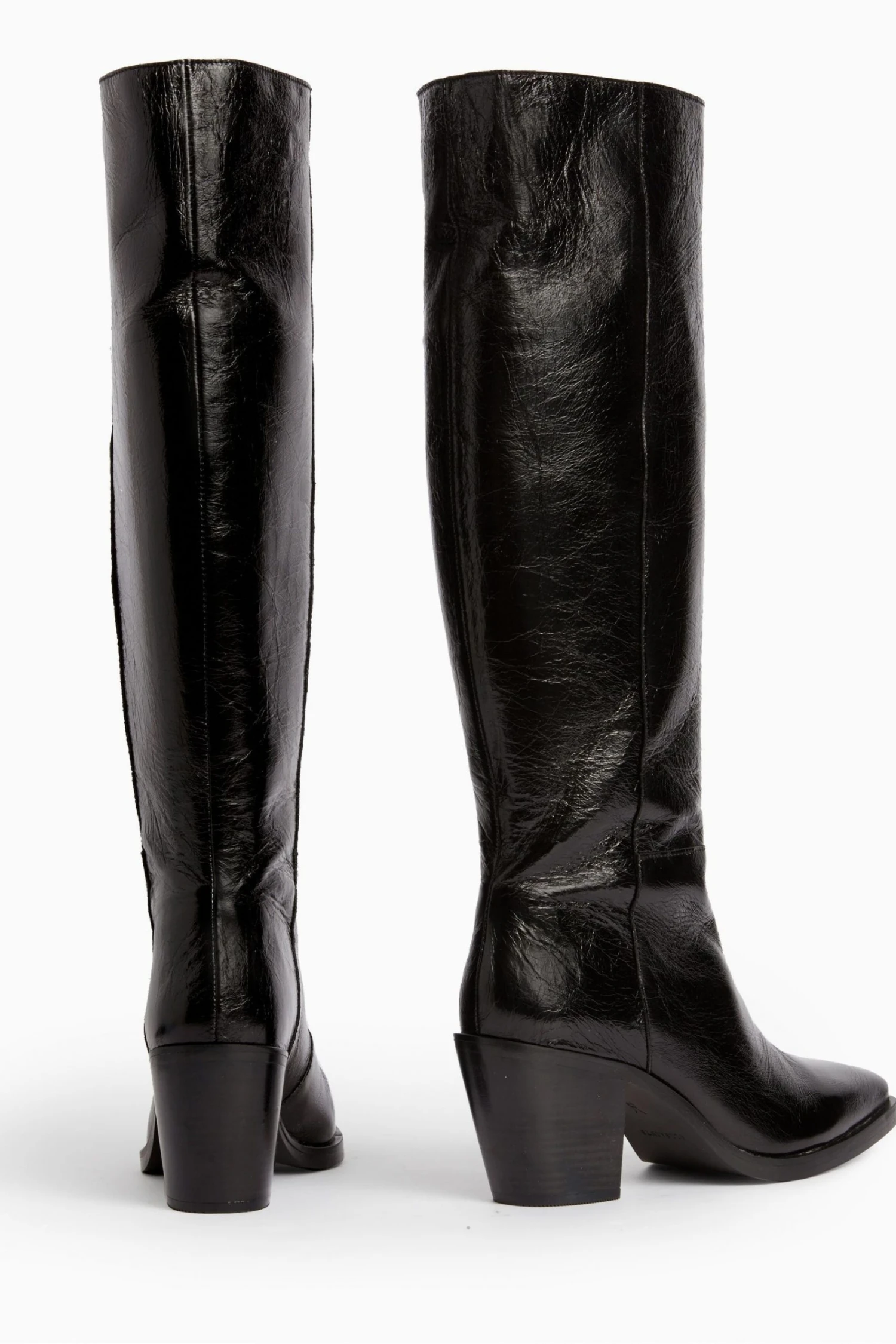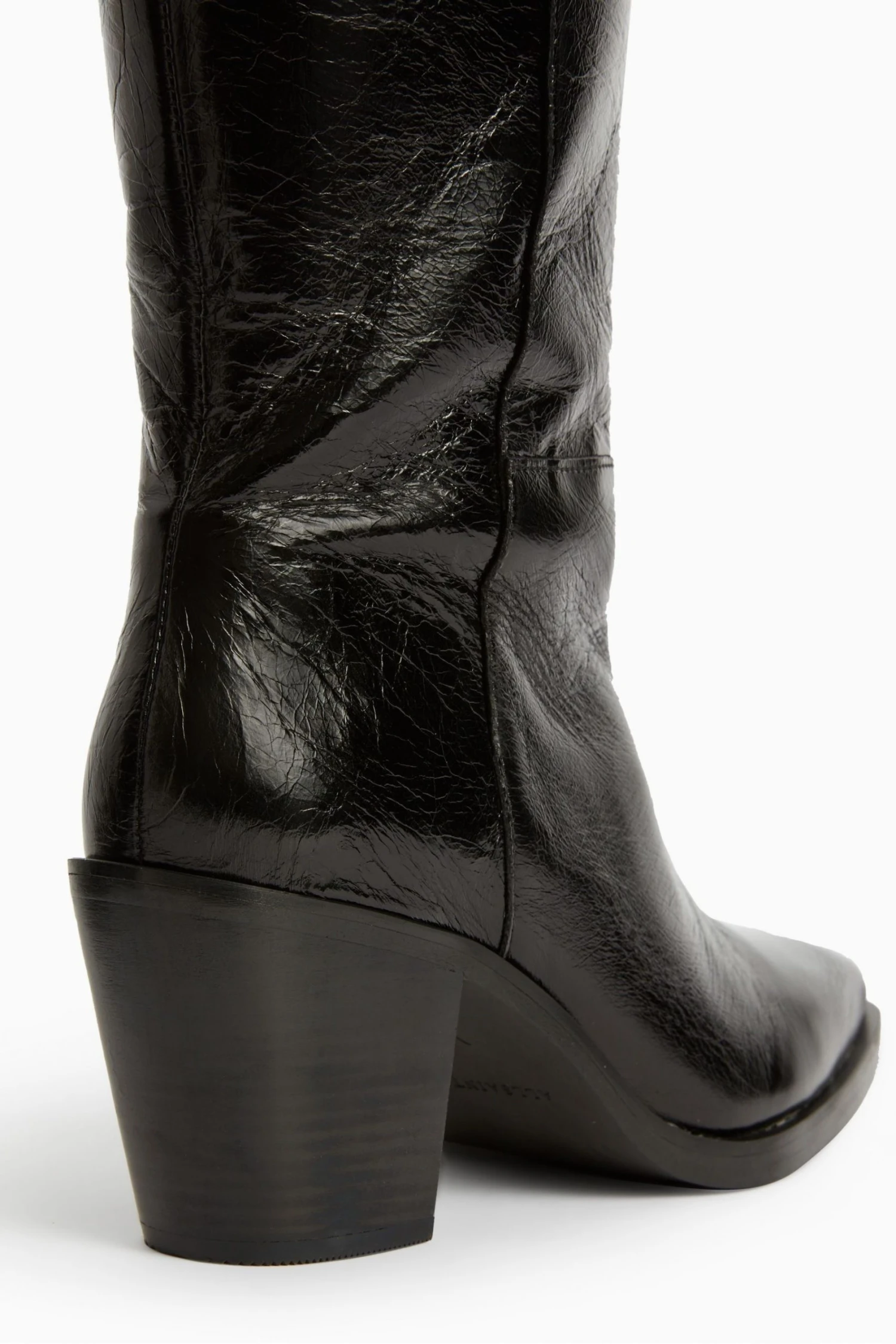 Featuring knee high boot, square toe, crinkle black leather and chunky stacked heel.