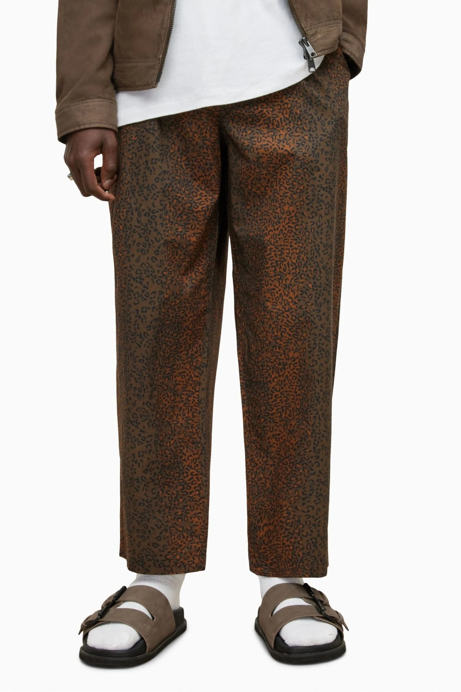 Features a tapered leg, dropped crotch and a cropped tapered style.