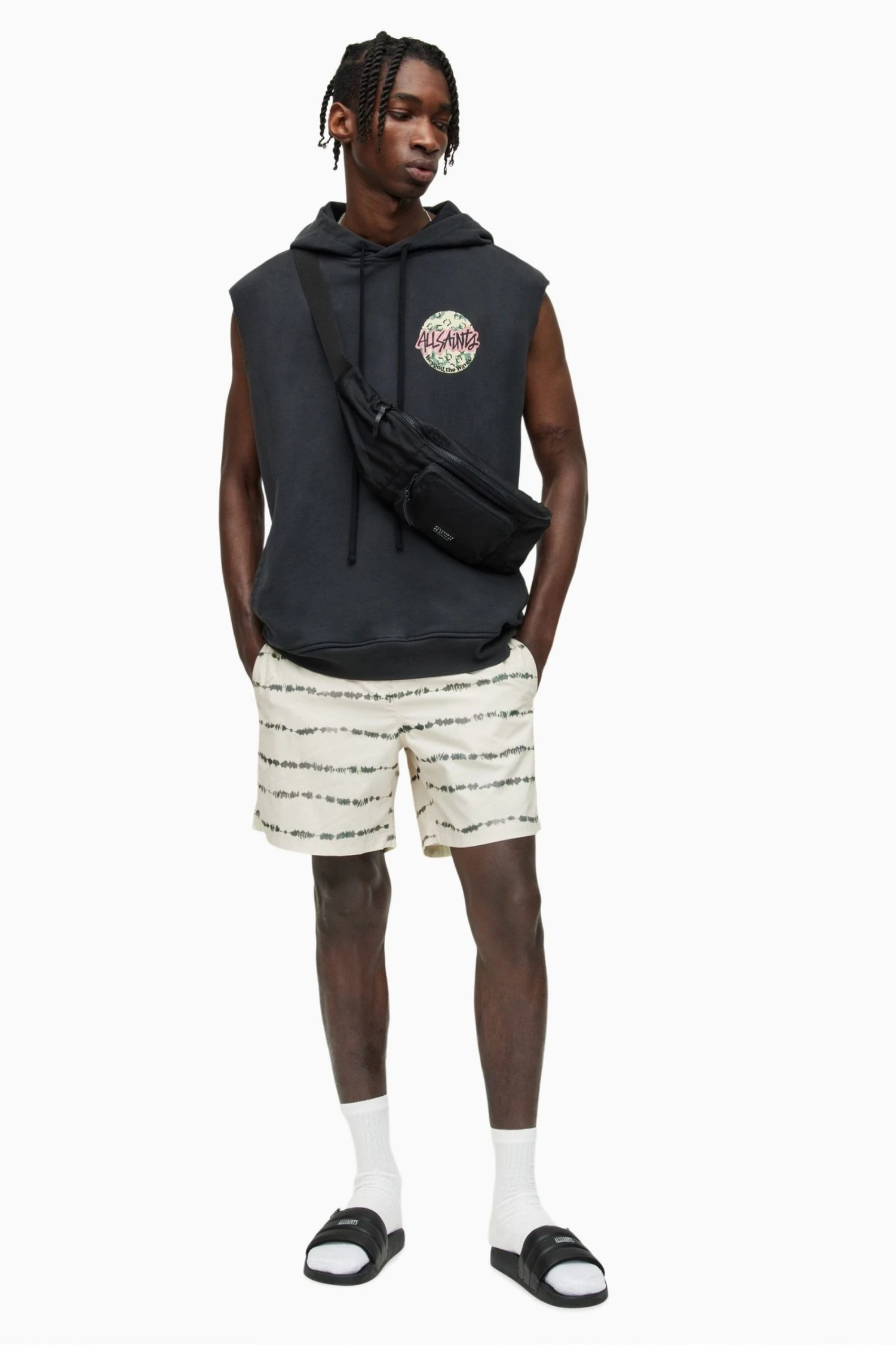 It has a regular fit, lined and front closure with all over tie dye print. Zip and popper closure with internal drawcords.