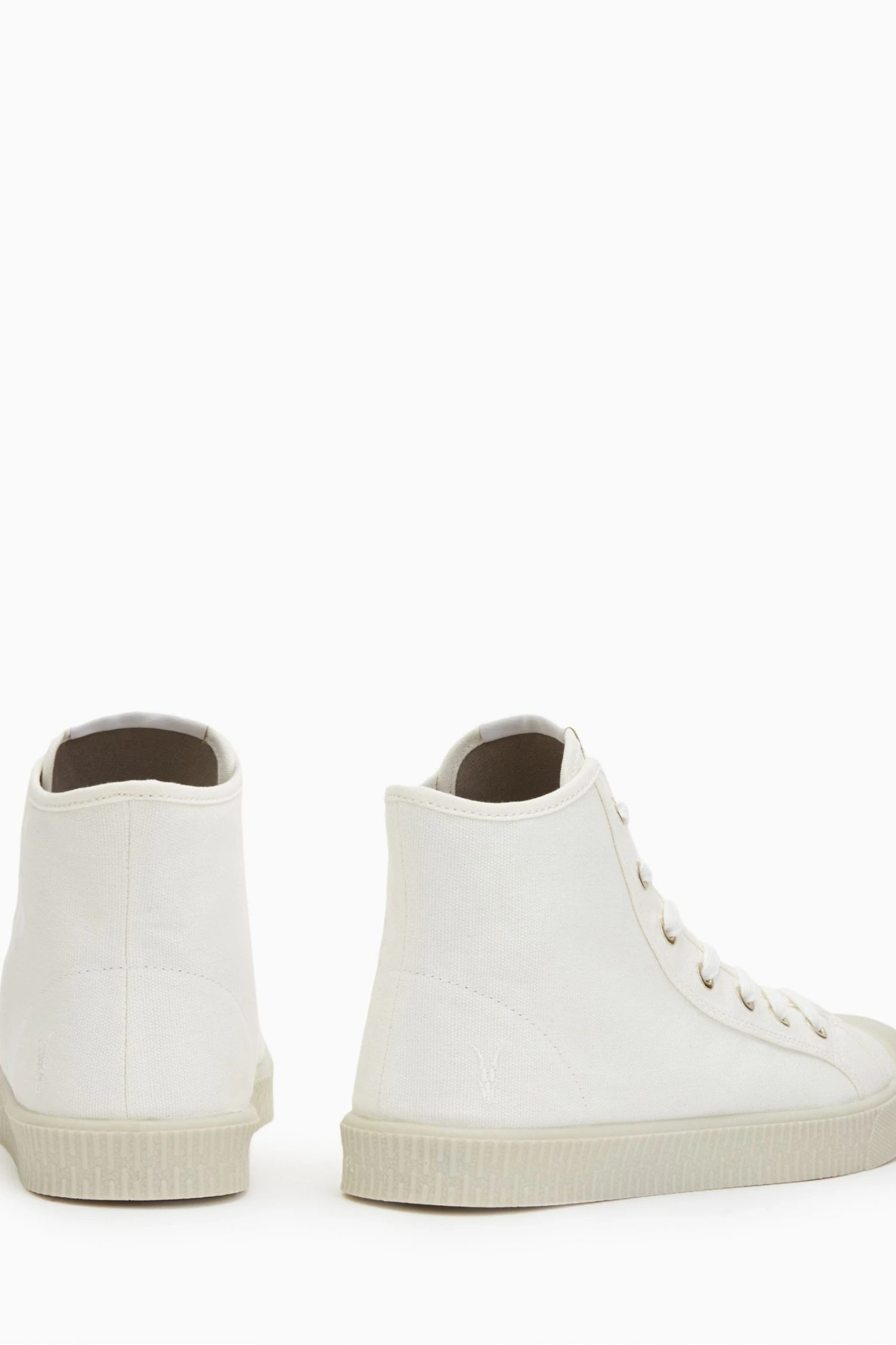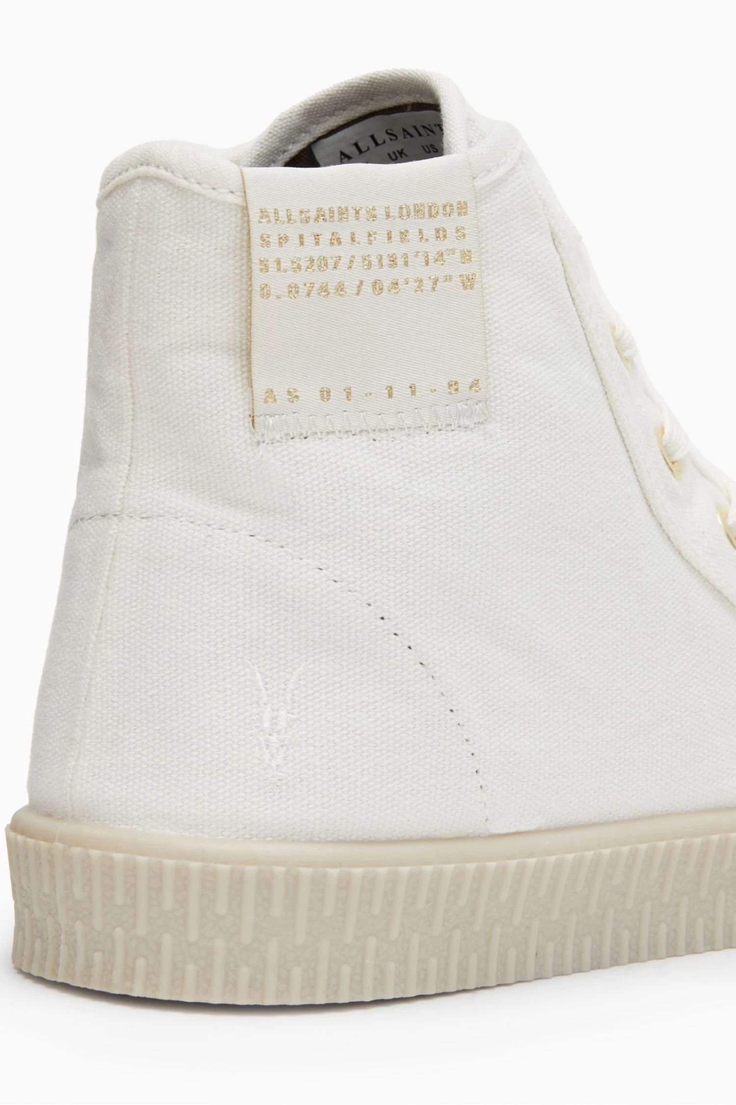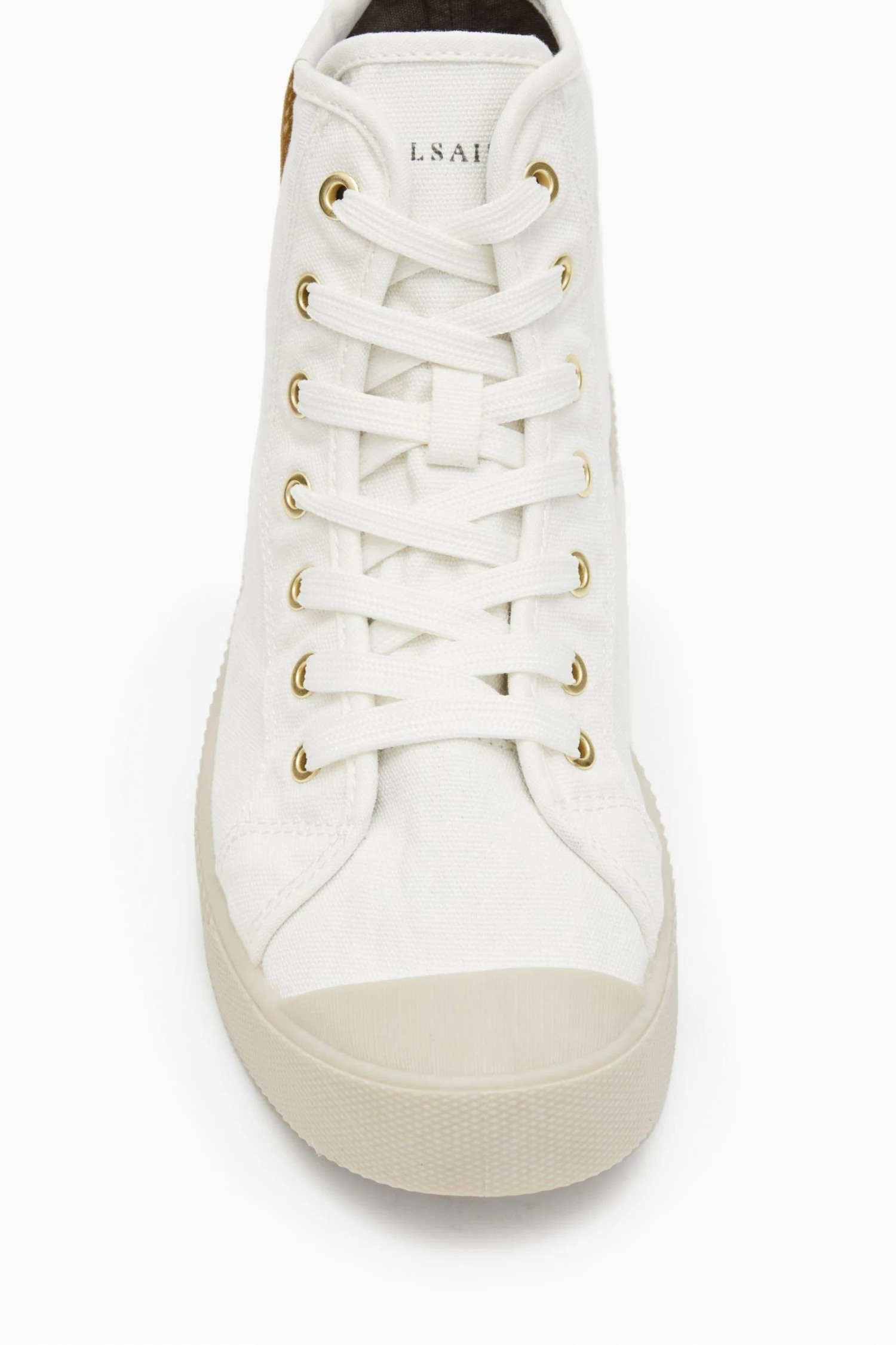 These are high top convas injected sneakers with branded woven label over top line. Lace up and round toe. Woven branded label.