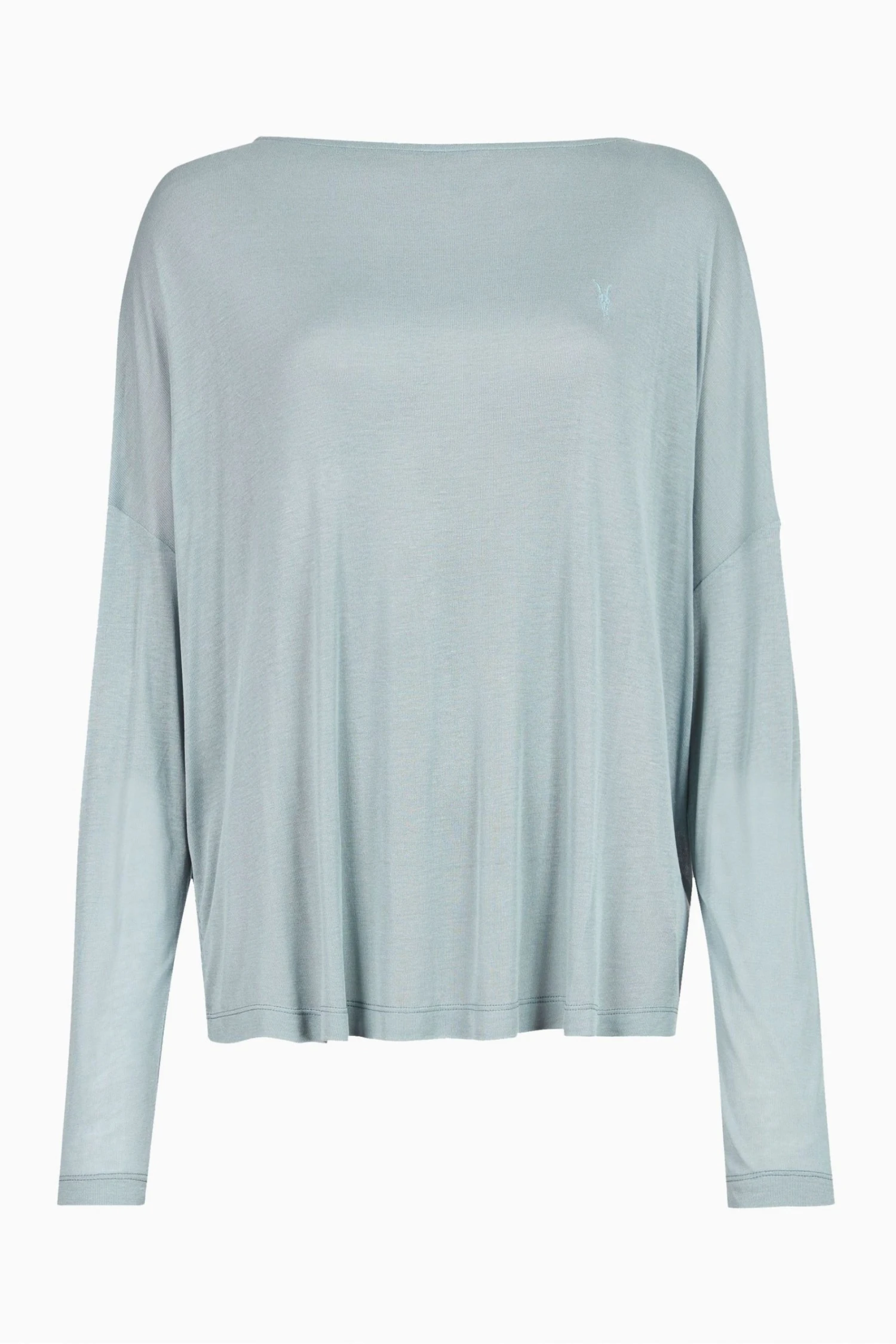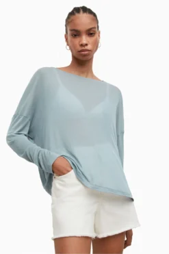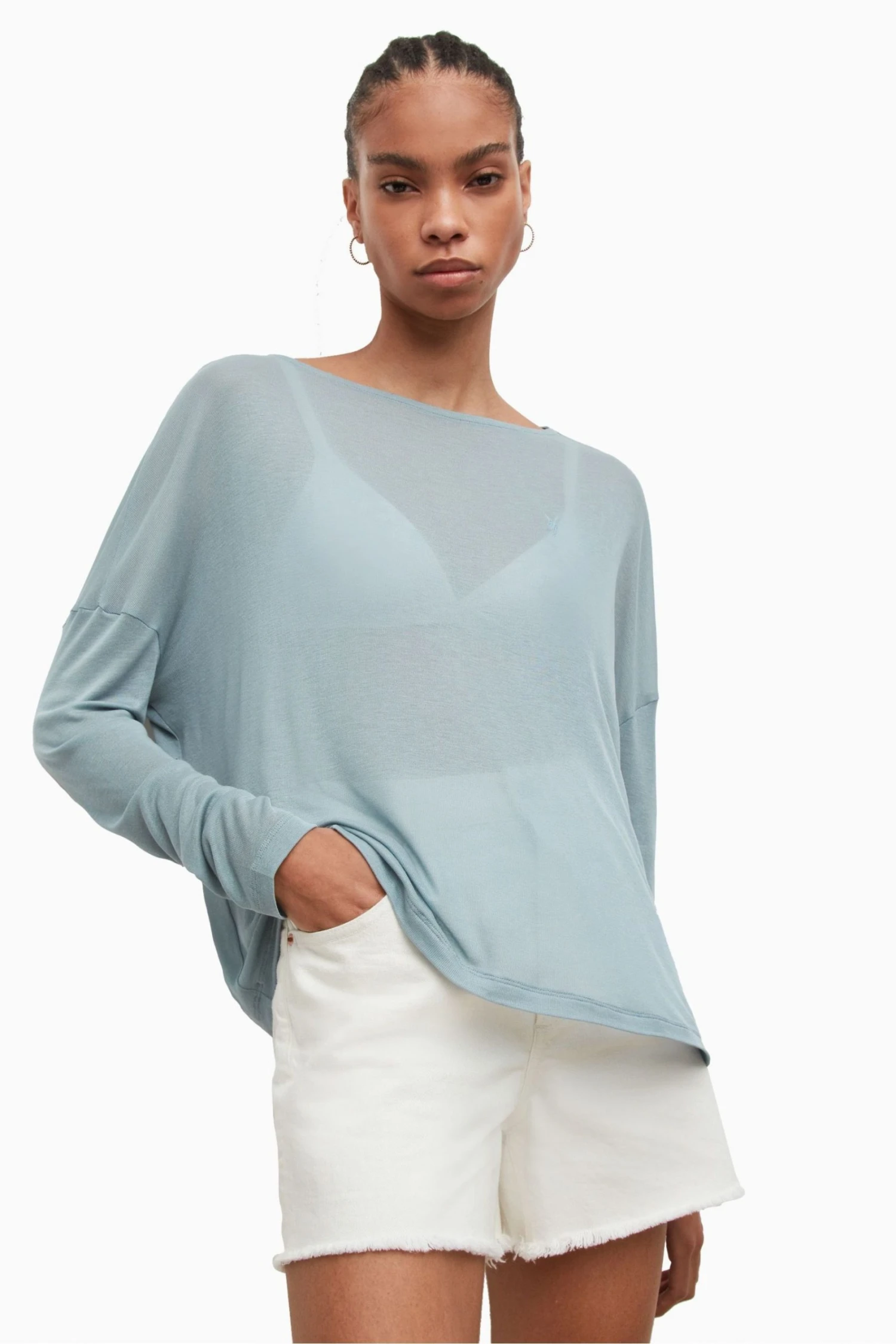 Pull over. Relaxed fit. Short length. Boat neck. Long sleeve. No Pockets.