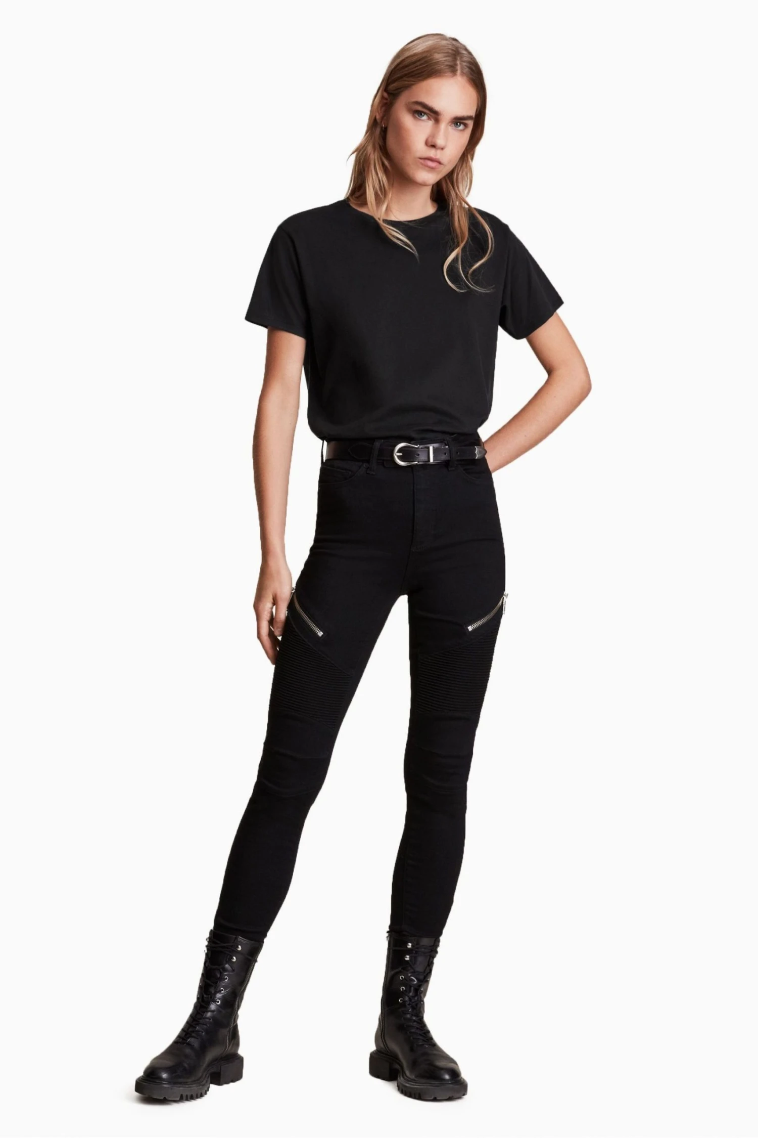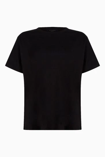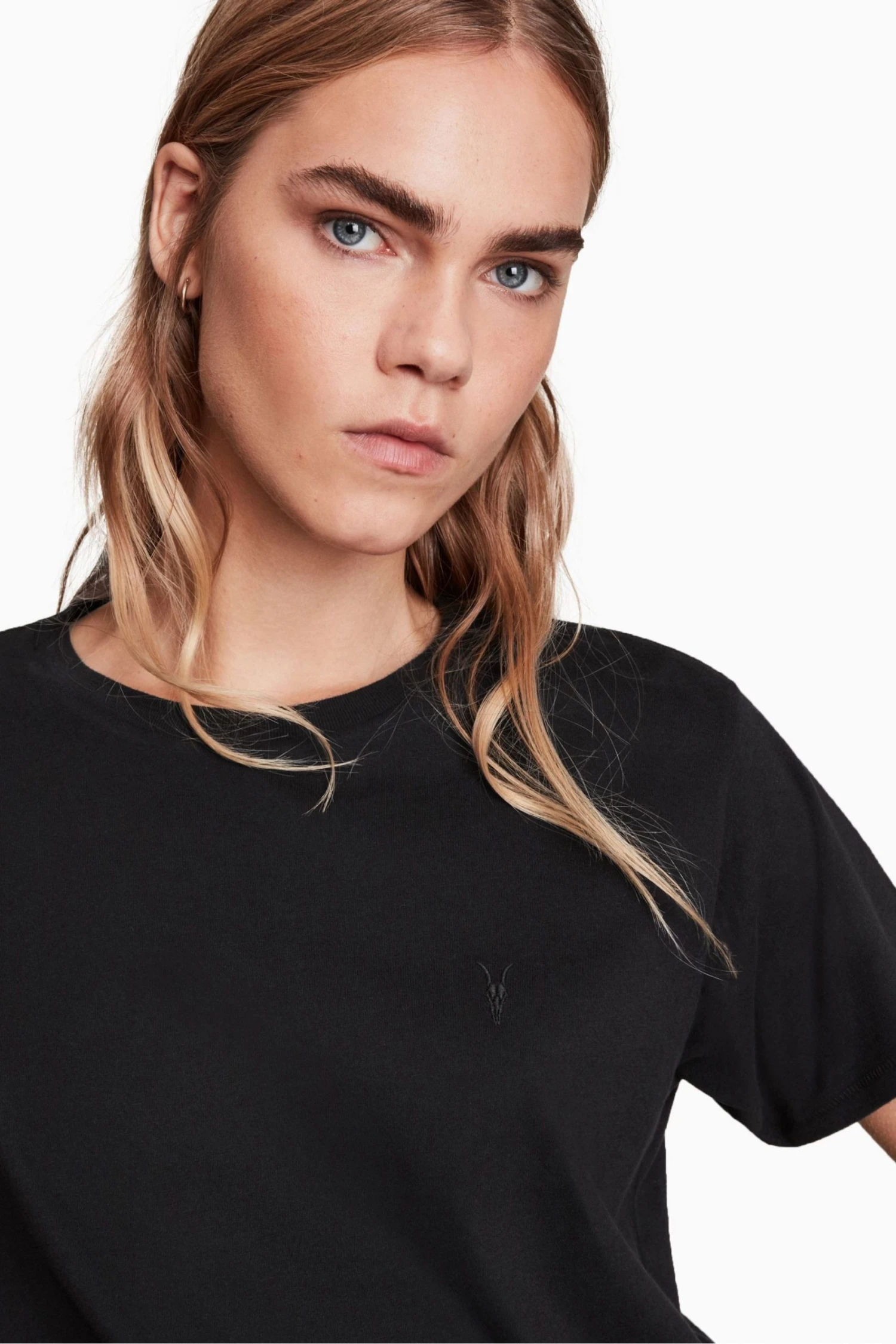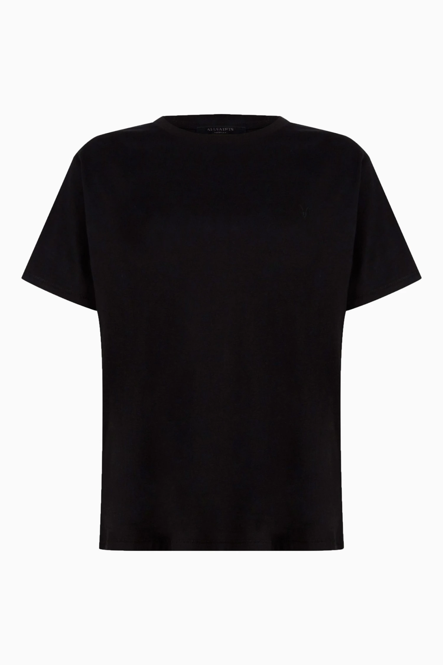 Pullover. Crew neck. Short sleeve. Relaxed fit. AllSaints embroidered Ramskull. AllSaints cotton products support more sustainable cotton farming. Better Cotton is sourced via a system of Mass Balance.