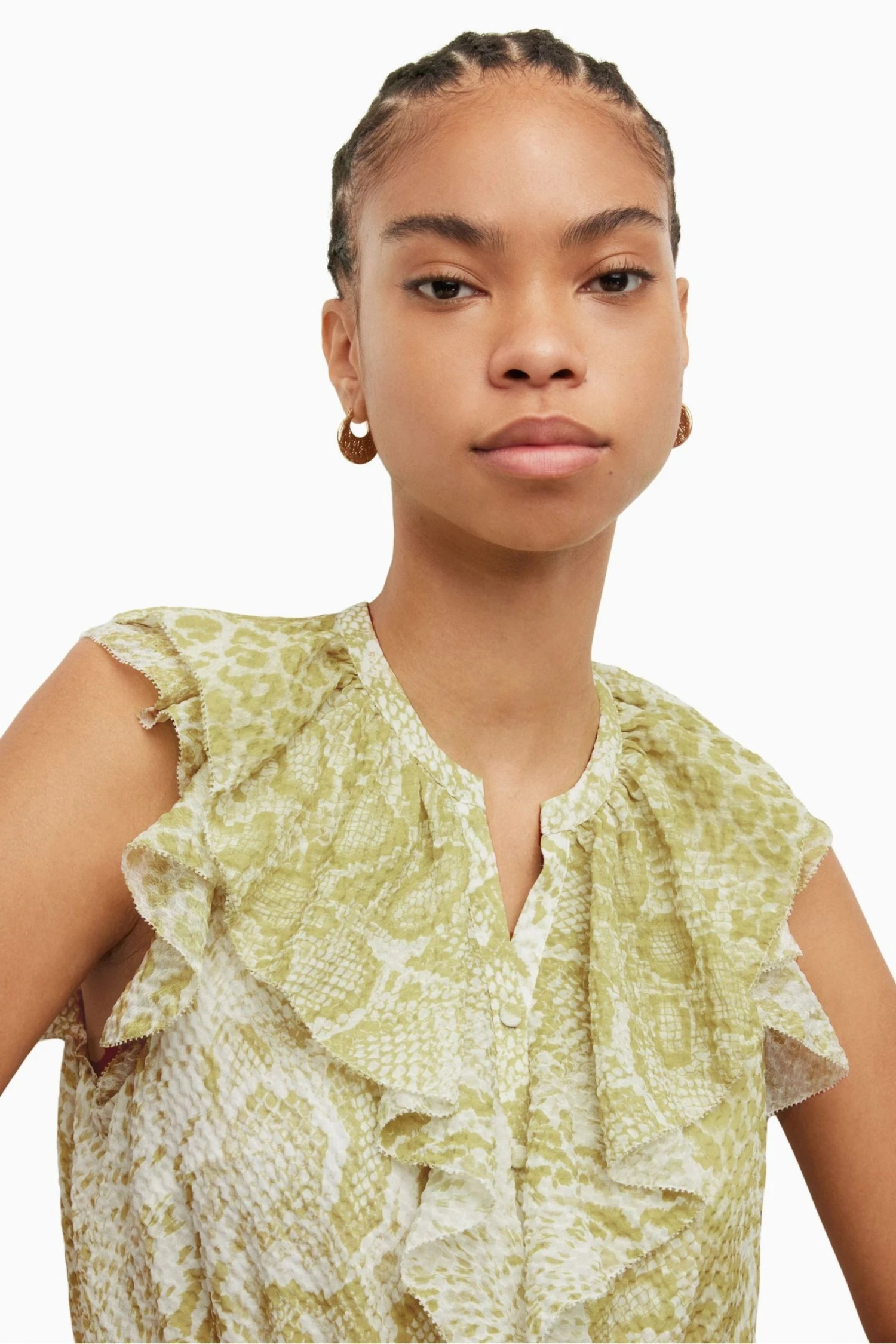 A pull-over design featuring a round neck and a sleeveless design.