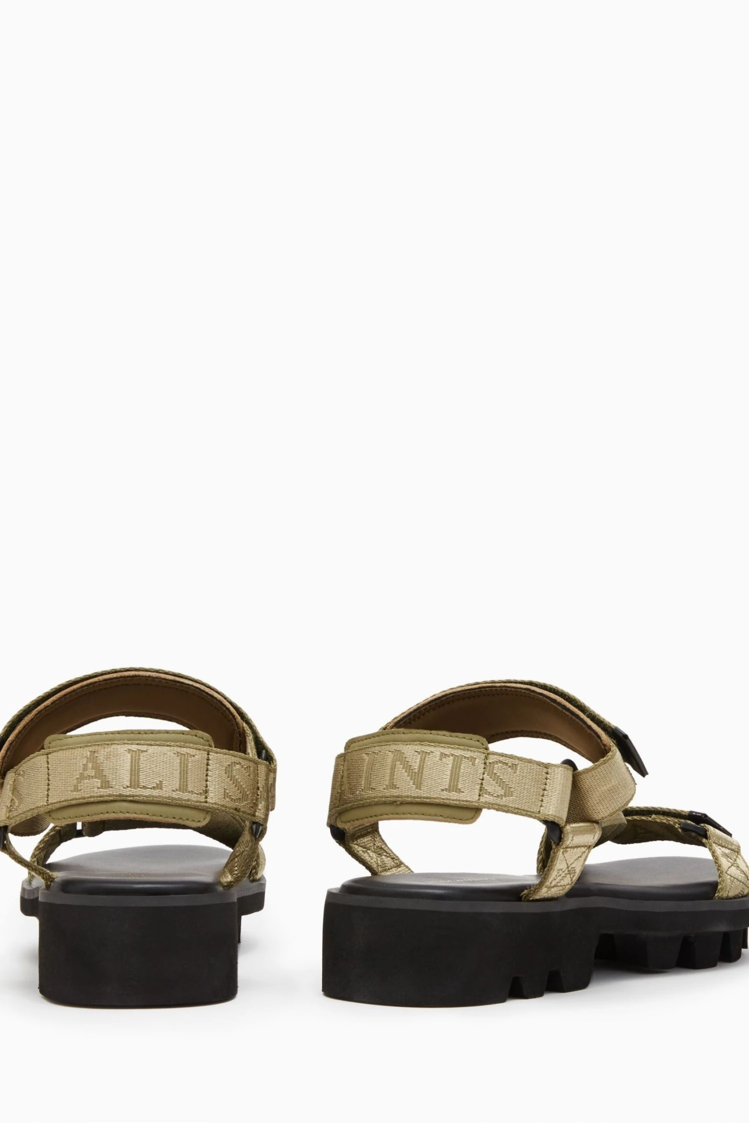 Tonal branded webbing tape with metal branded strap ends. On cleated military style sole.