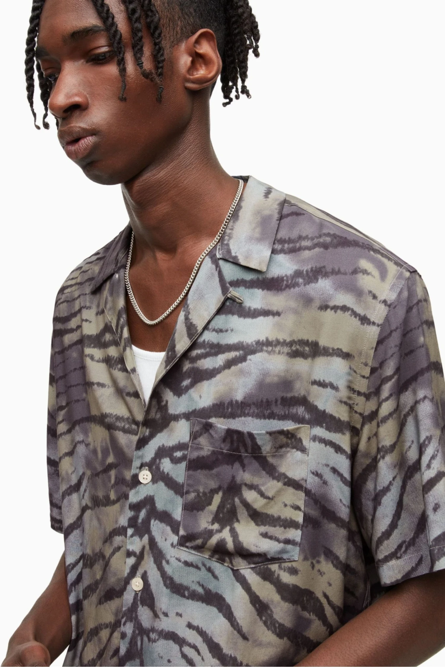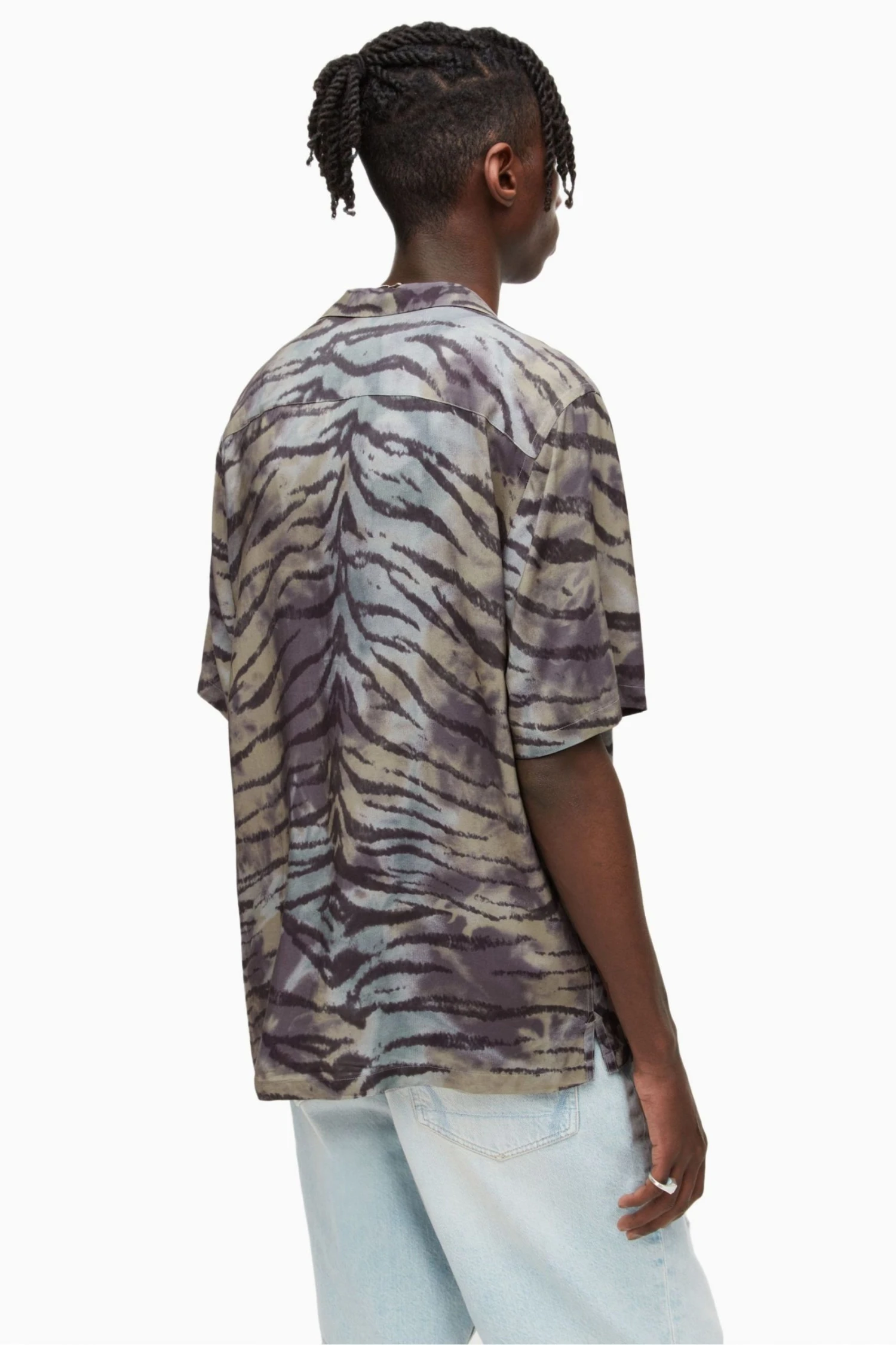 The relaxed fit, camp collar short sleeves buttoned Hawaiian Shirt with Tiger stripe print motif and over tie dye effect and left chest pocket.