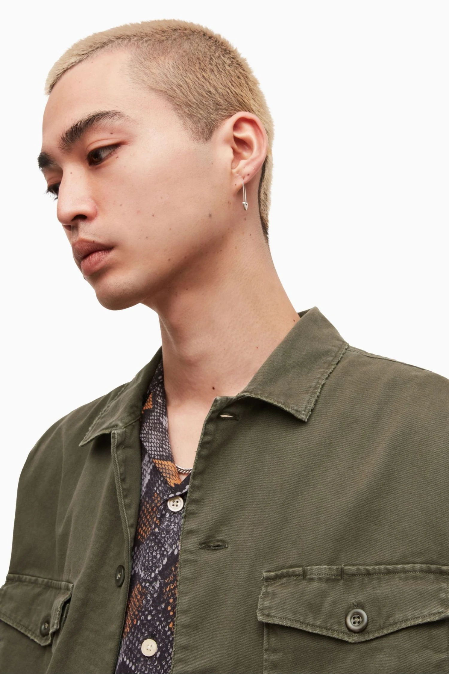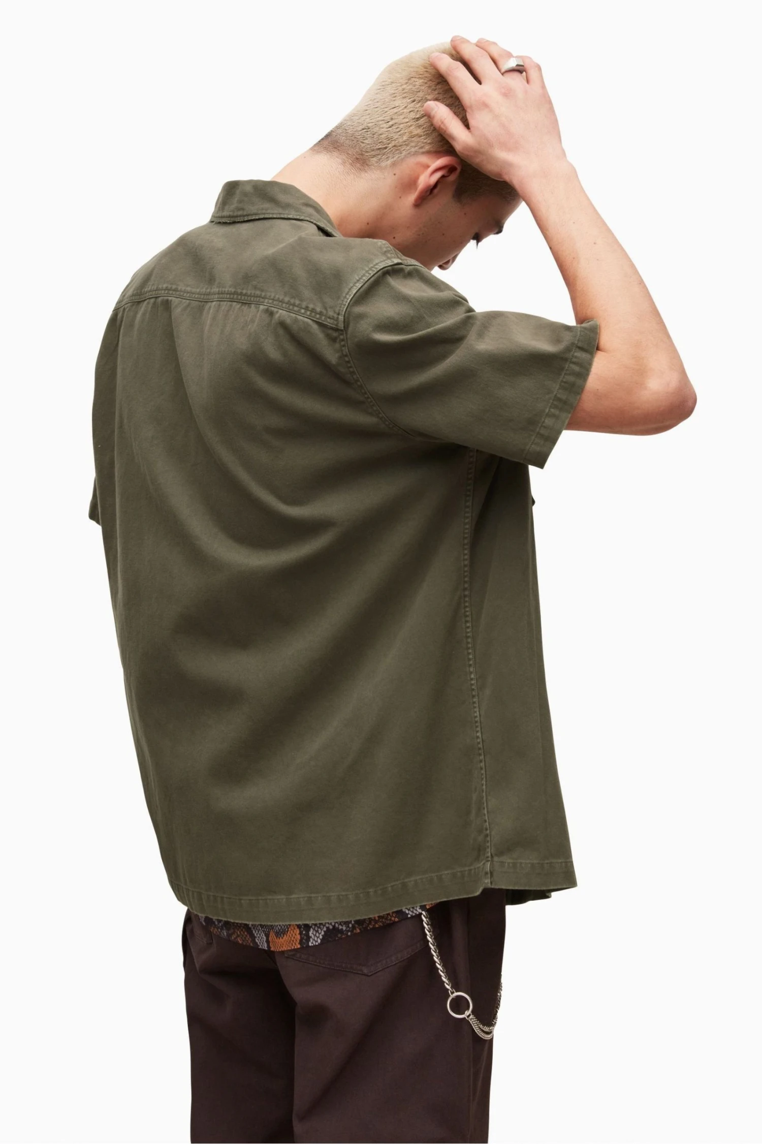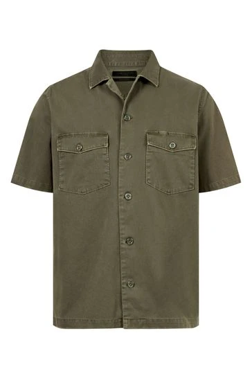 Old-school military. The Spotter, inspired by classic army overshirts. Heavily-laundered cotton, with large buttons and patches of distressing. You can just chuck it on. Short sleeve. Button up closure. Camp collar. Chest pockets. Model is 6’1″/185cm and is wearing size Medium.