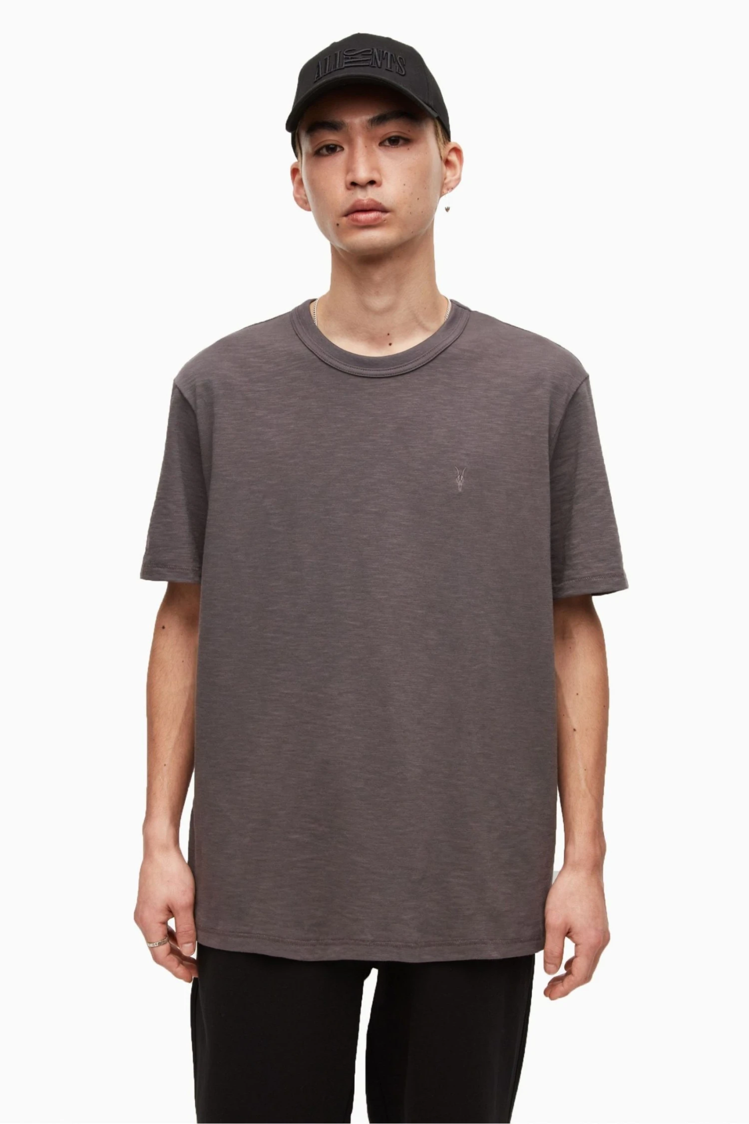 Designed with 100% organic cotton, herringbone BNT, scar stitch on hem and cuffs, bound on neckband with twin needle detail, and ramskull embroidery to left chest.