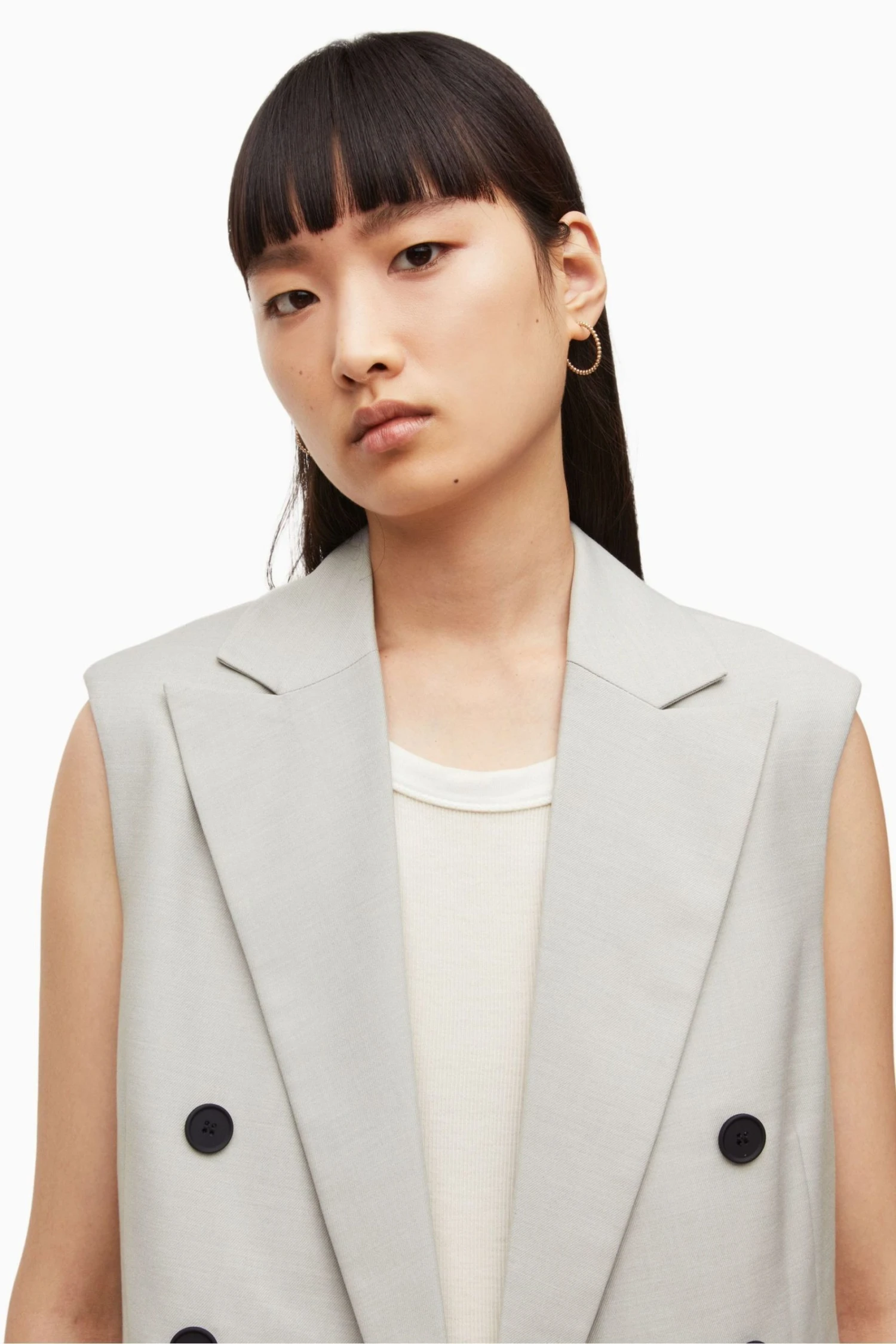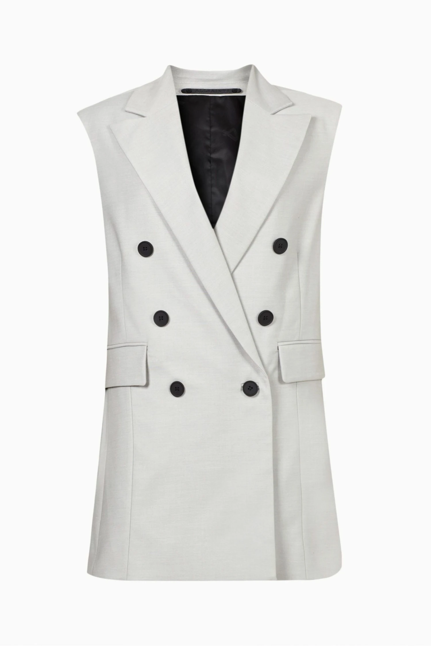 It’s a double breast and relaxed fit jacket. Sleeveless design. Designed with collar, short length. Featuring straight silhouette with peak lapel, two flap pockets and matt black buttons, one internal pocket and made with branded jacquard lining.