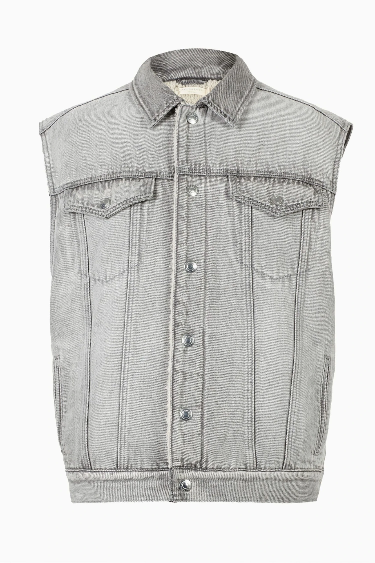 Grunge aesthetics, the AllSaints way. The Kaimuki Jacket has a classic trucker construction, but sleeveless. Heavy washed grey denim with a borg lining. Layer it up. Sleeveless. Push stud closure. Trucker style. Front yoke and pannelled details. Two chest pockets. Borg lining. Side welt pockets. Heavy washed denim. Worn with Honshu Shirt Jacket, Patched Hoodie and Trueno Belt Chain. Model is 6’1.5″/187cm and is wearing size Medium. ALLSAINTS cotton products support more sustainable cotton farming. Better Cotton is sourced via a system of Mass Balance.