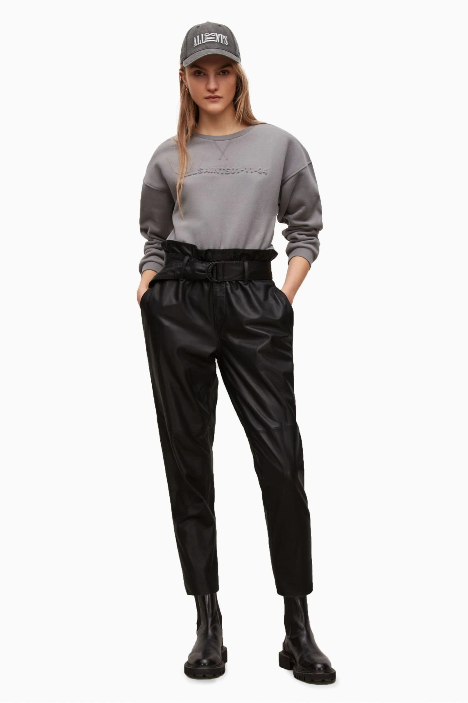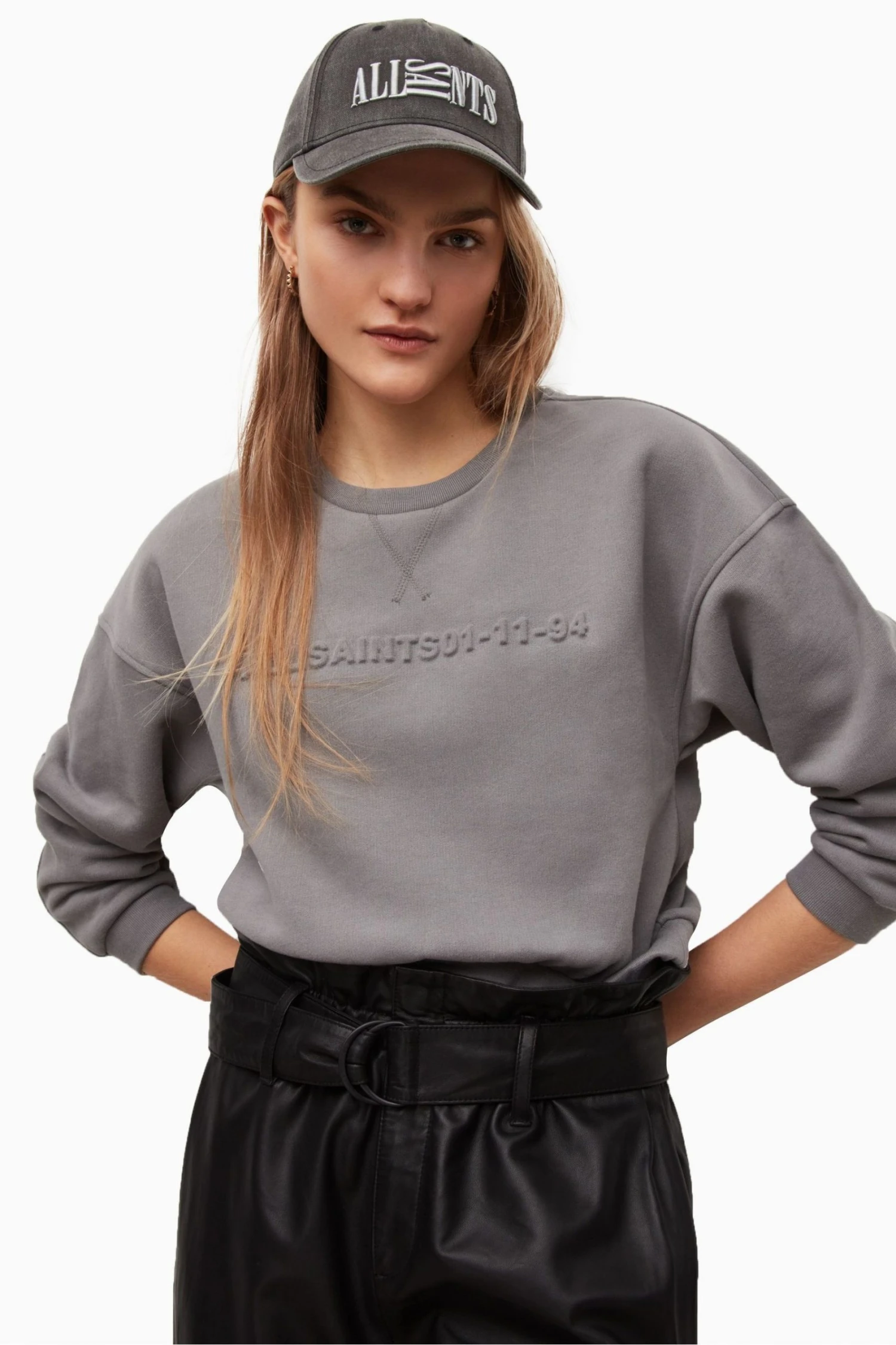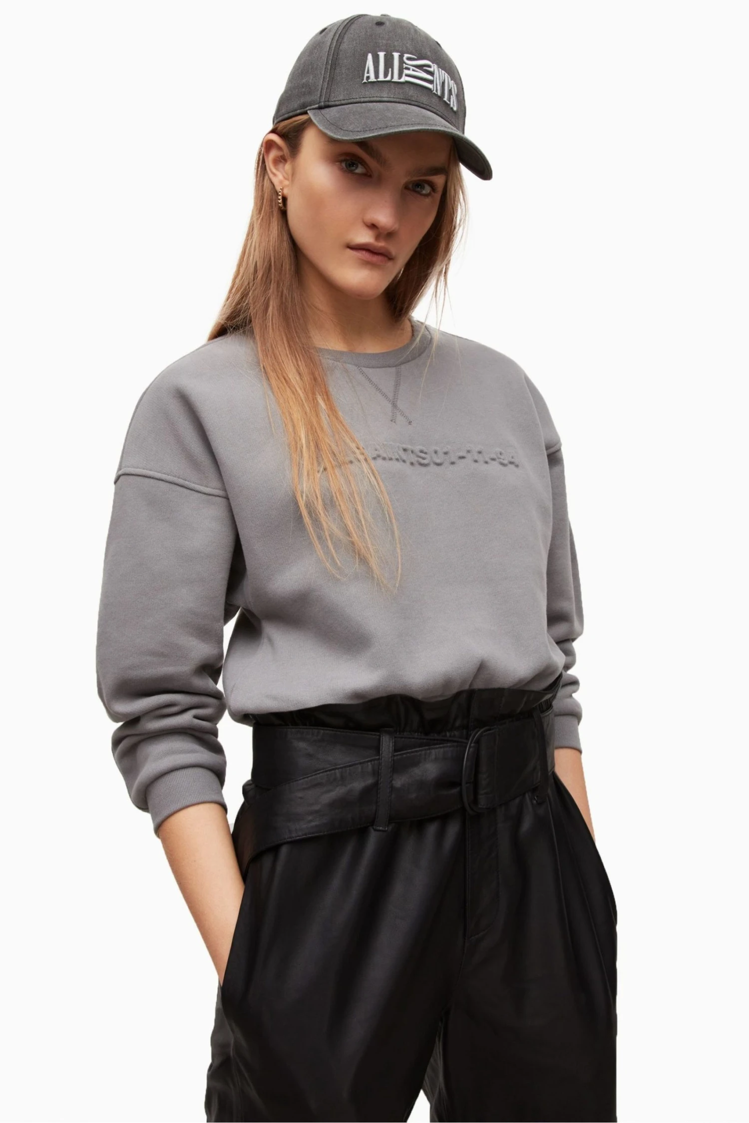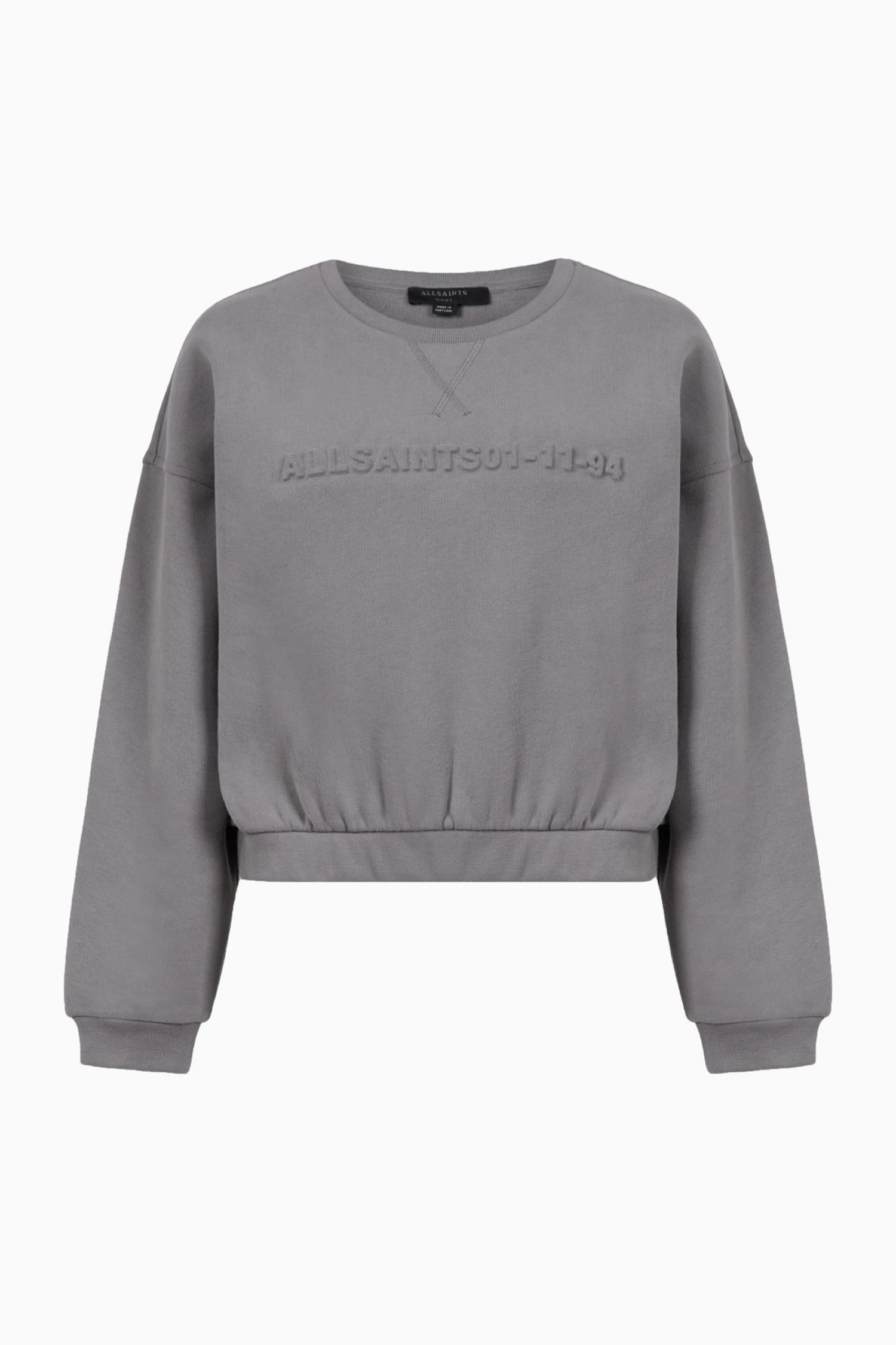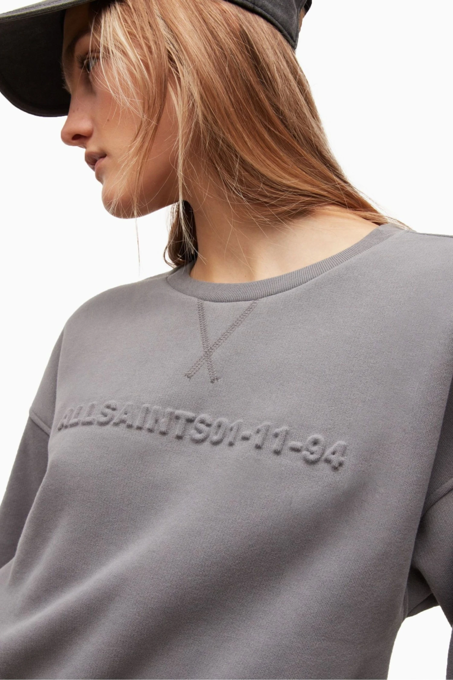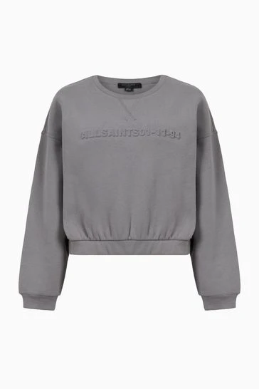 Pull over. Relaxed fit. Short length. Crew neck. Long sleeve. The Rei Sweat is a cropped shape with elasticated band at the hem. With Allsaints branding across the centre front chest in a tonal embossed technique. No Pockets.