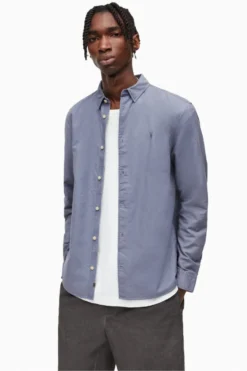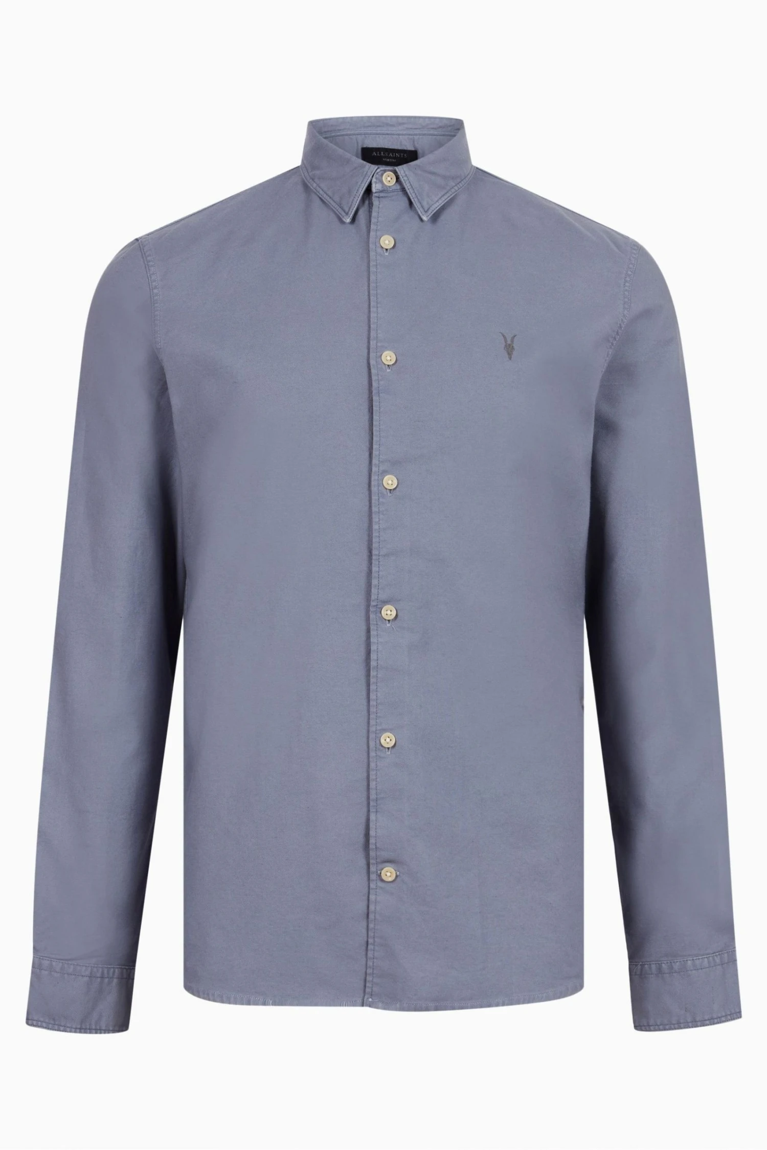 Classic collar with button closure and long sleeves. Oxford style. AllSaints metal branded tab. Ramskull embroidery. Relaxed fit.