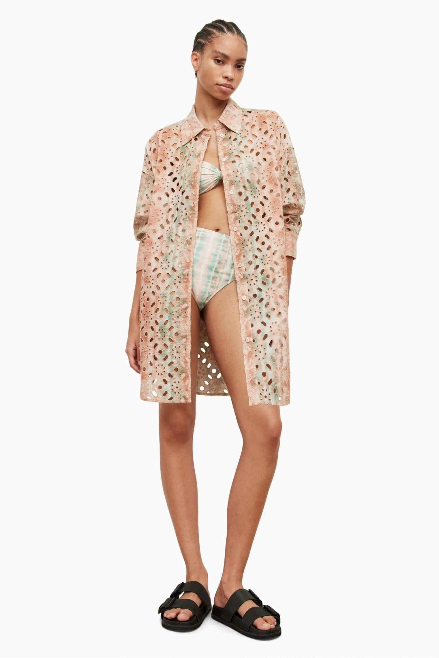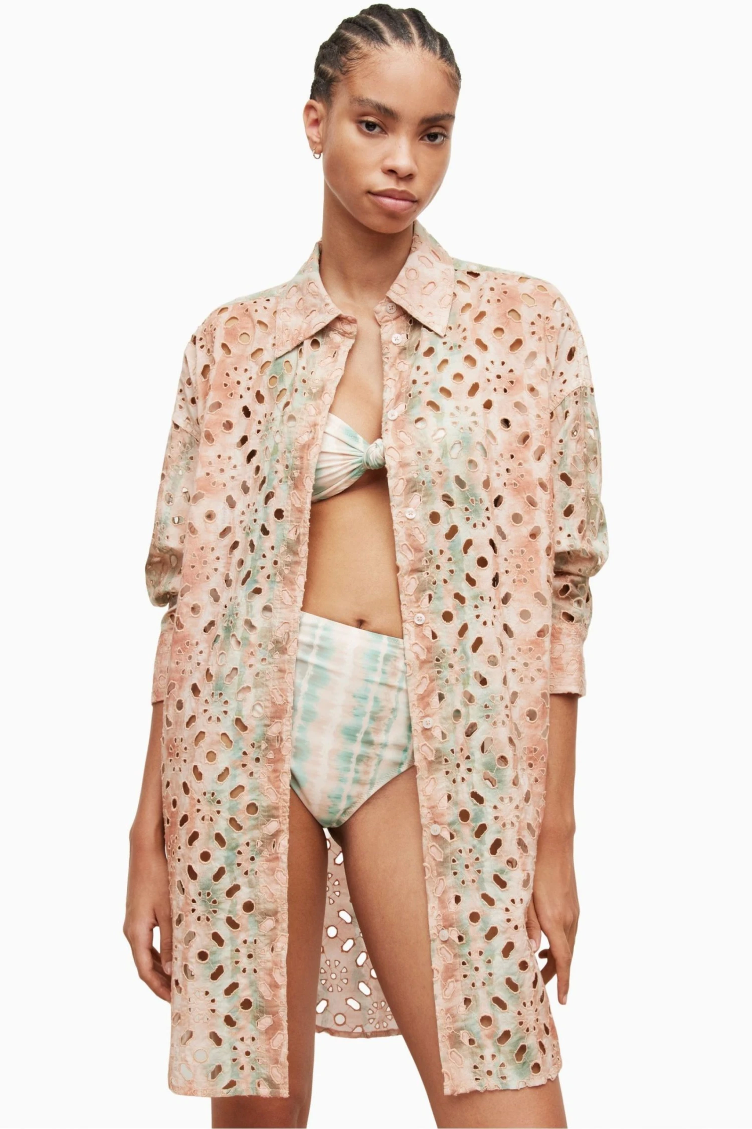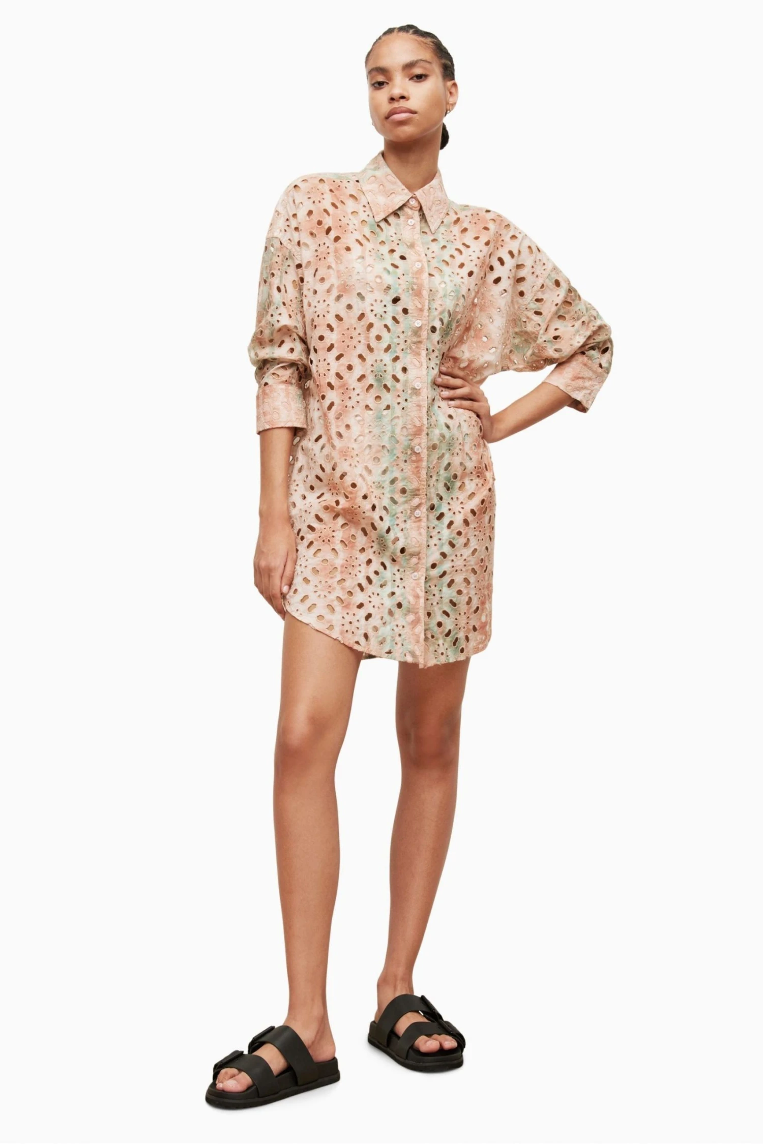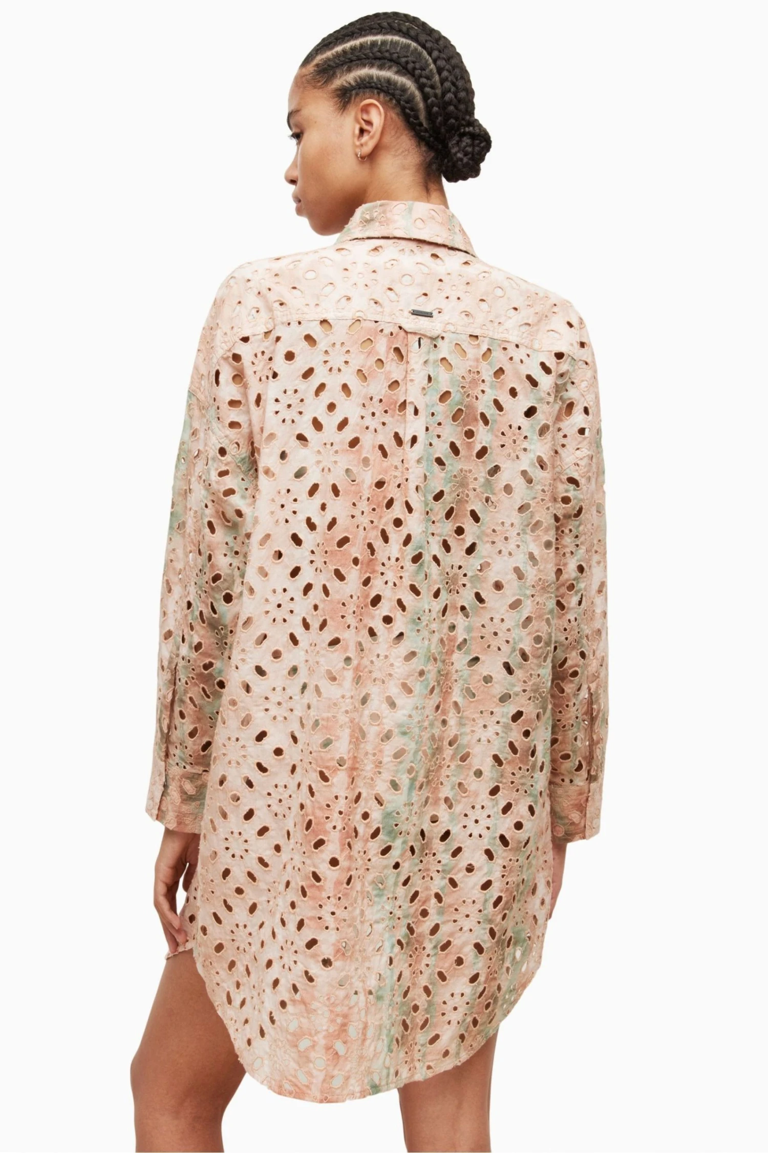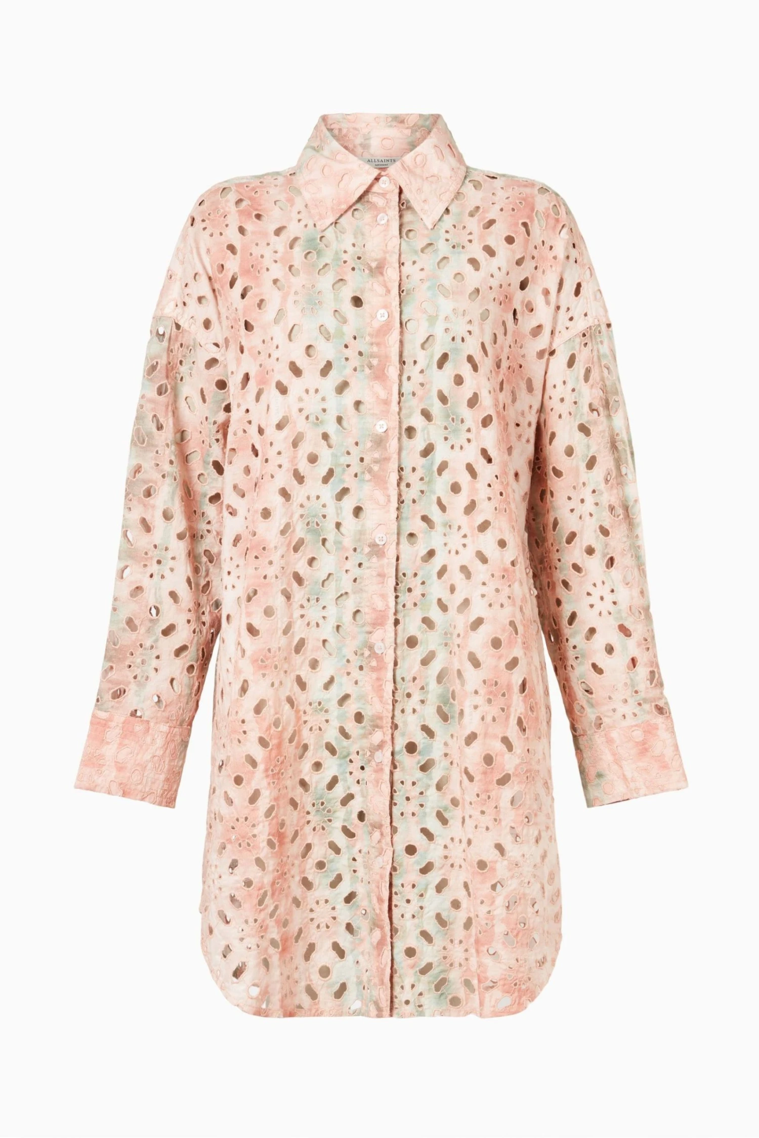 Button closure. Collar. Long sleeve. Oversized short shirt dress. Made in a cotton broderie with open cut out artwork and printed on top. Buttons run along the front. No Pockets.