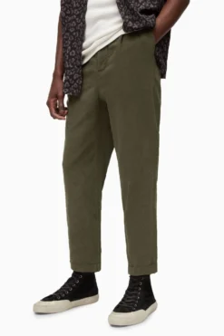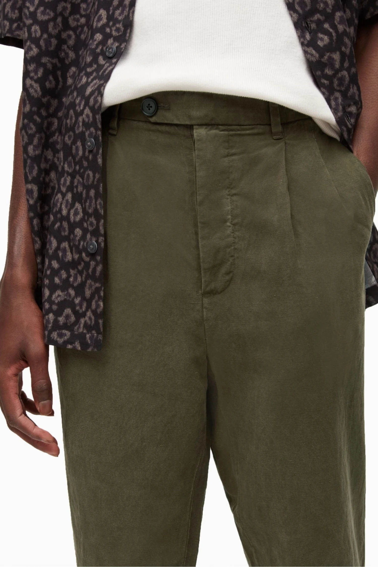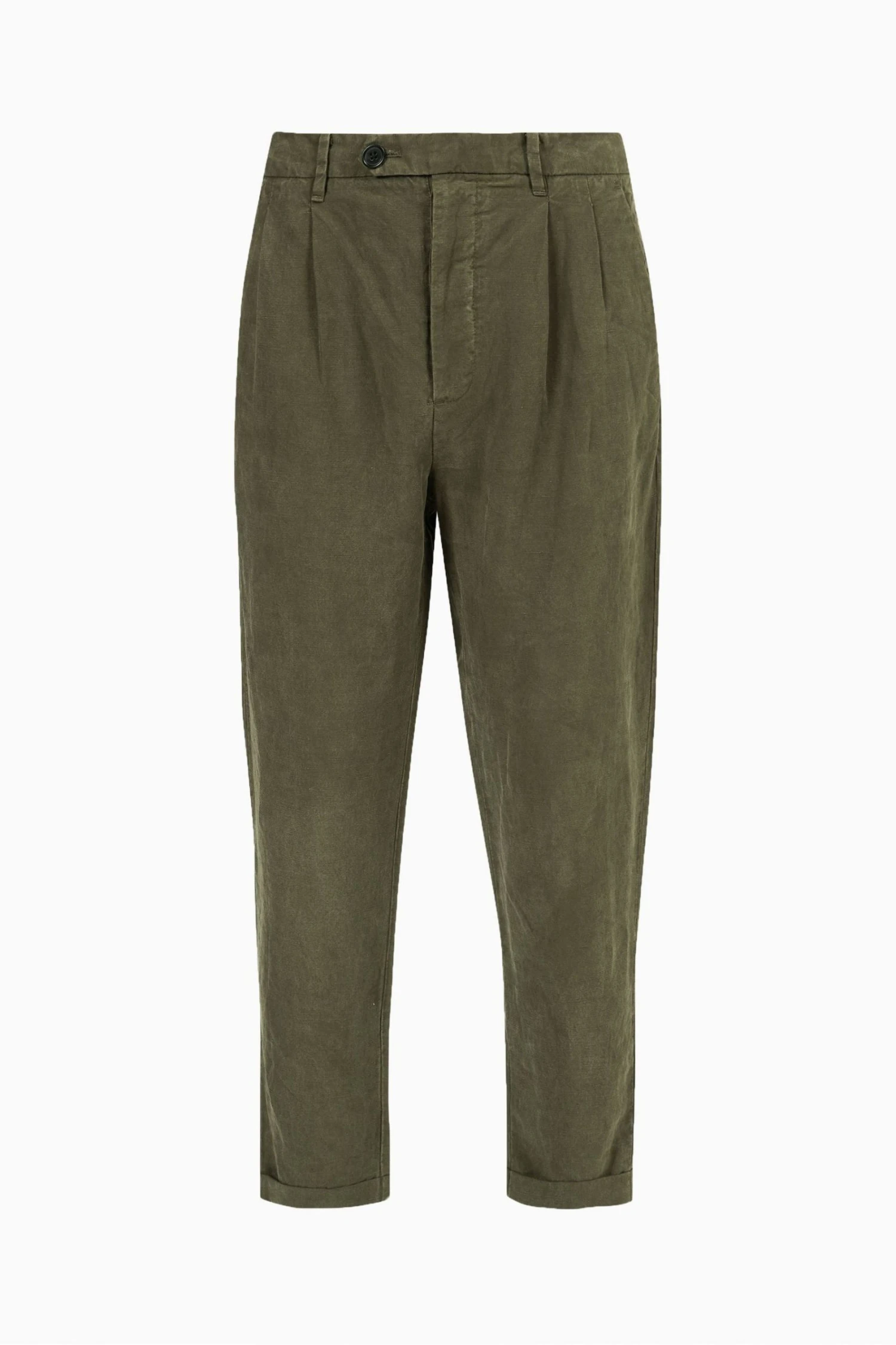 Button fly. Mid-rise. Regular length. Pleated front. Fixed turn up. Side and back pockets.