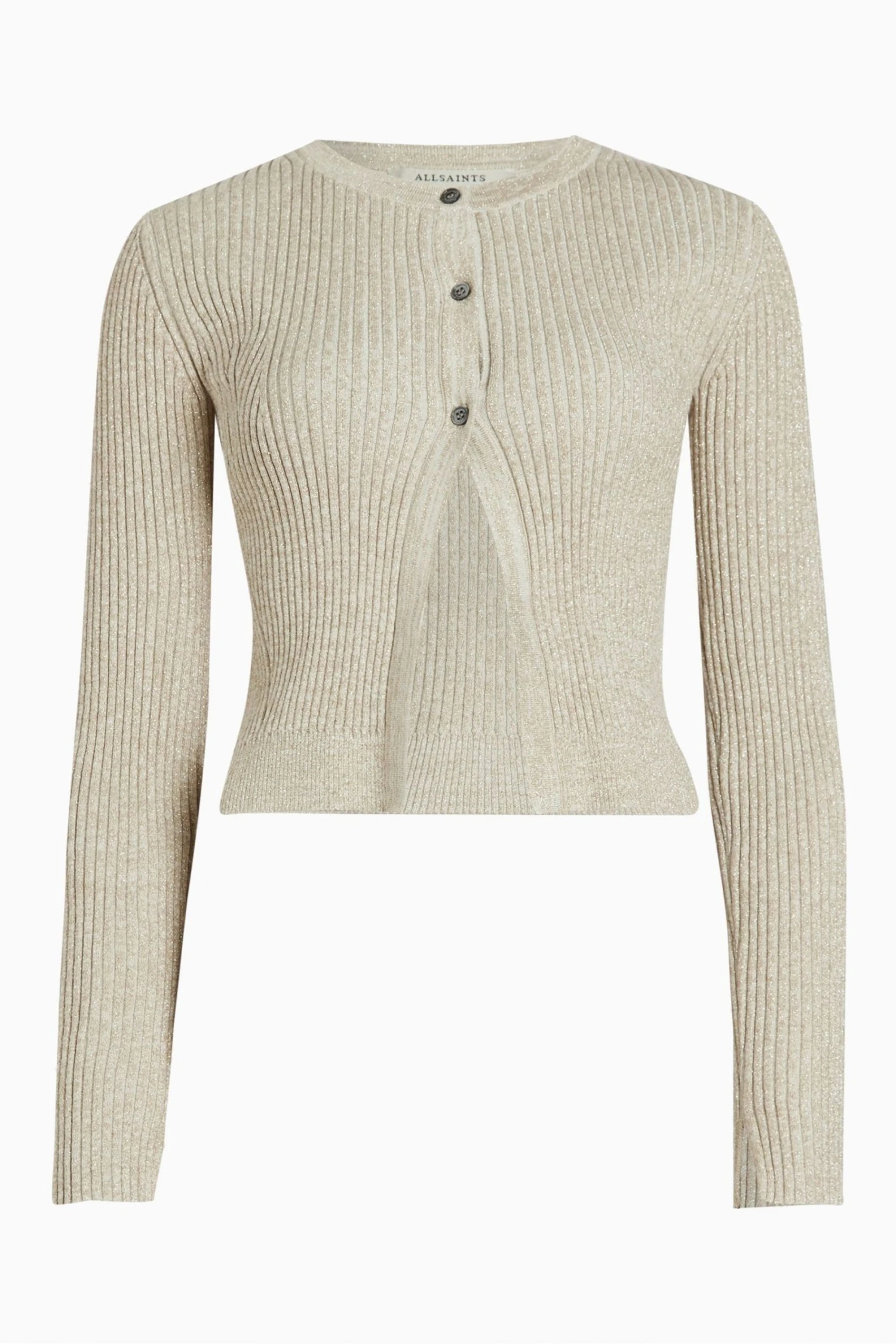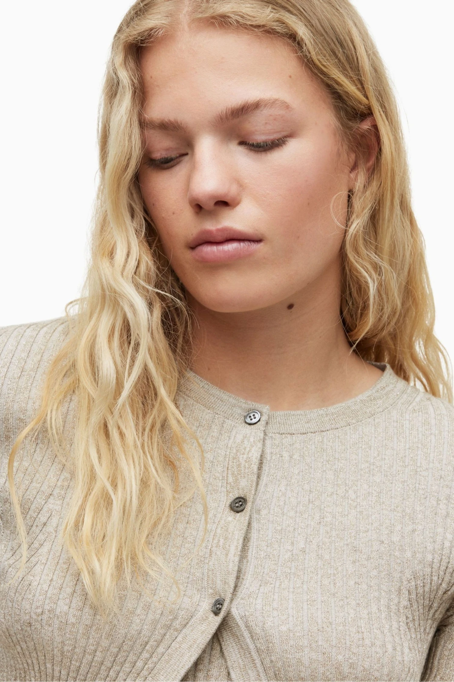 Featuring button closure, a crew neck, and long sleeves. Cropped neat fitting cardigan knitted in rib stitch with metalised fibres. Splits at the cuffs. Fastens with small branded metal buttons. No Pockets.