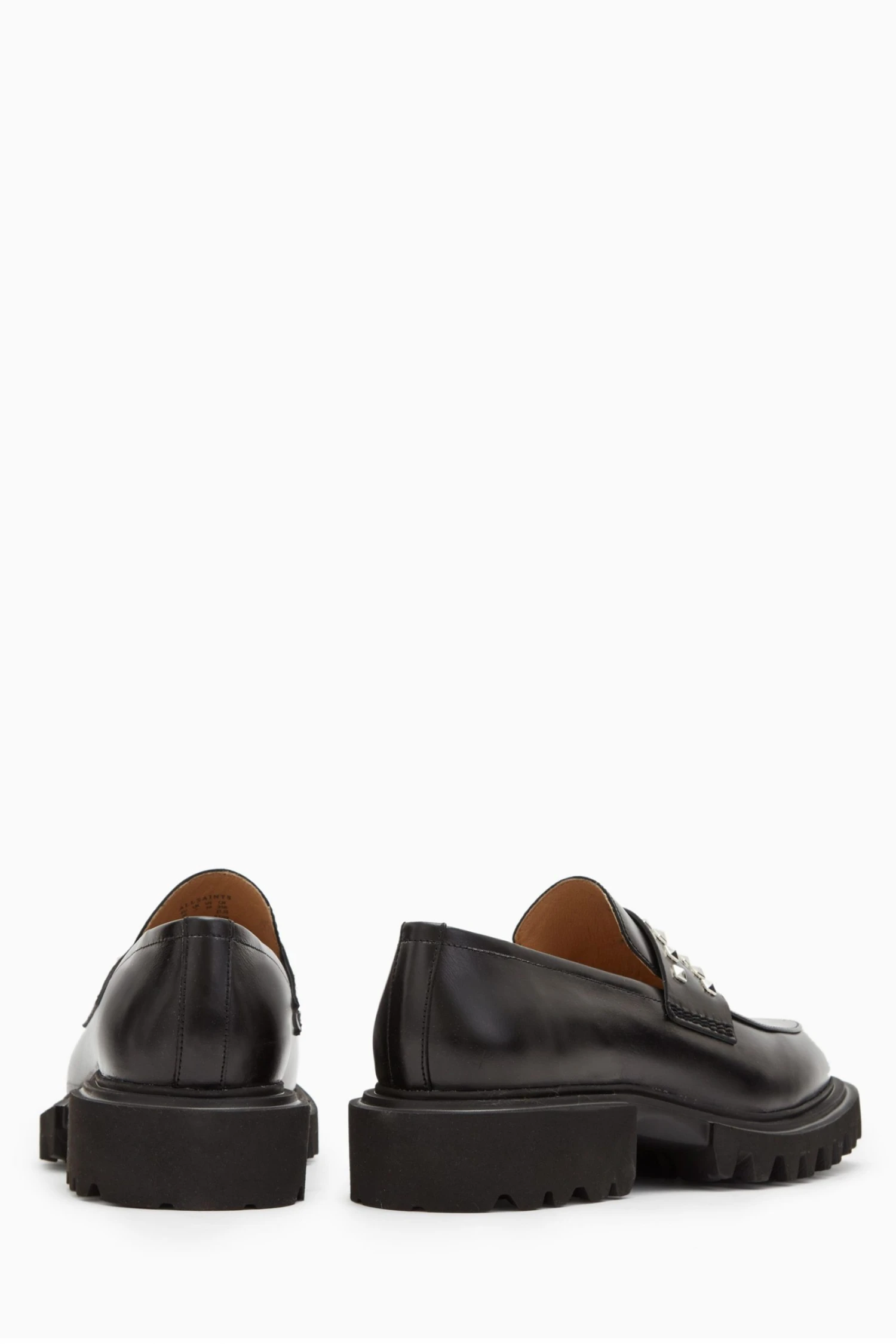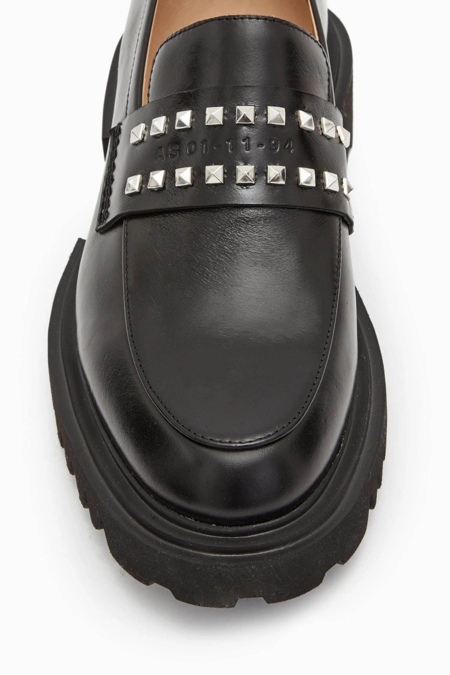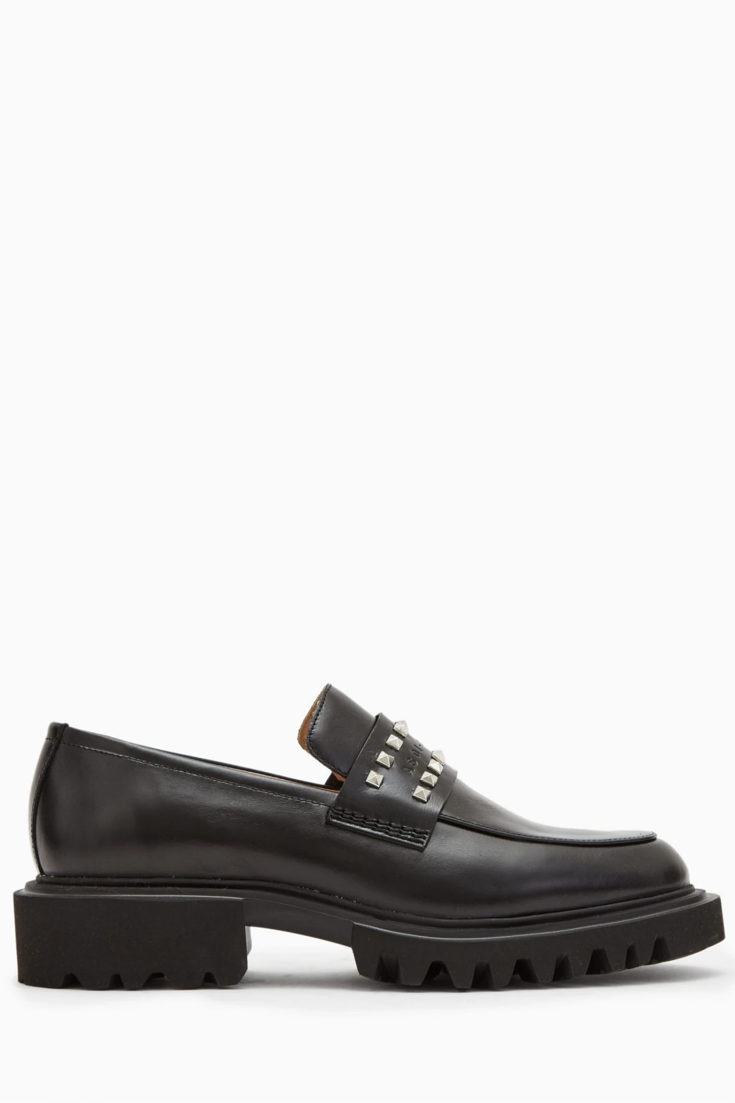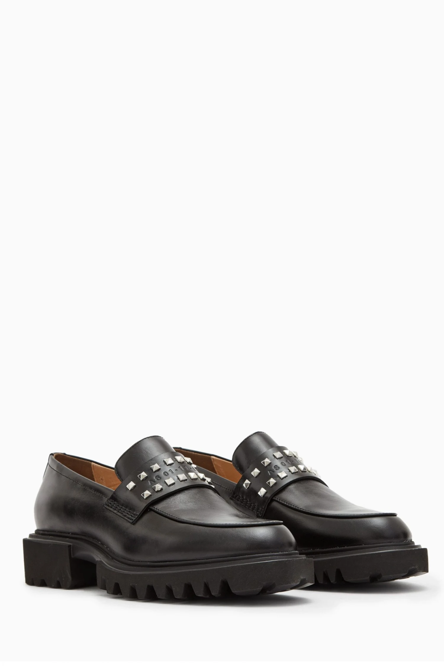 Featuring round toe, high Shine Leather, loafer style and studded.