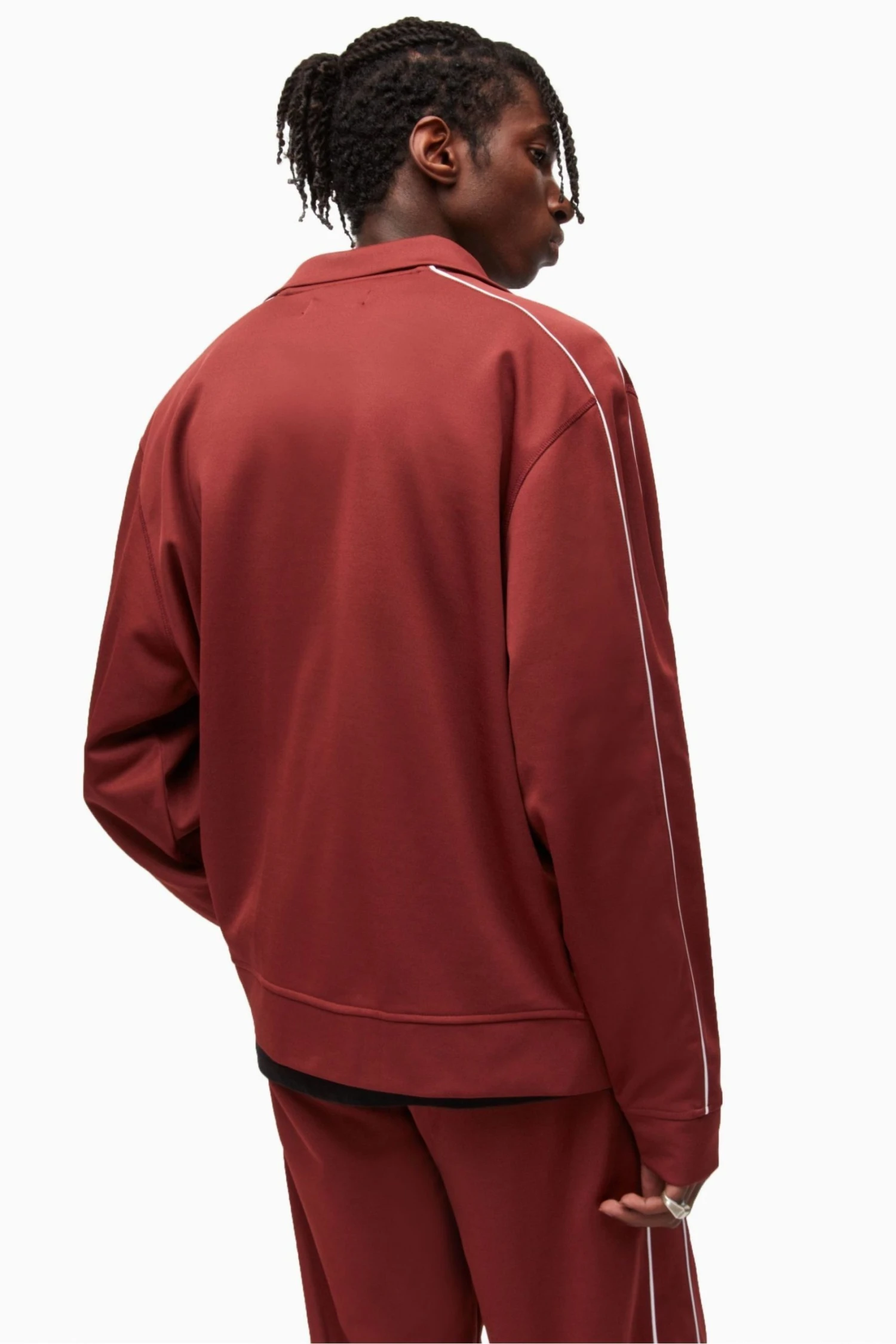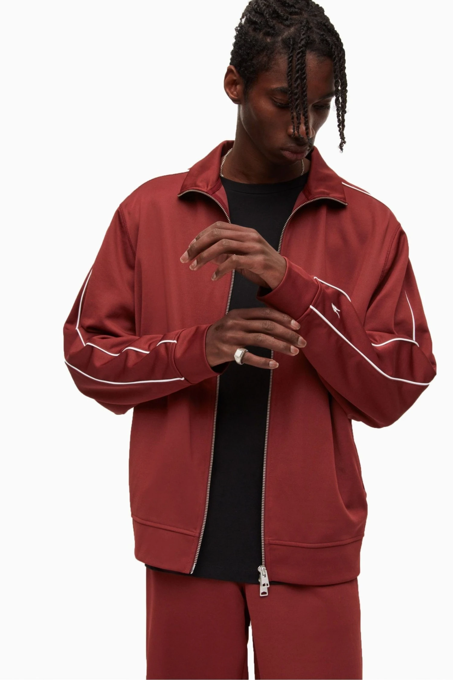 Sleeve Panel with contrast colour piping insert, Self fabric collar,cuffs and waistband, zip closure, Welt Pockets, Ramskull embroidery on left sleeve hem.