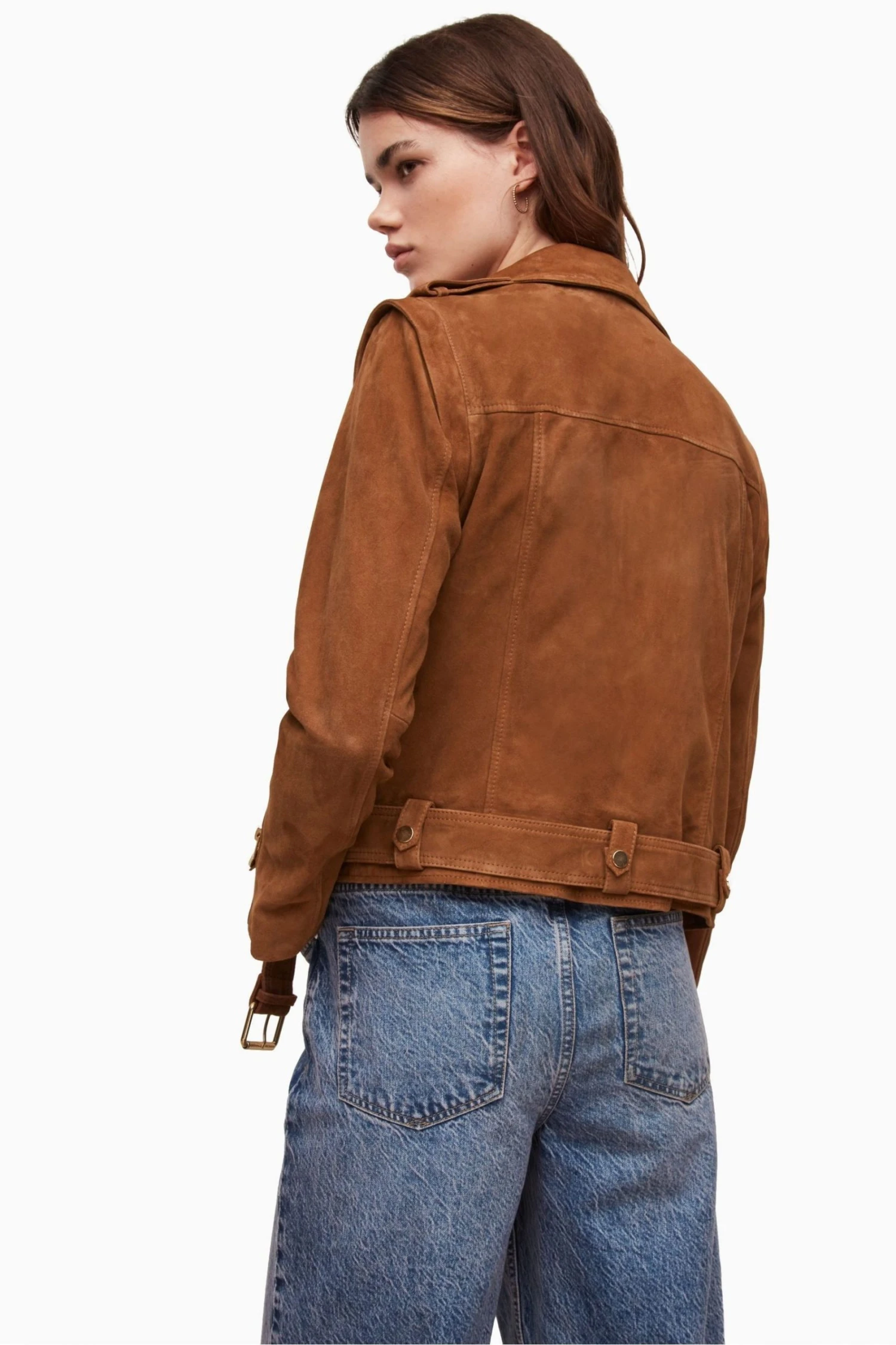 Zip closure. Long sleeves. Collar. 2-In-1. Removable sleeves. Two lower zip pockets. Breast pocket. Ticket pocket. Belt detail. Shiny metal hardware. Chrome free suede. Recycled lining. AllSaints leather products support responsible manufacturing via the Leather Working Group. Regular fit.