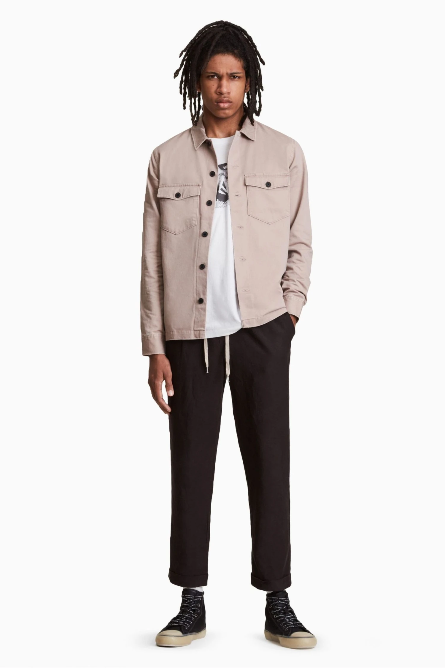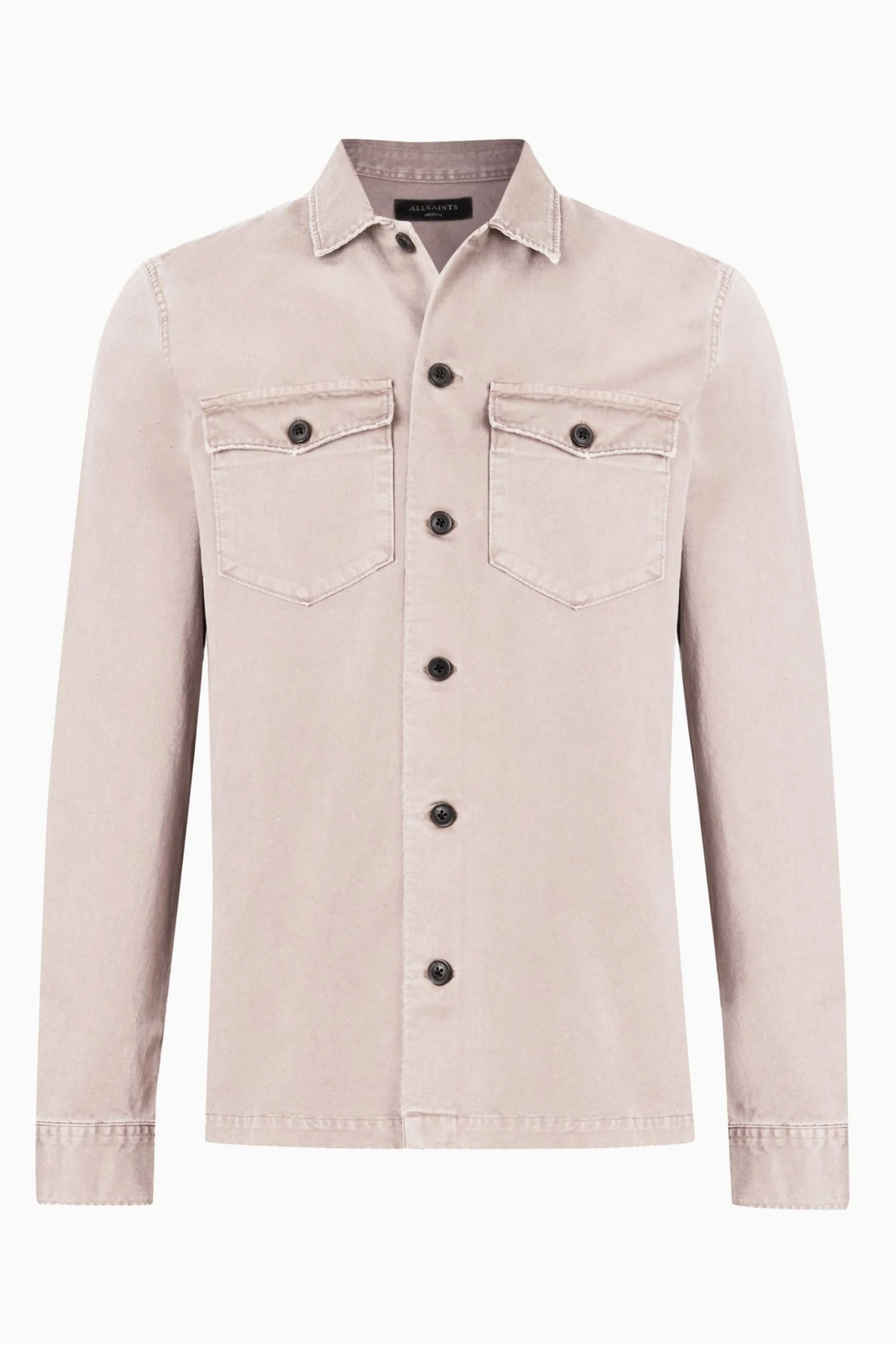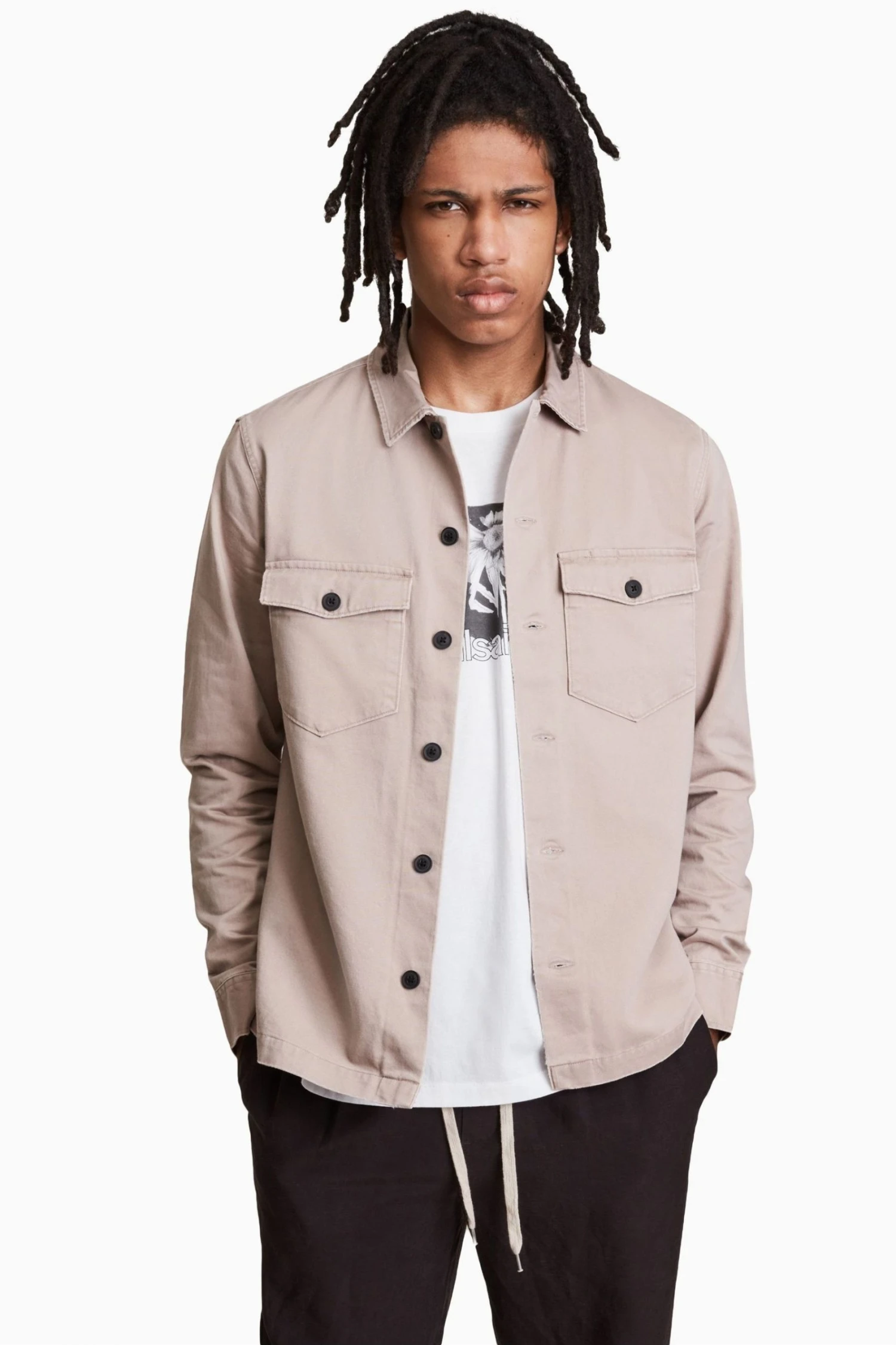 Camp collar. Button closure. Chest pockets. Light distressing. Long sleeve