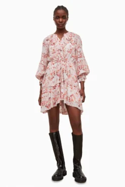 V-neckline. Button closure. Long sleeves. Drawcord waist. Frill detail at the collar and cuffs. Tiered frill hem skirt. Crinkle sheer fabrication. New season floral print – Momo: it means peach blossom in Japanese. Recycled lining. Sustainable EcoVero™ viscose.