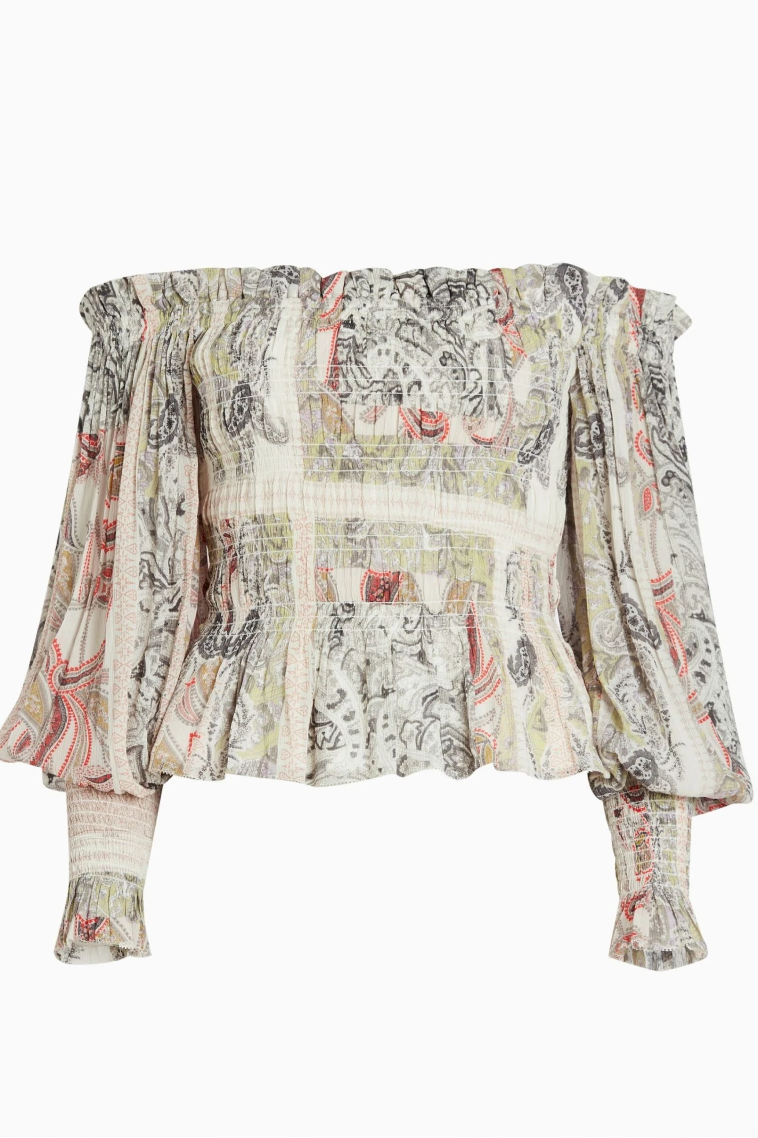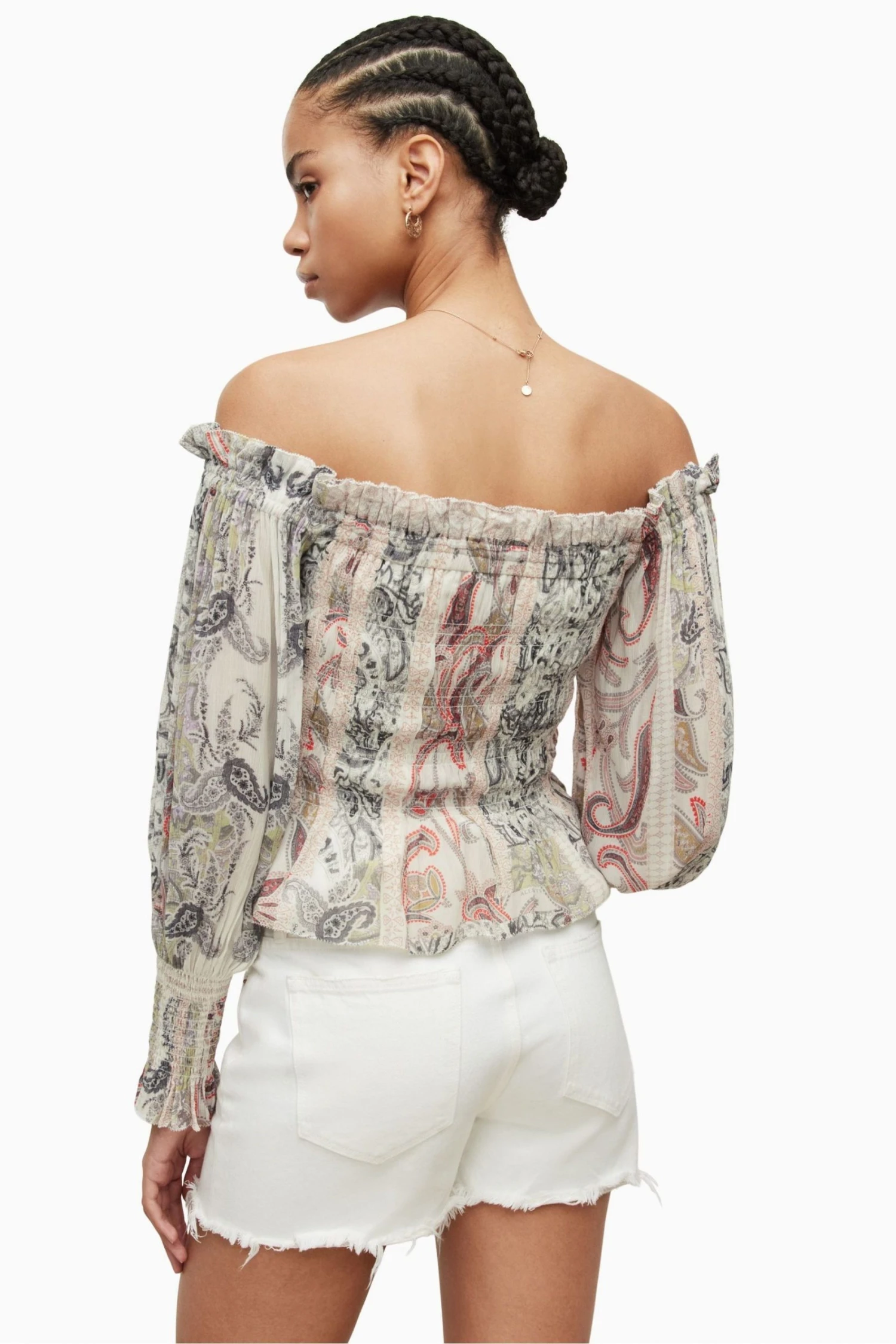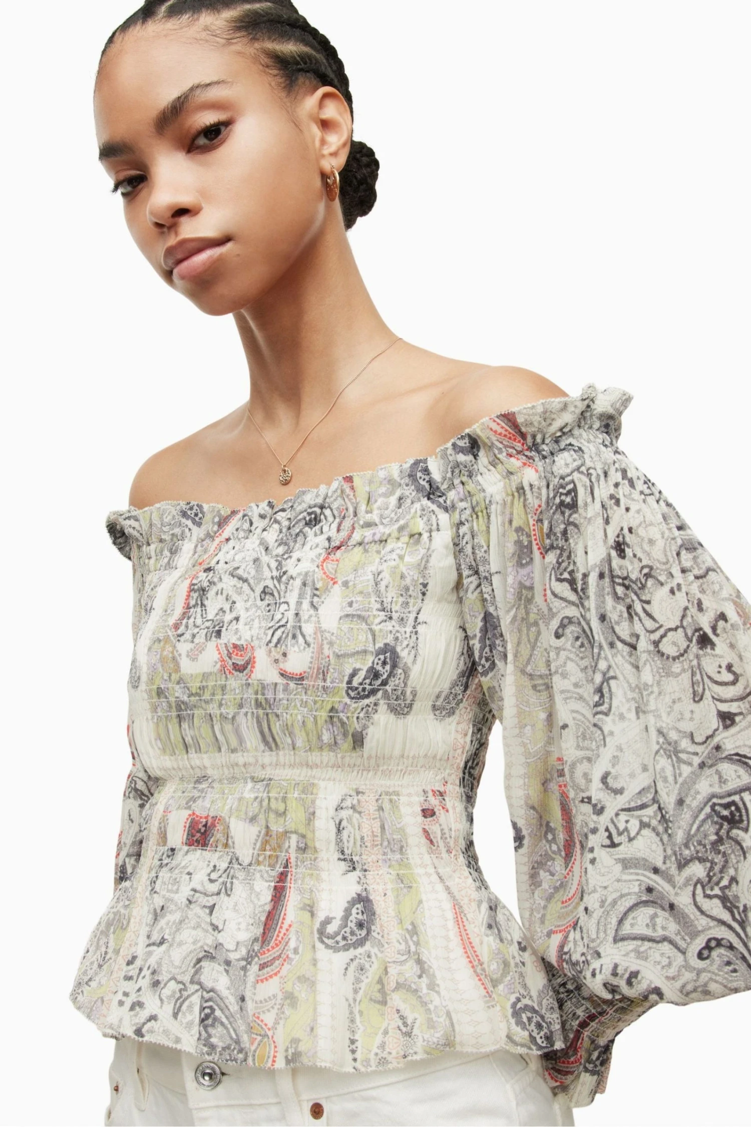 Pullover design with long sleeves and button closure.