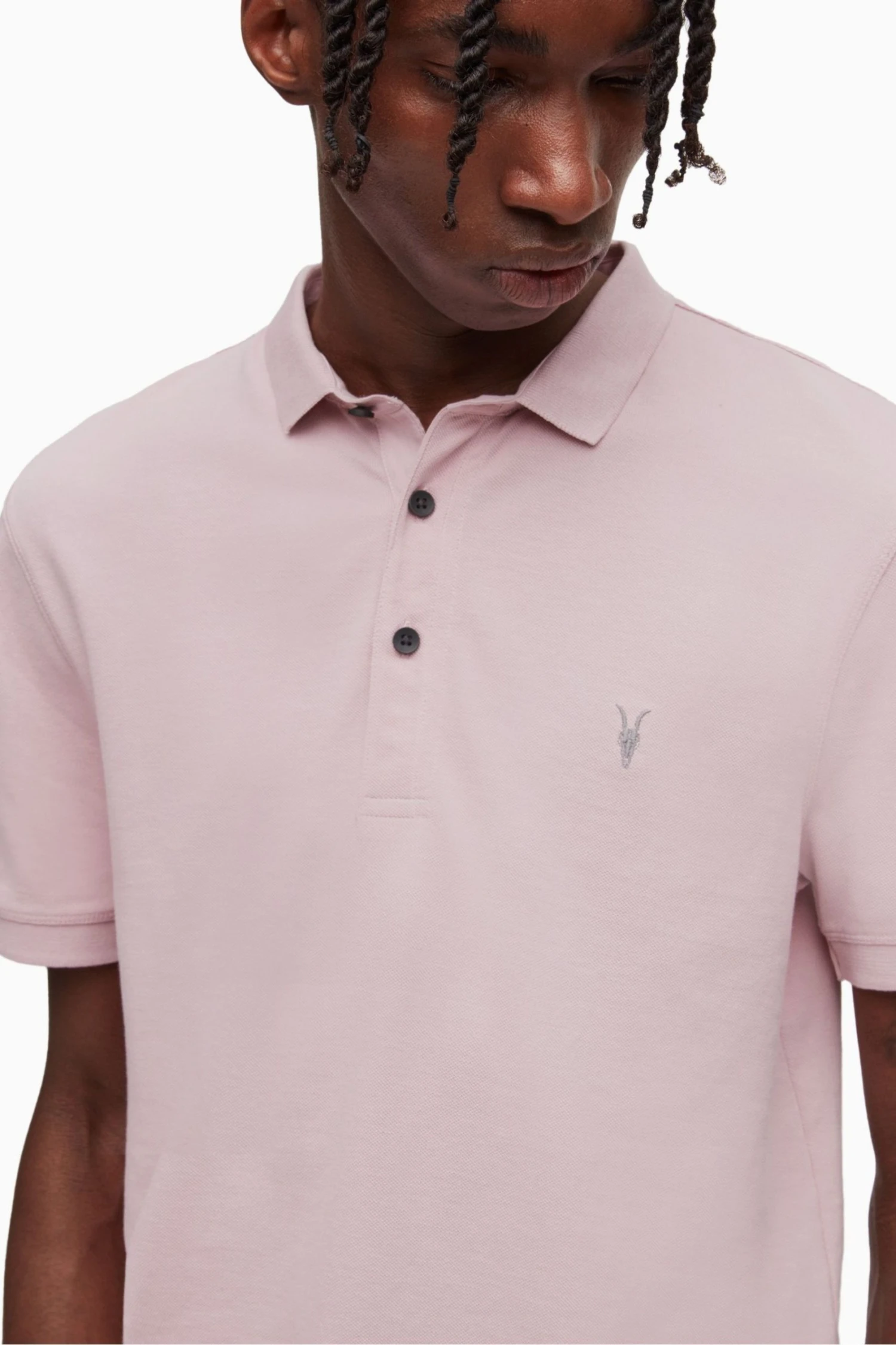 Button closure. Slim fit. Polo collar. Short sleeve. Ramskull Embroidery on left front chest. Classic polo collar. Ribbed cuffs and collar. Three button placket.