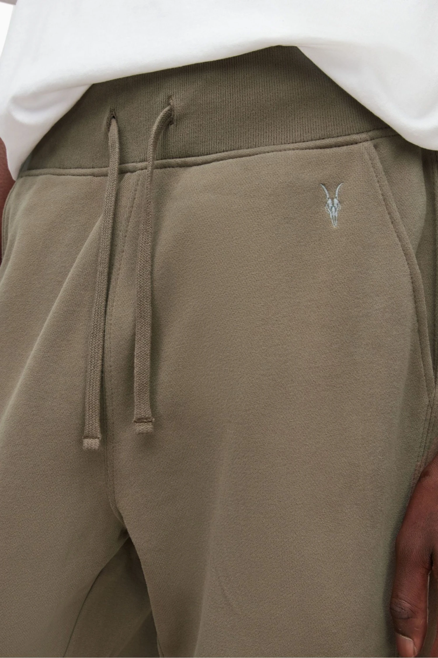 Ramskull embroidery on left front leg with carbon brush finish.