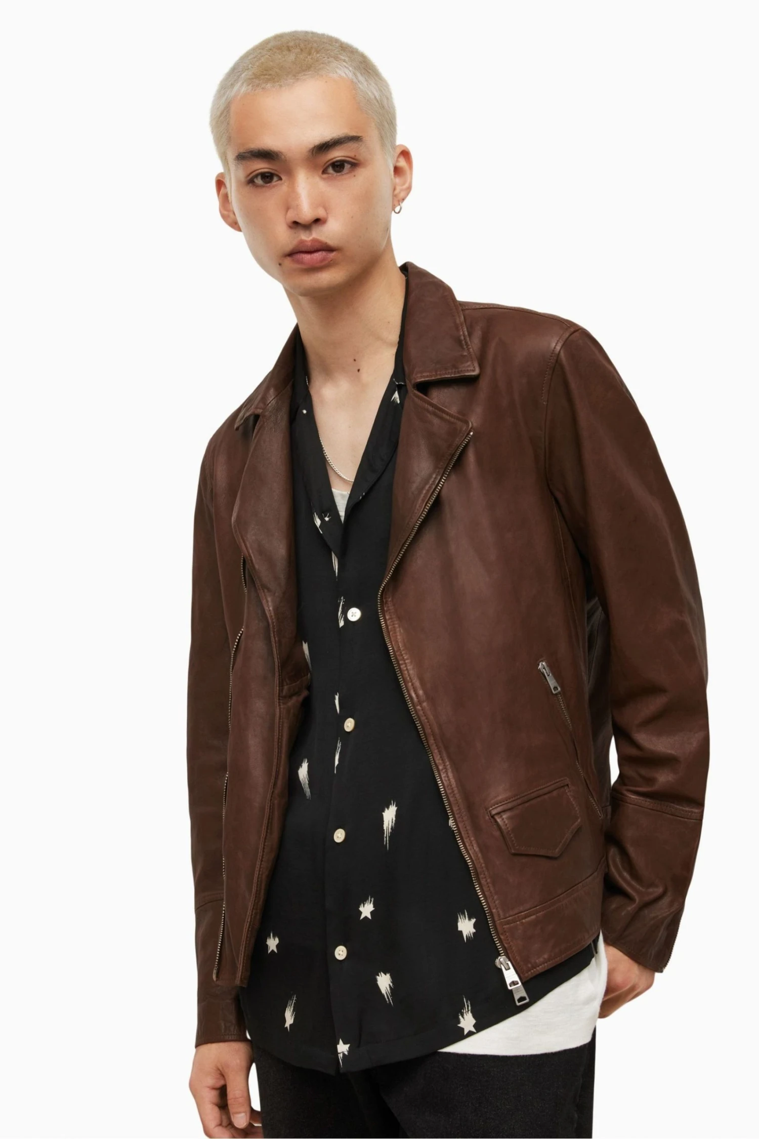 Features a zip closure, collar, lapel and long sleeves.