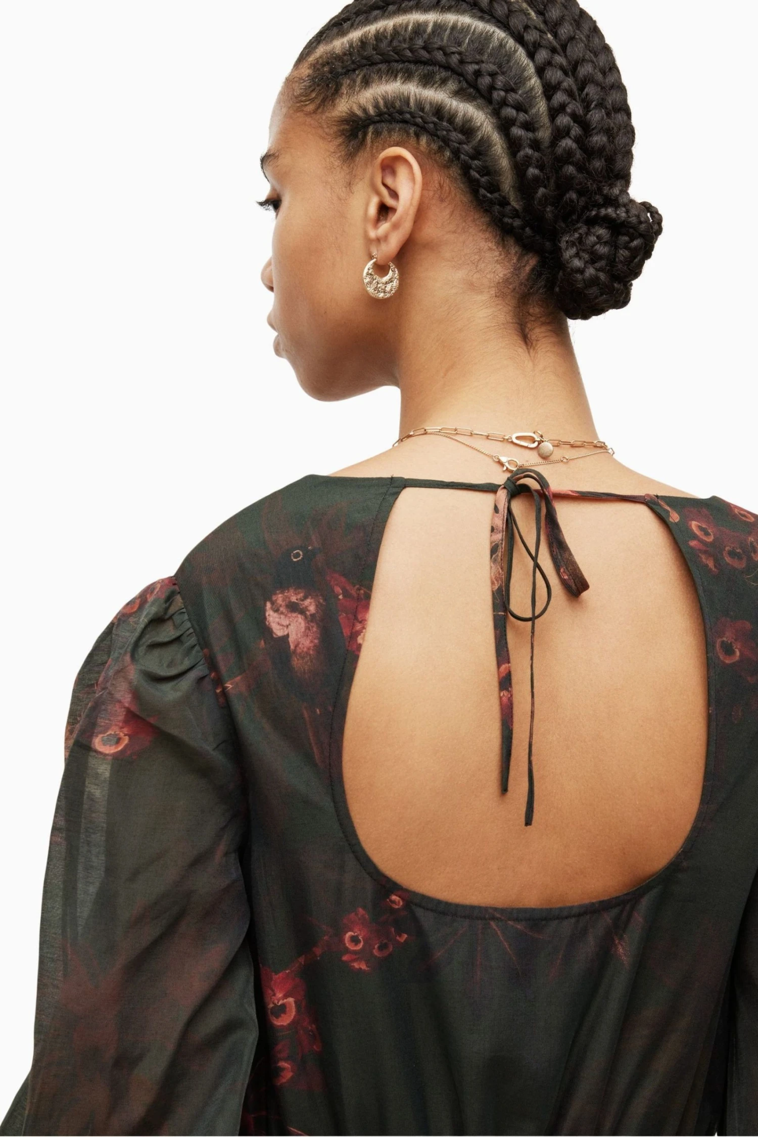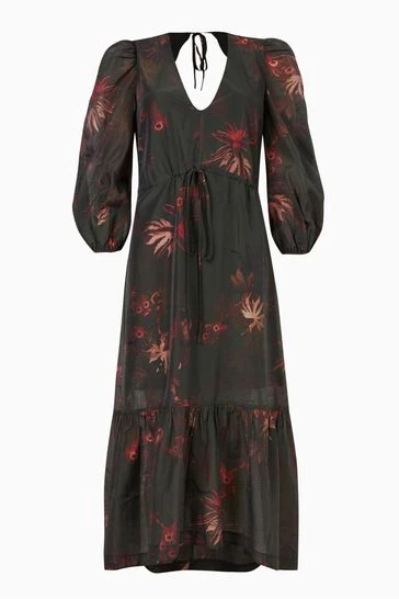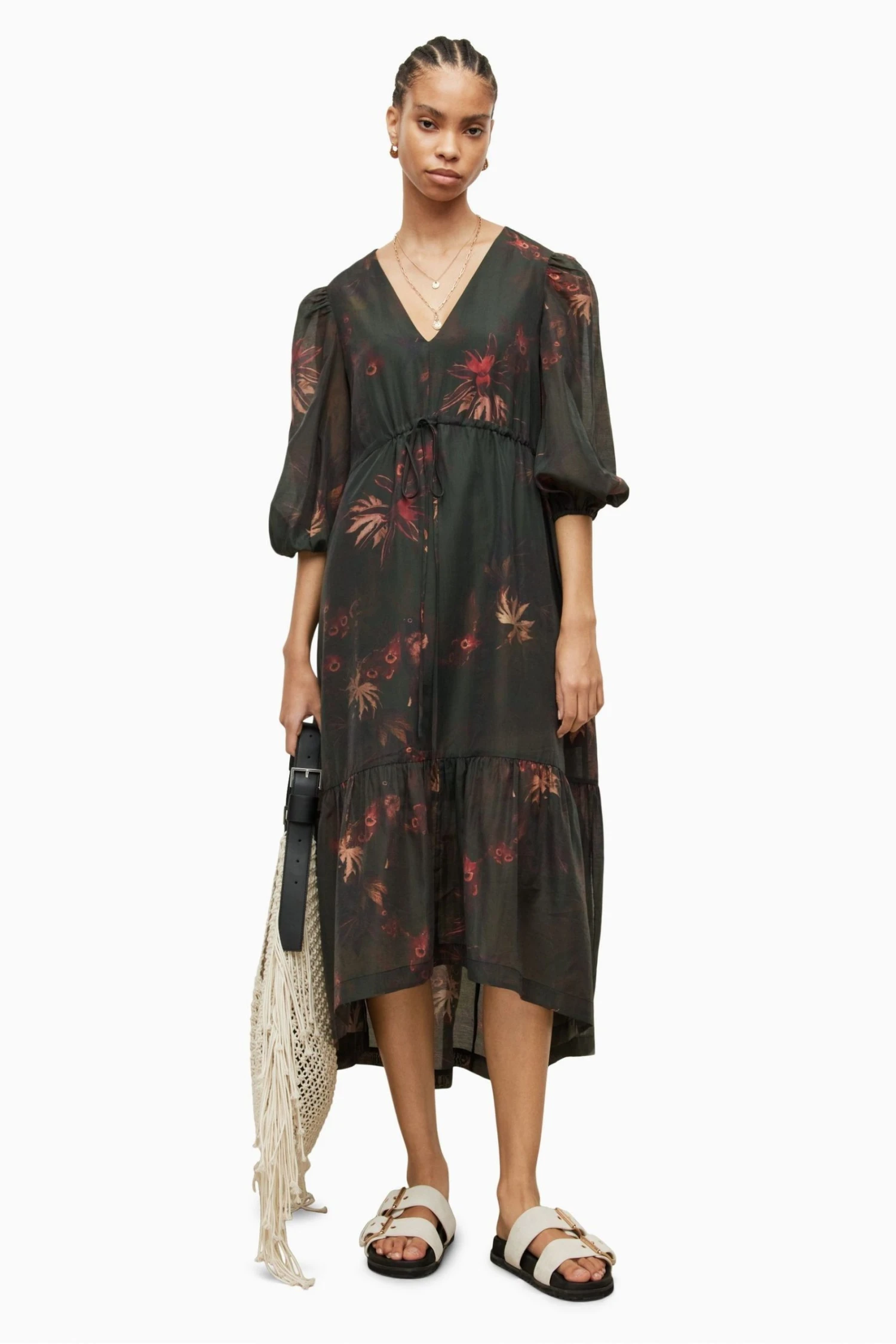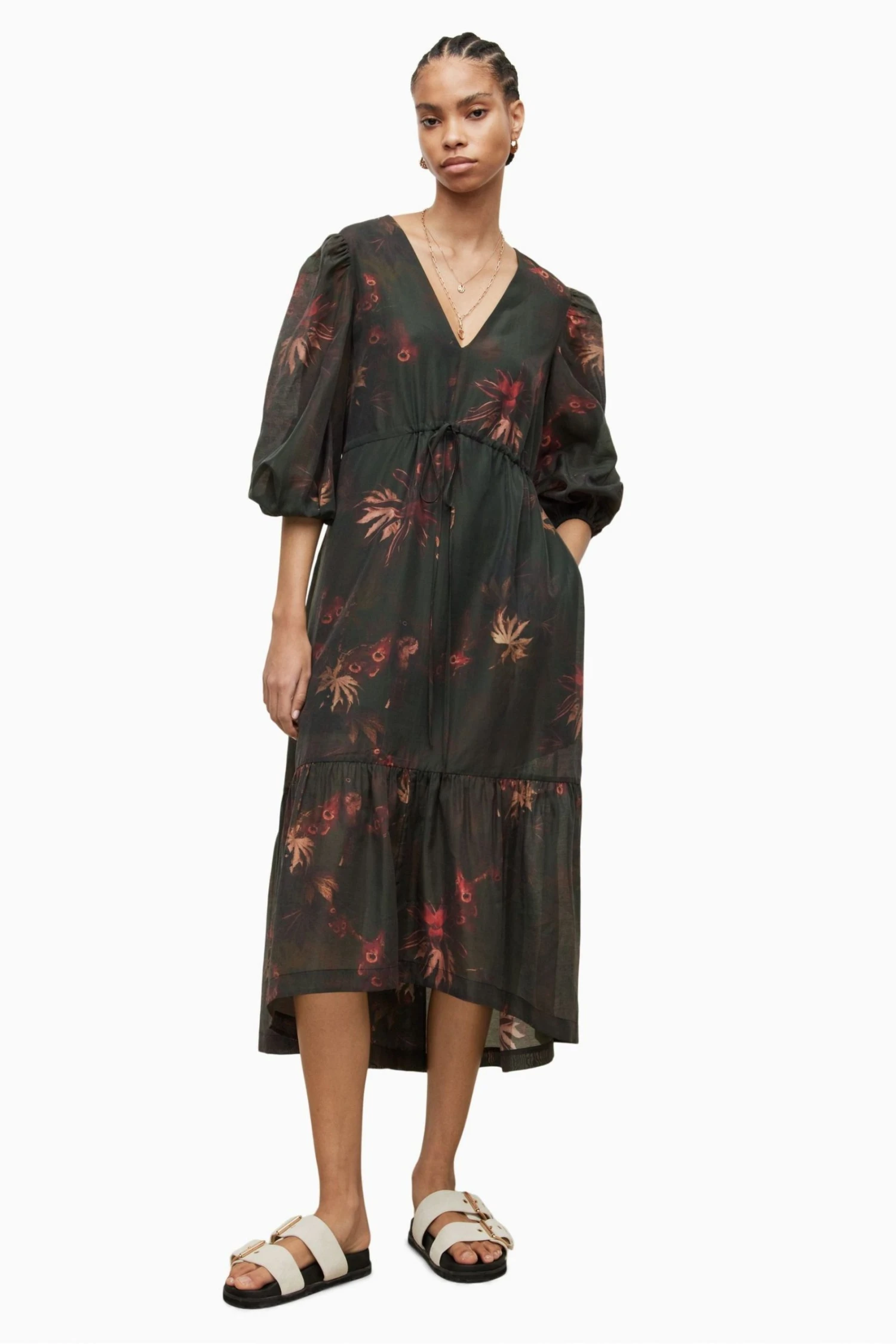 Featuring a V-neck, 3/4th sleeves, long length printed dress, drawcord channel for flexibility, open back detail, tie detail at the back neck, elasticated cuff. tiered volume skirt, shorter shaped front hem, side splits and no pockets.