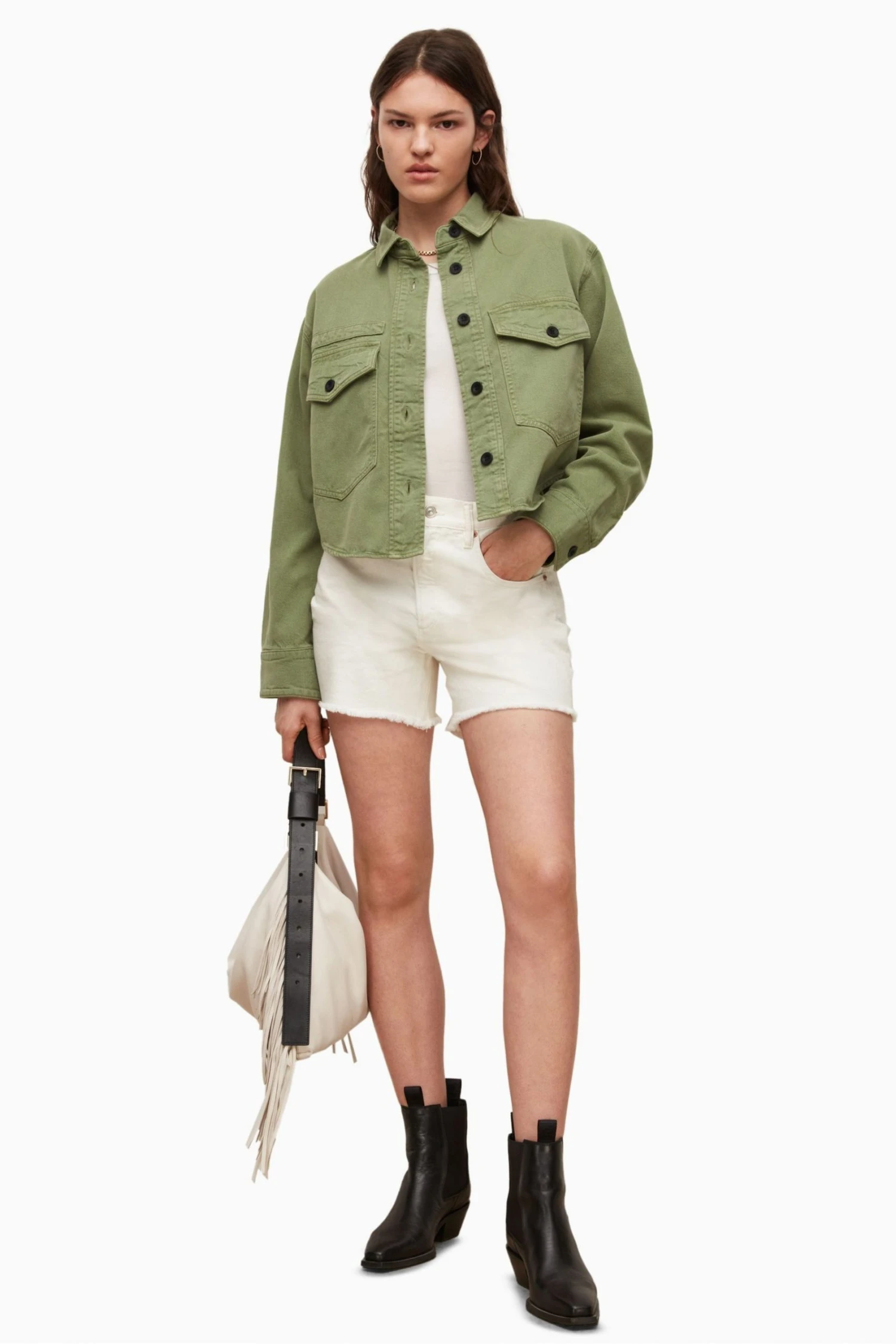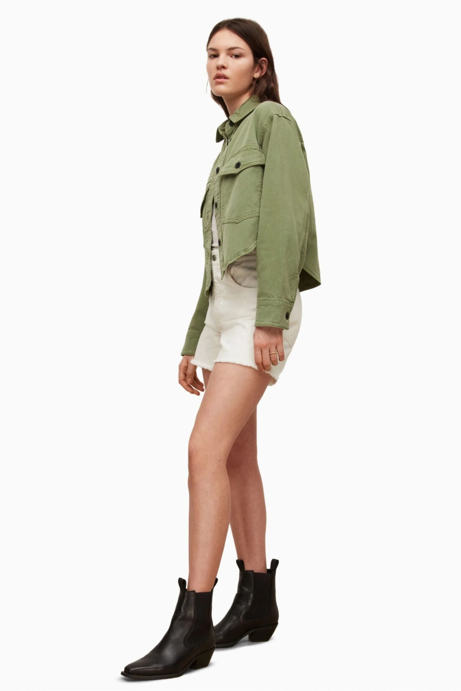 Button closure. Relaxed fit. Short length. Collar. Long sleeve. The Rylan Shirt Jacket has a button closure down the centre front, hs a regular collar and has two utility style pockets with flaps and a button closure.