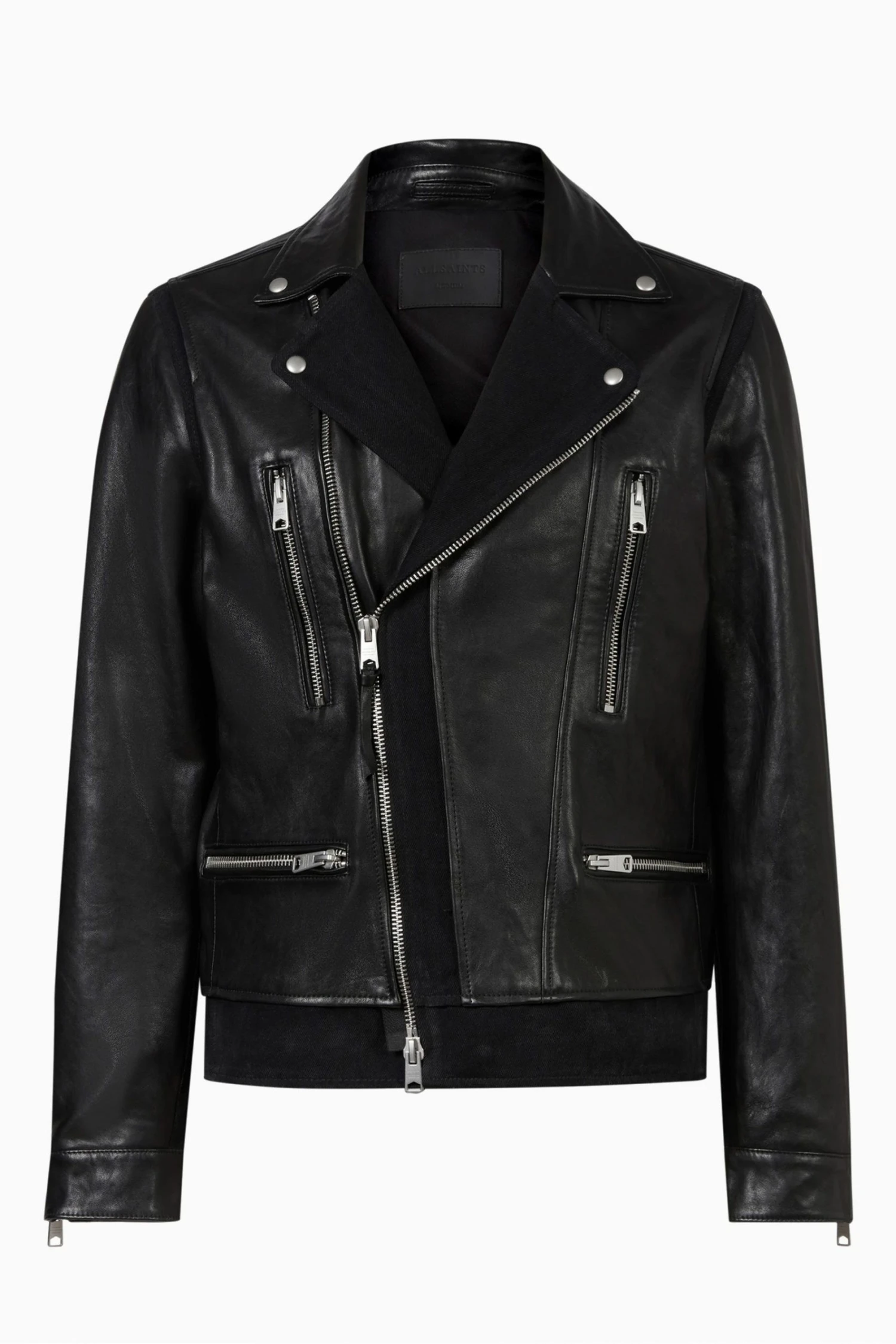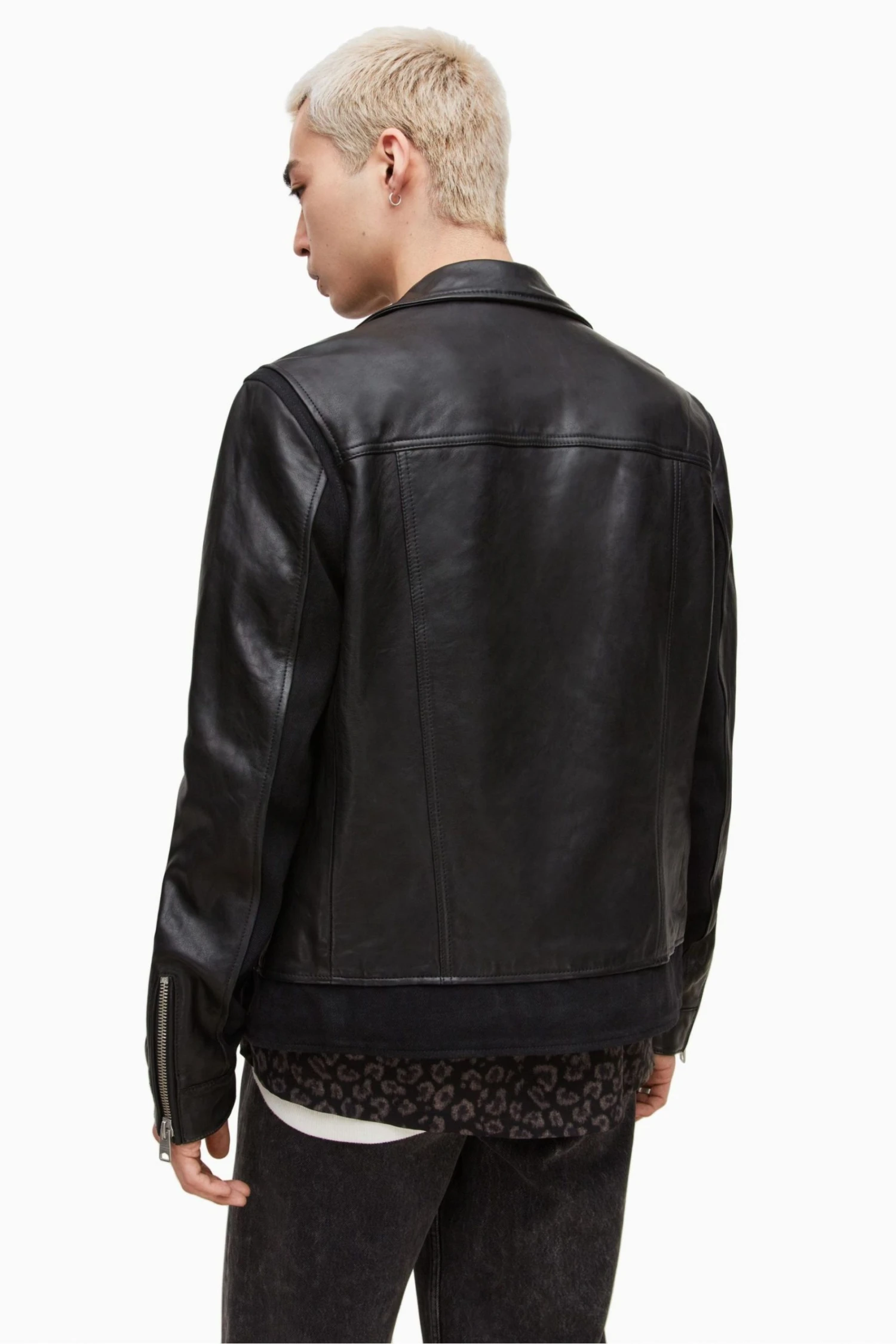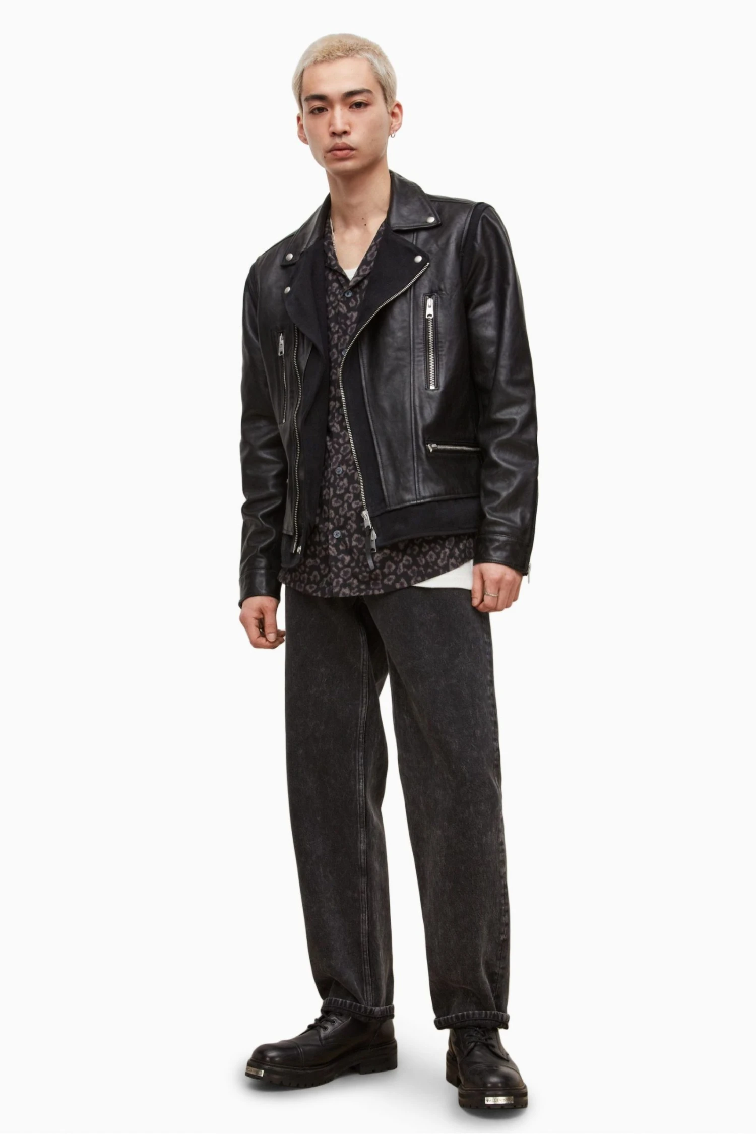 Patchwork biker with a mix of leather and denim, with the lapel, CF panel strip and hem being denim. Featuring classic symmetrical pocket details.
